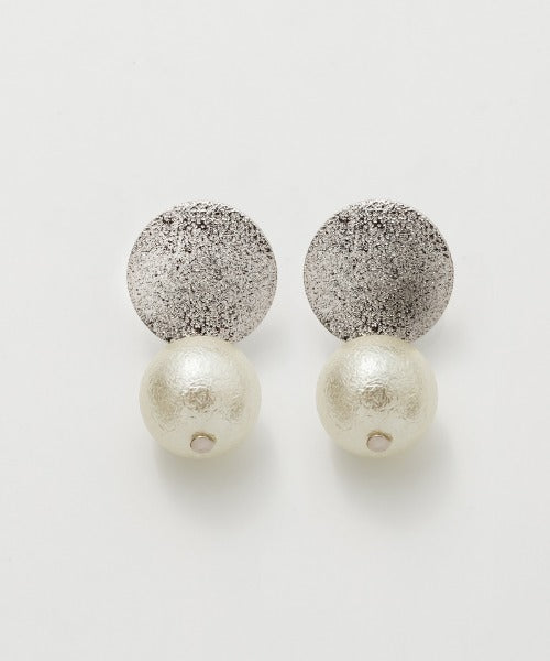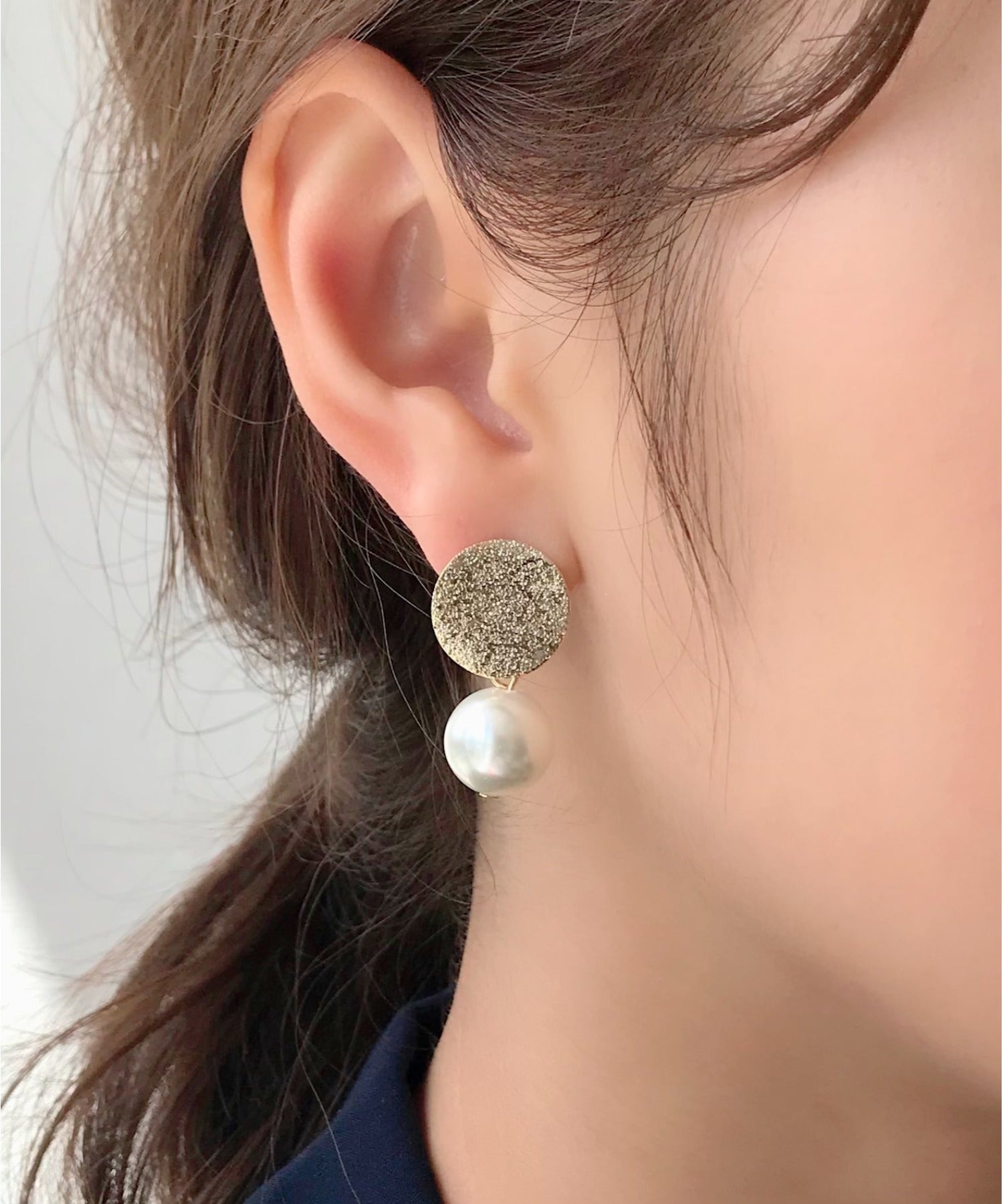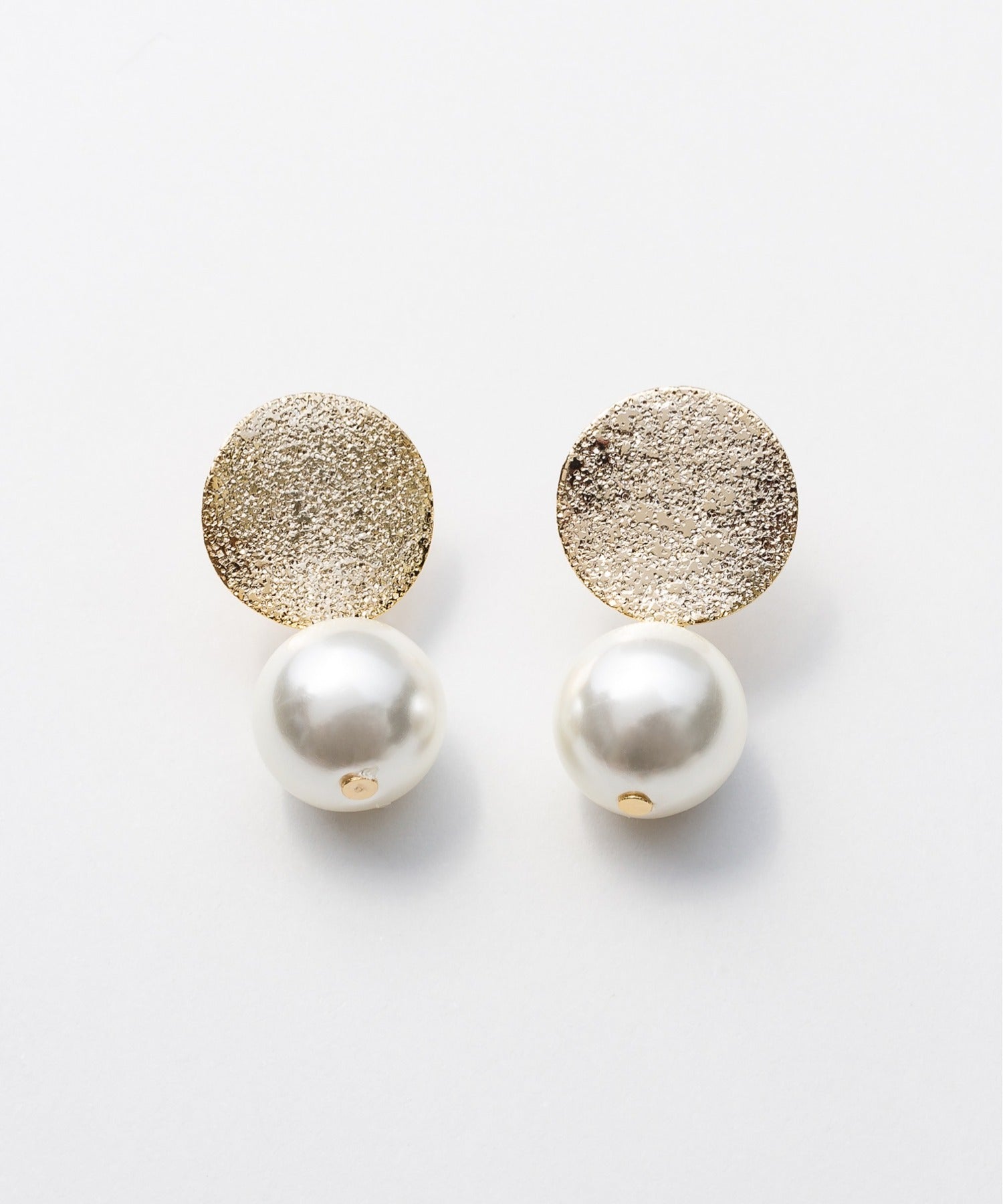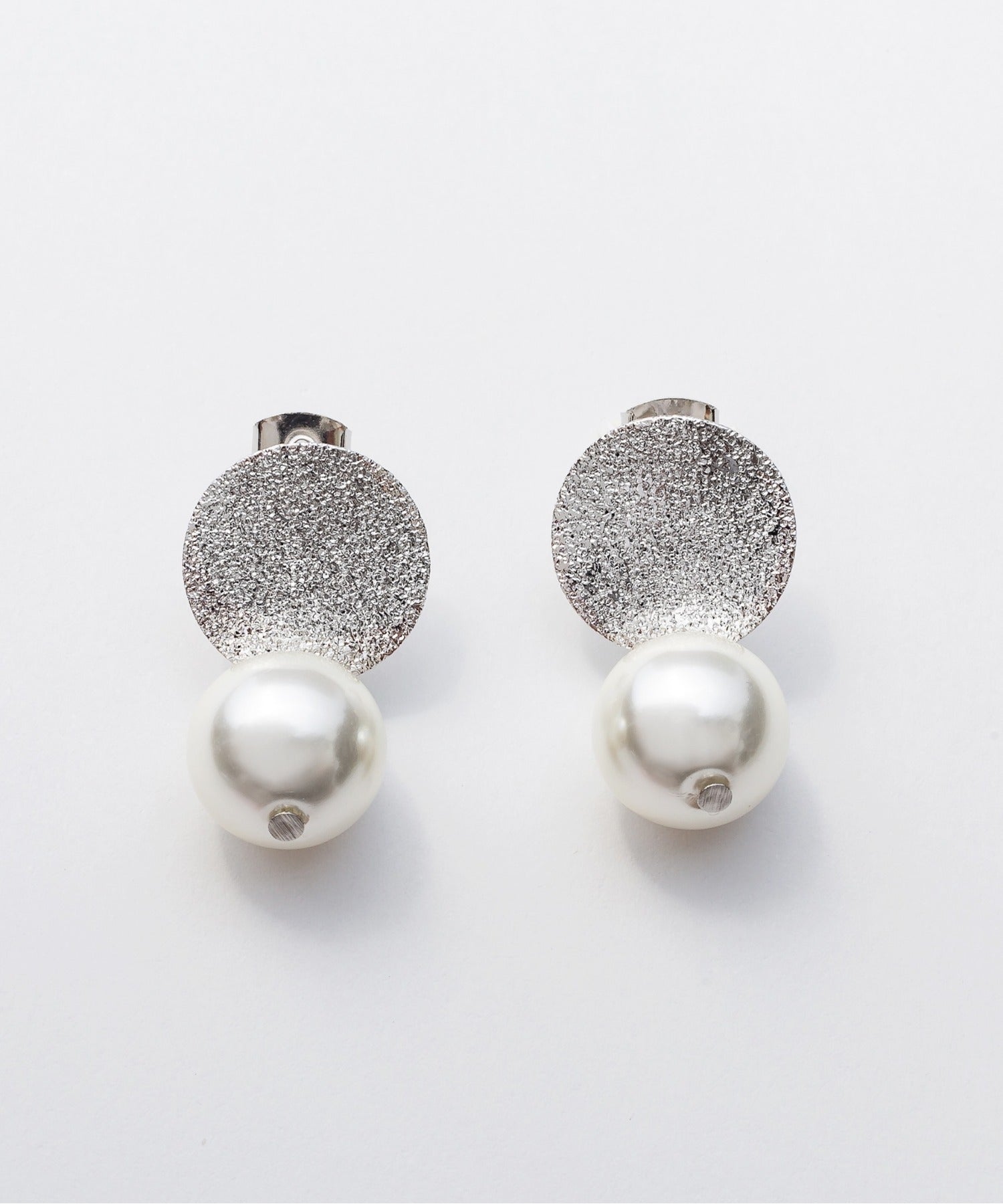優しい手触りの梨地プレートと大粒のホワイトパールをあしらった高級感溢れるピアス。