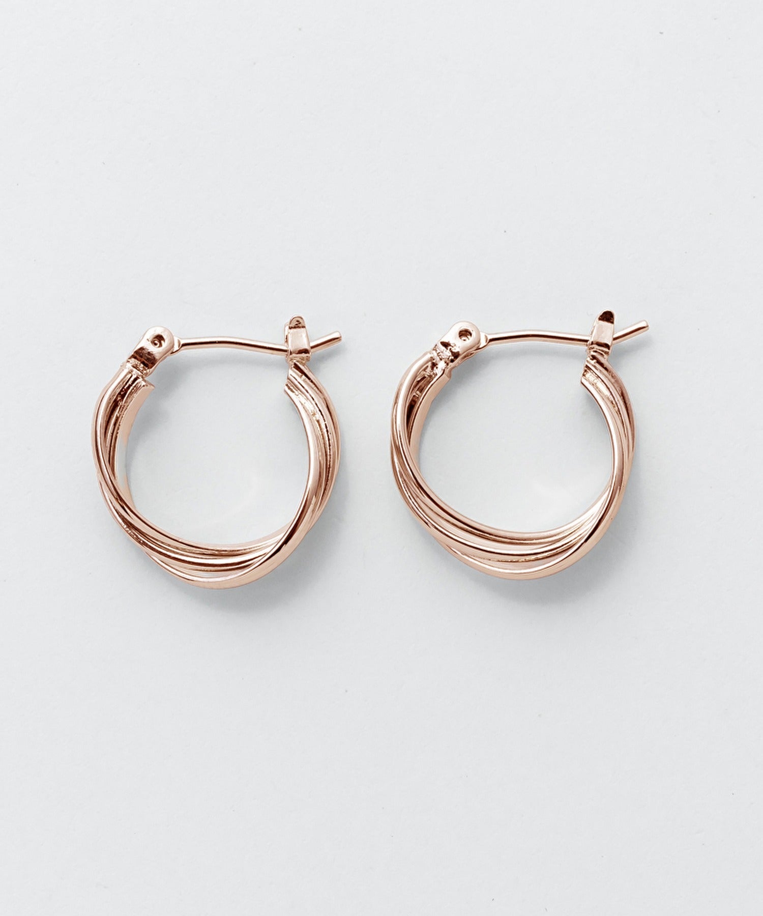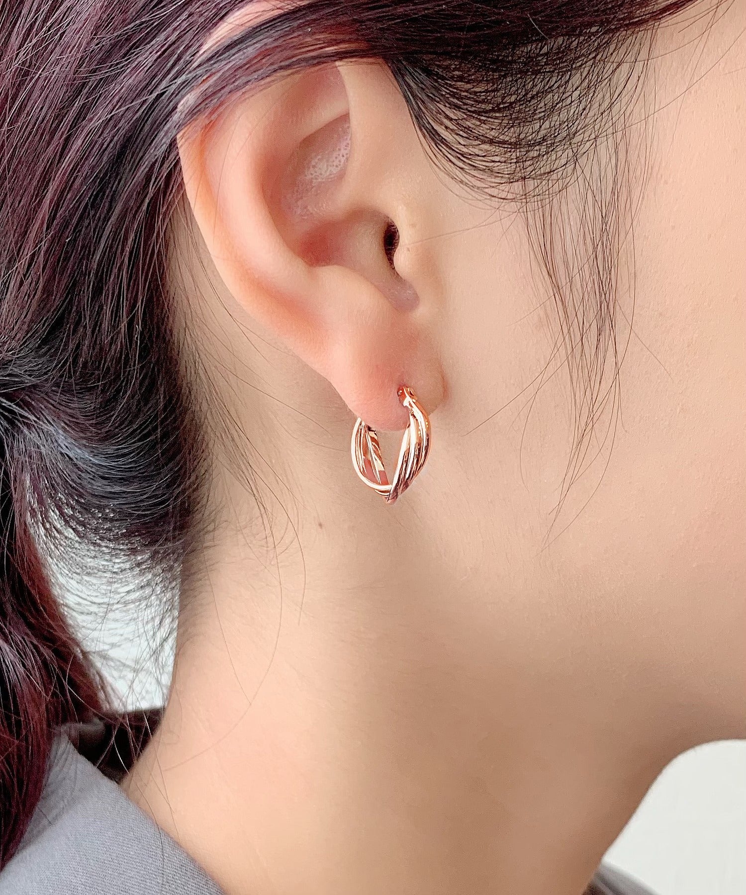 小ぶりなデザインが可愛らしくも大人らしい印象のミニねじれ3連フープピアス。
