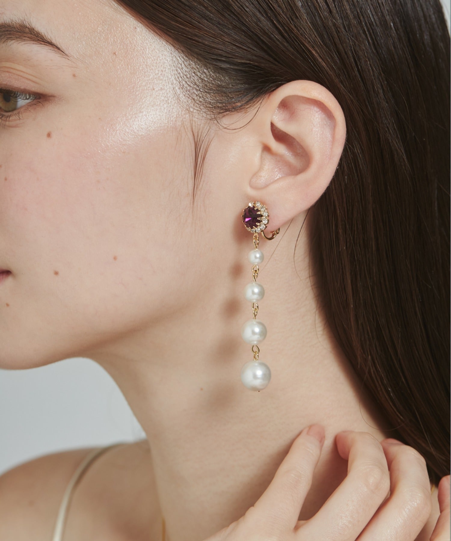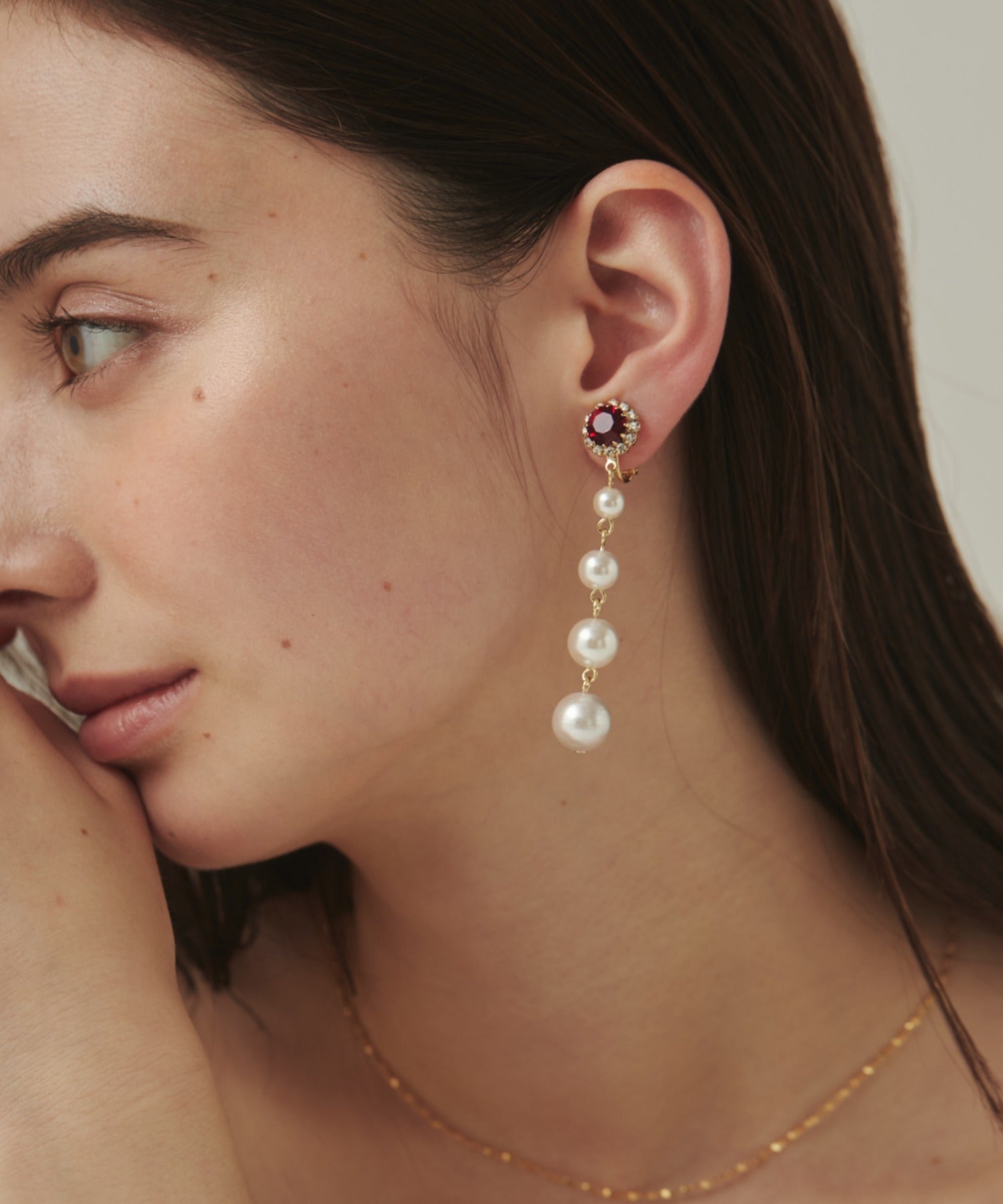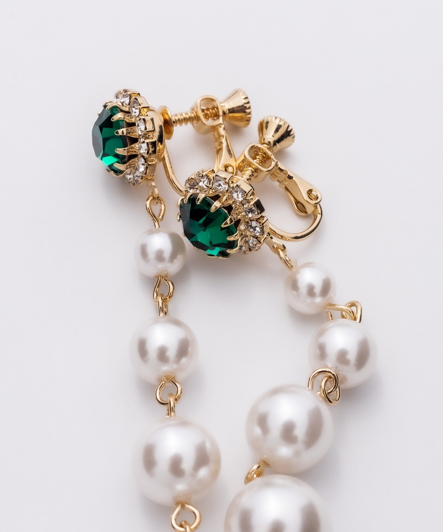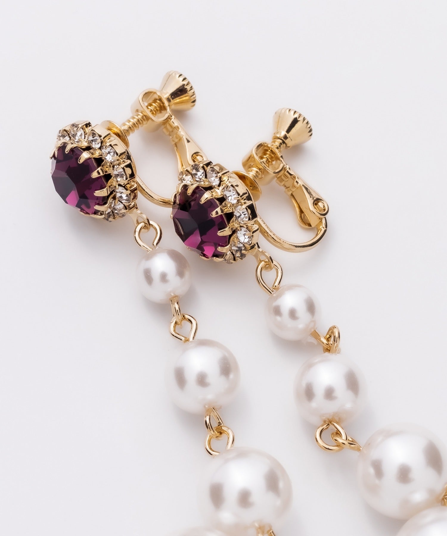 大ぶりのカラービジューとパールをあしらったデザインイヤリング。