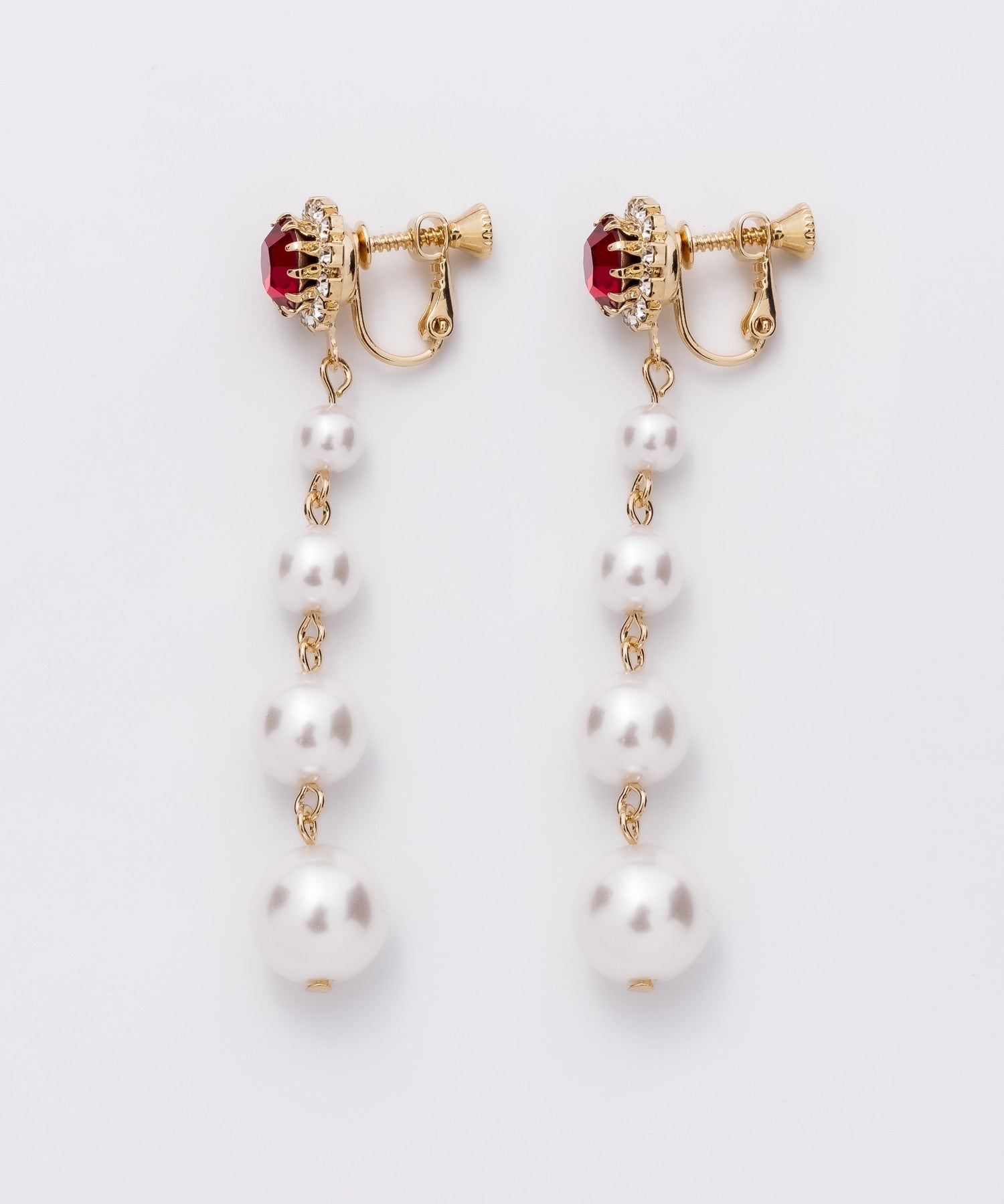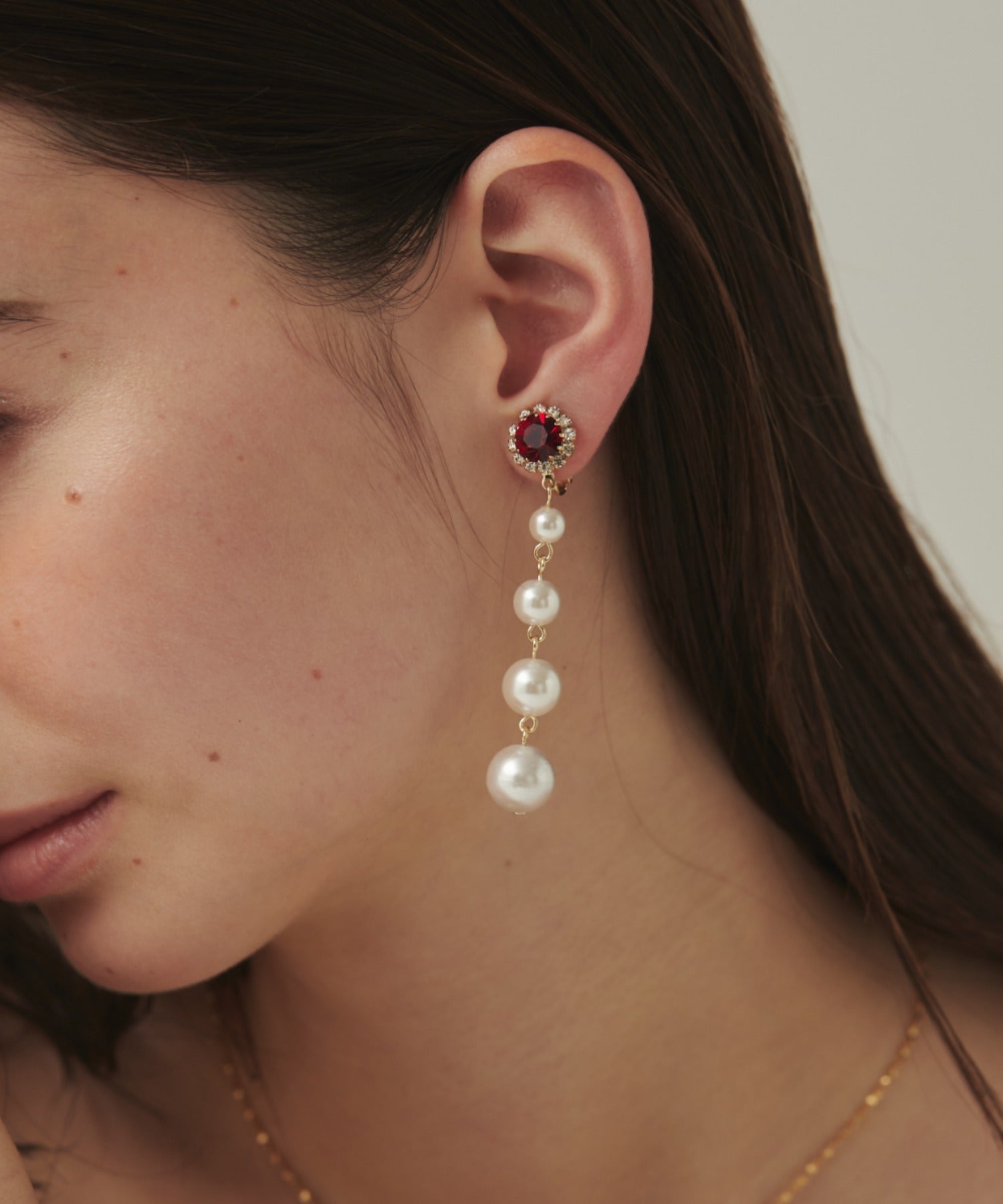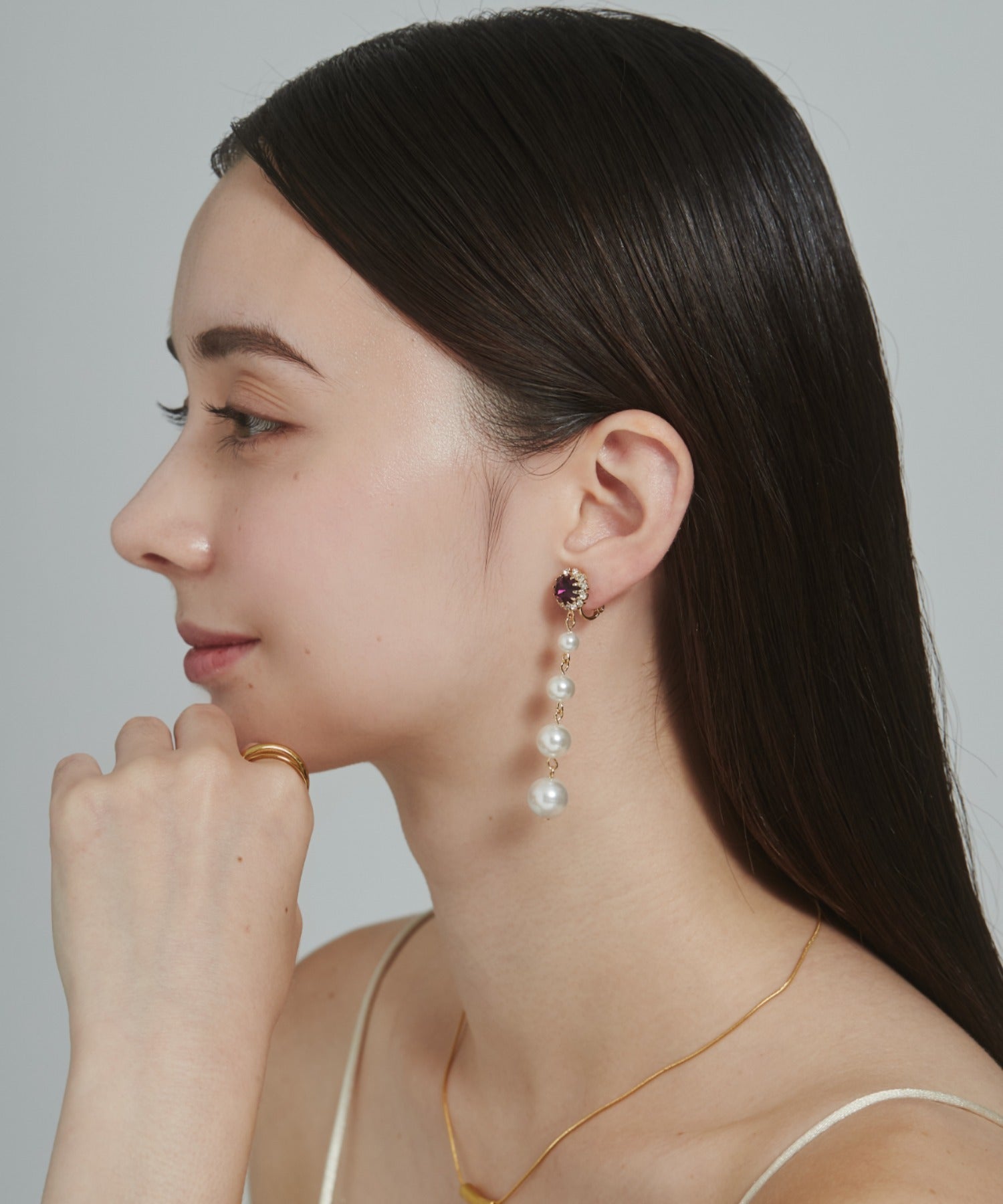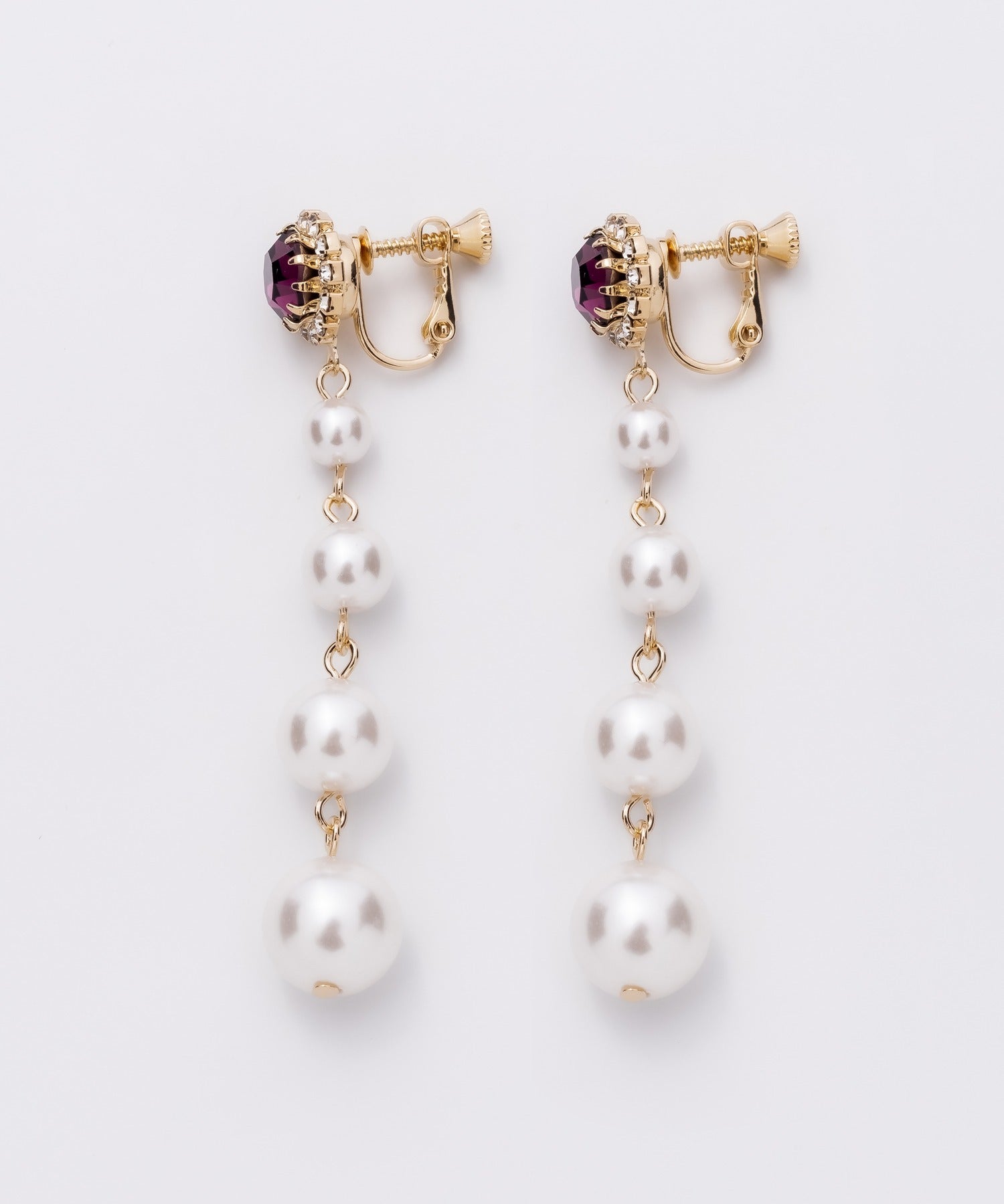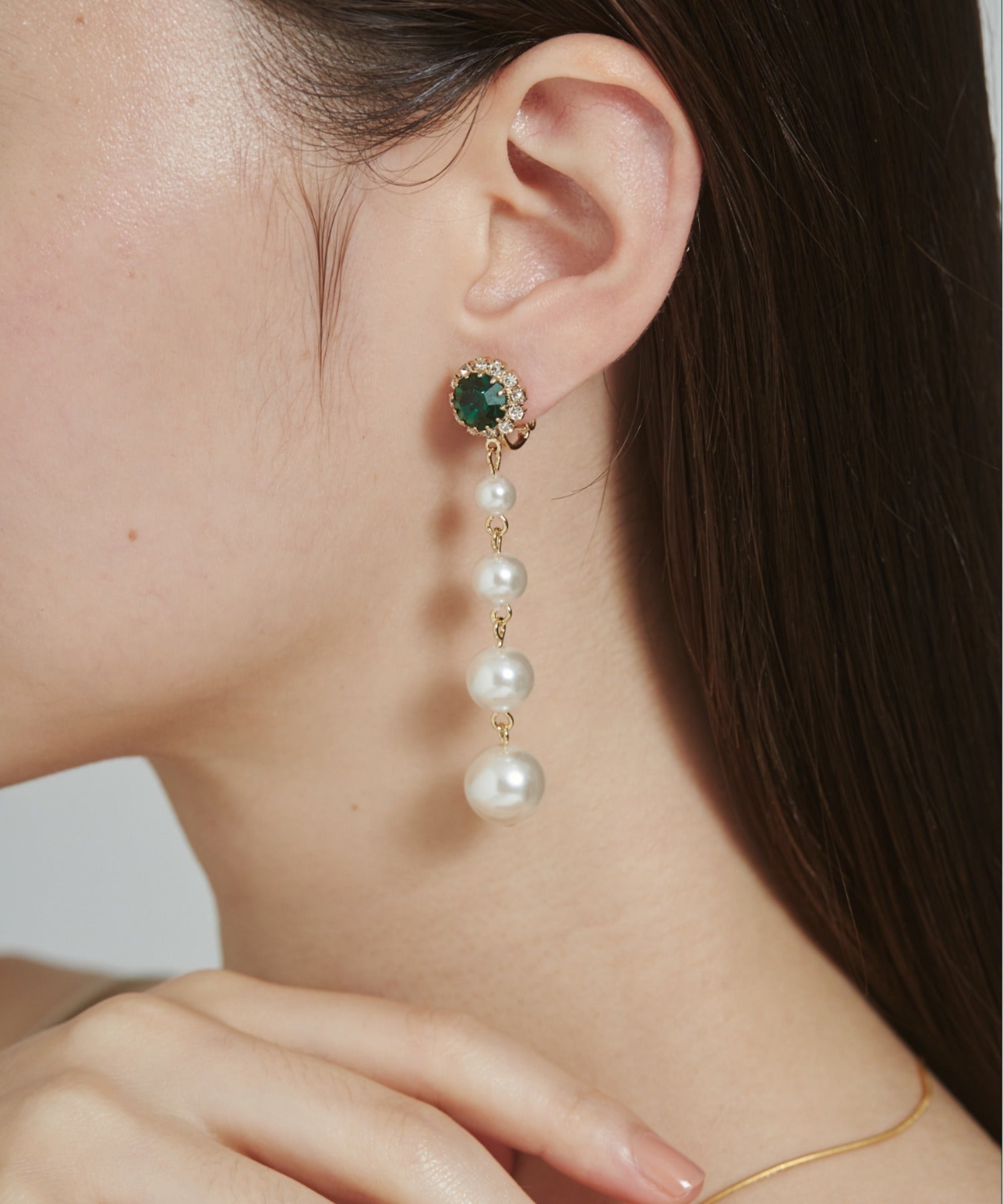 大ぶりのカラービジューとパールをあしらったデザインイヤリング。