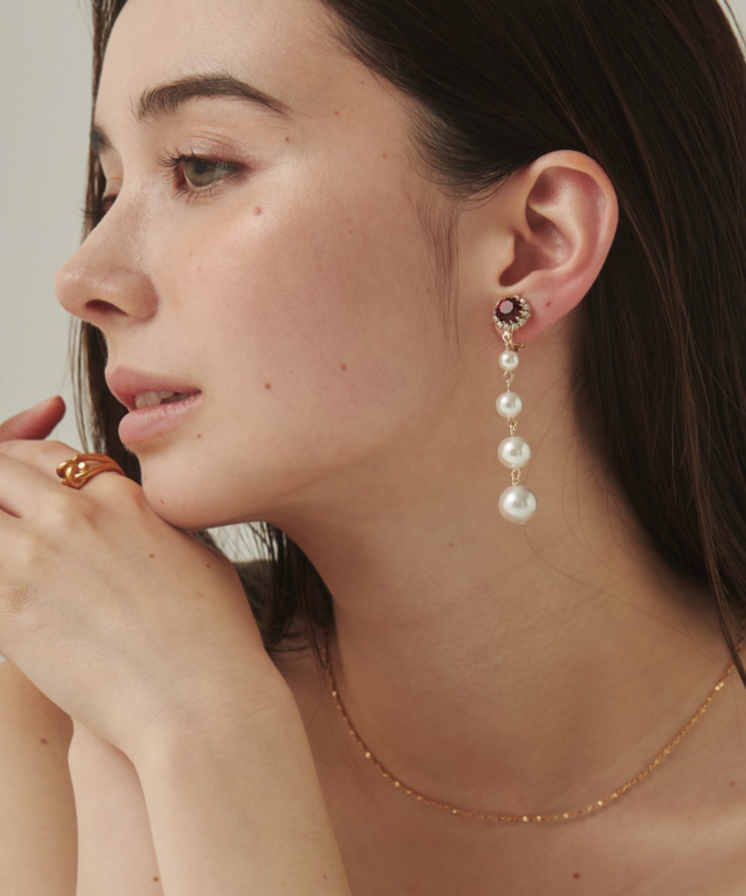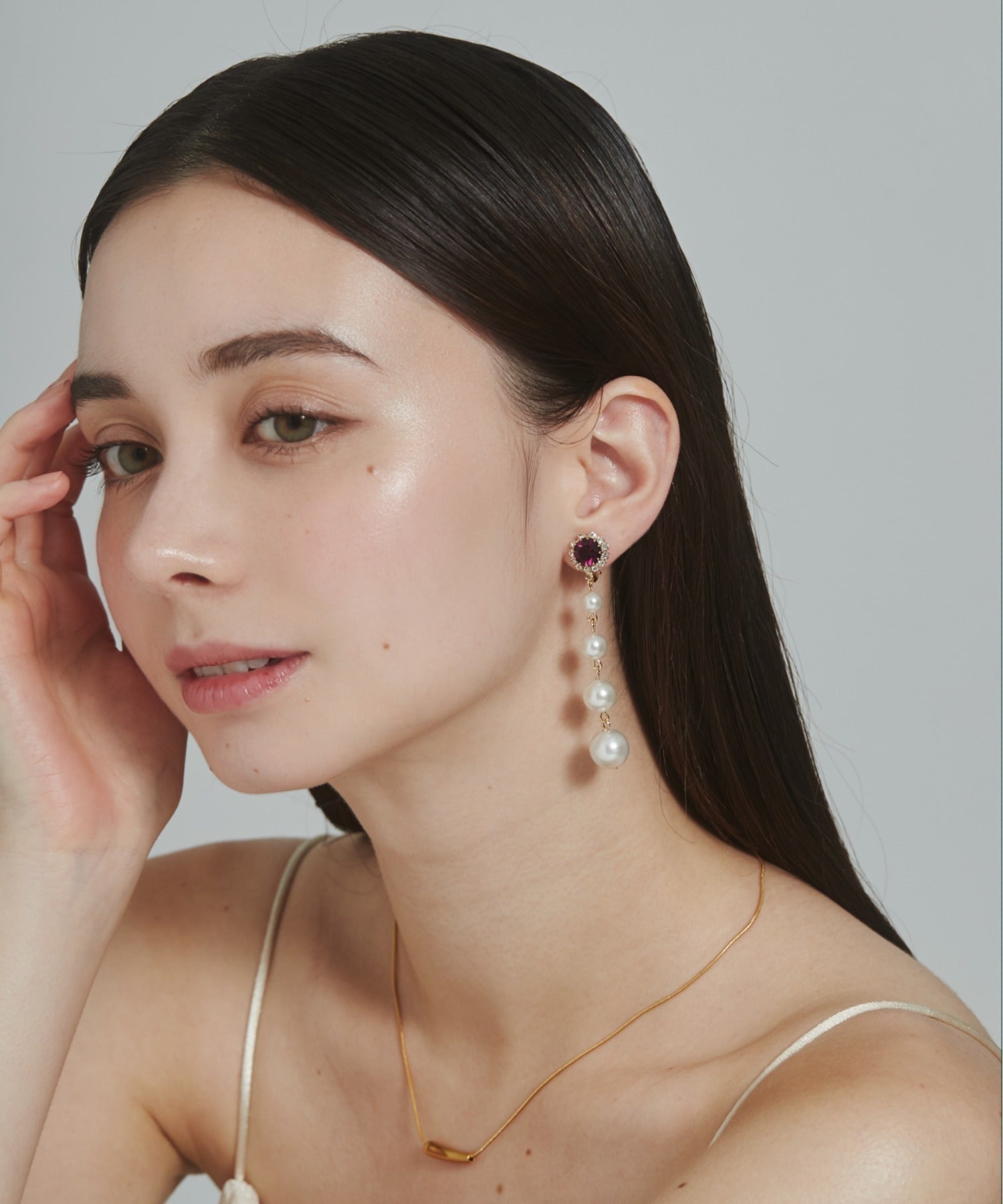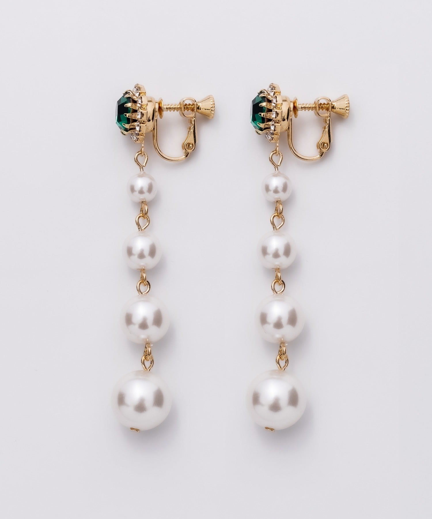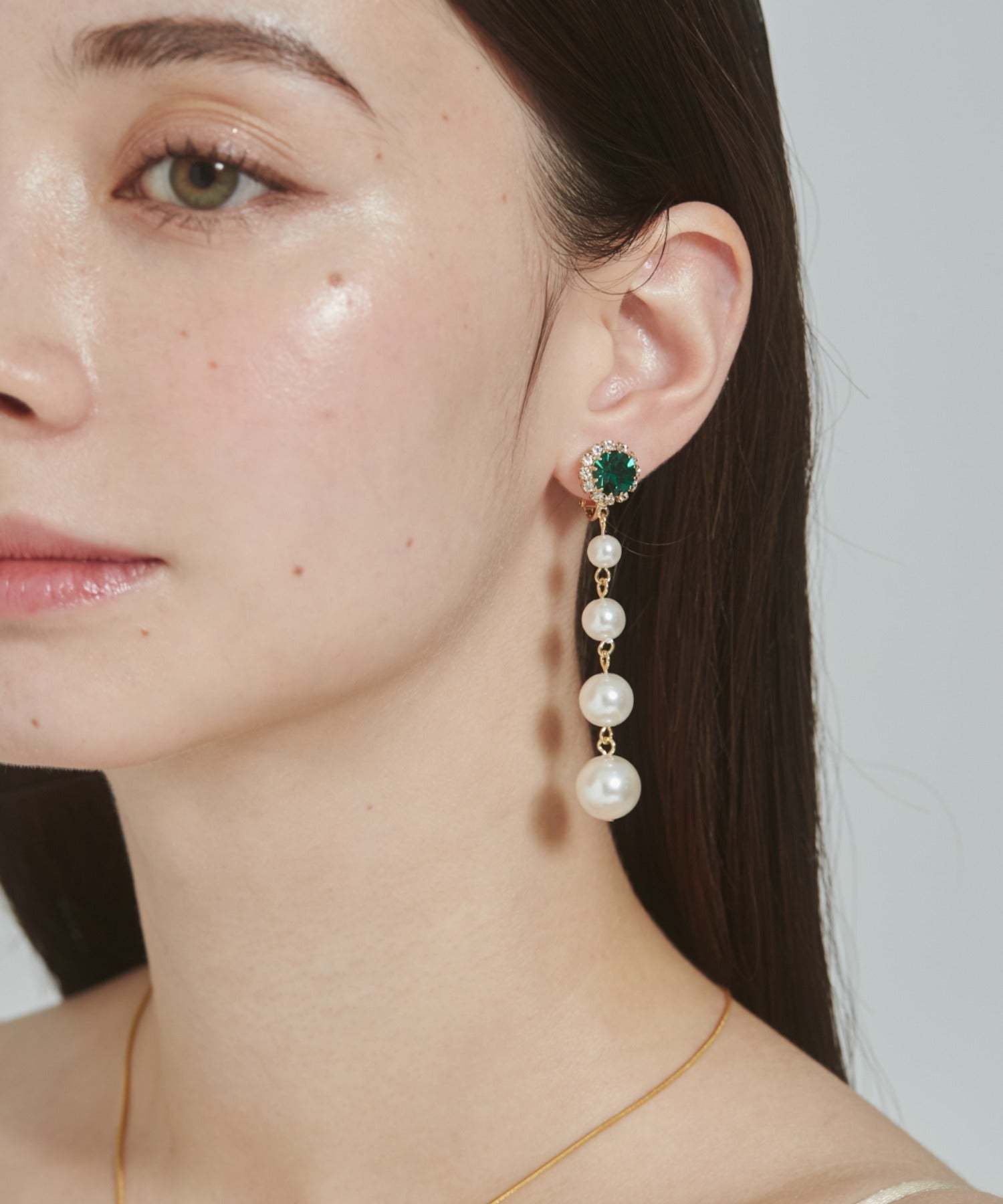 大ぶりのカラービジューとパールをあしらったデザインイヤリング。