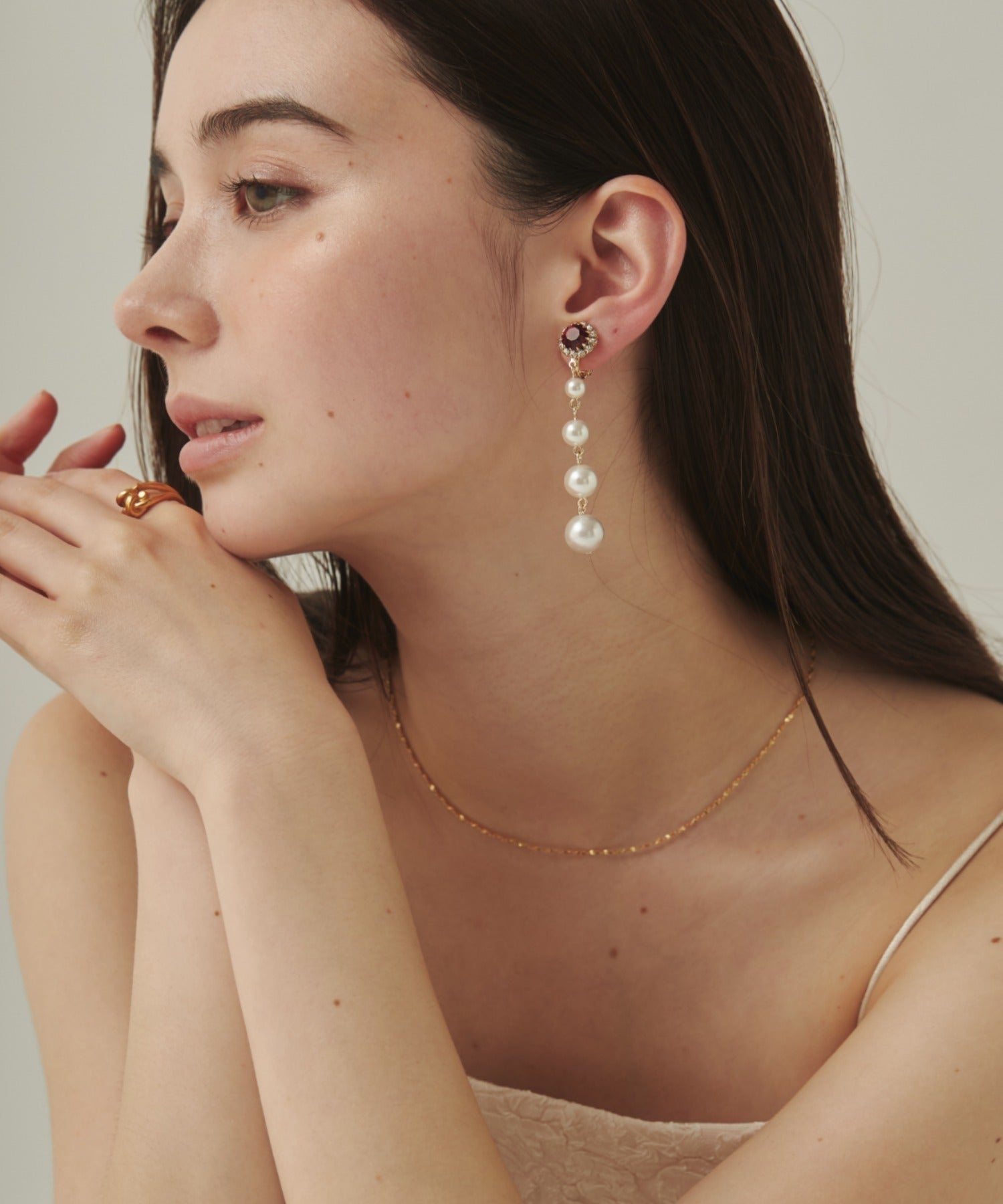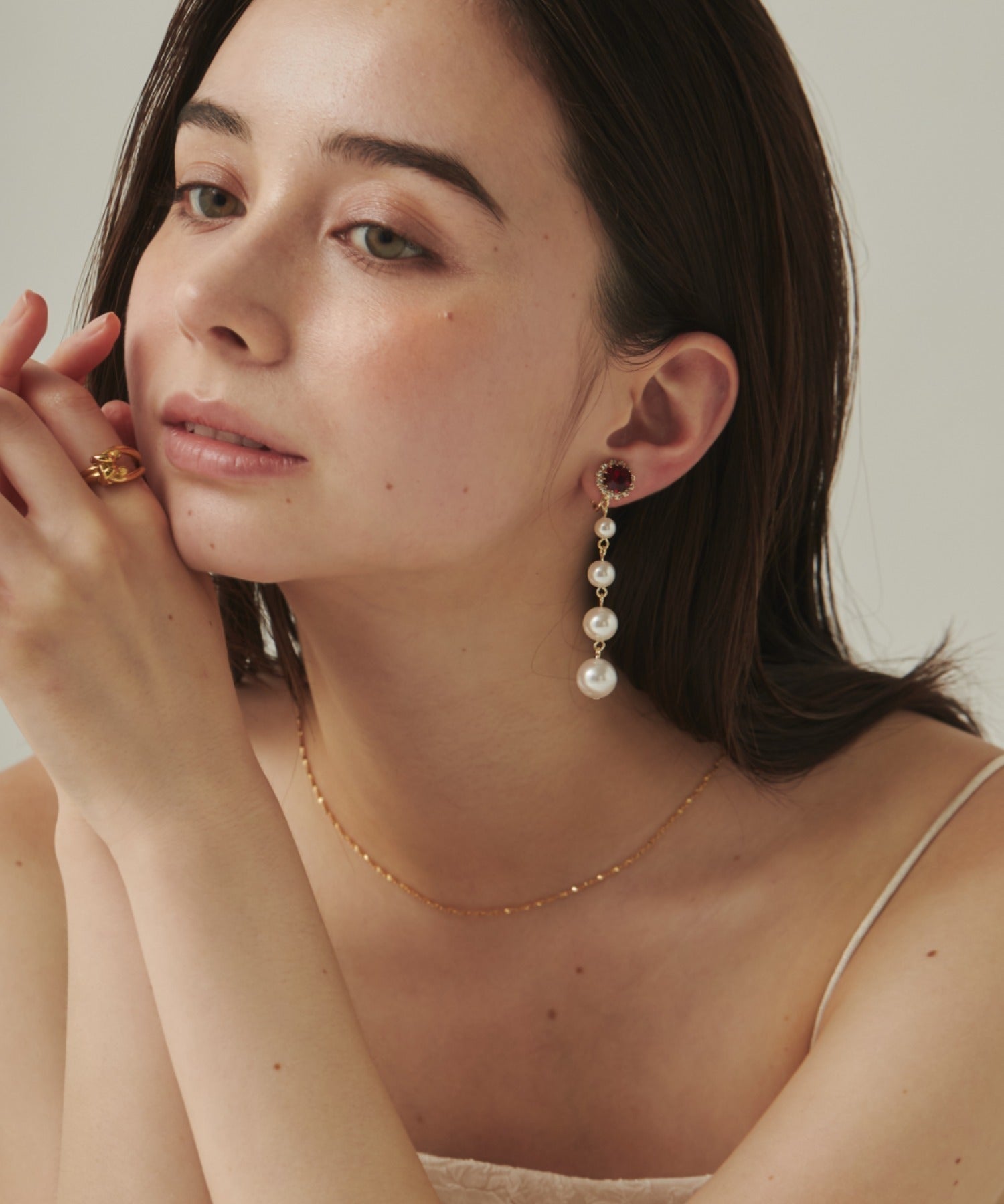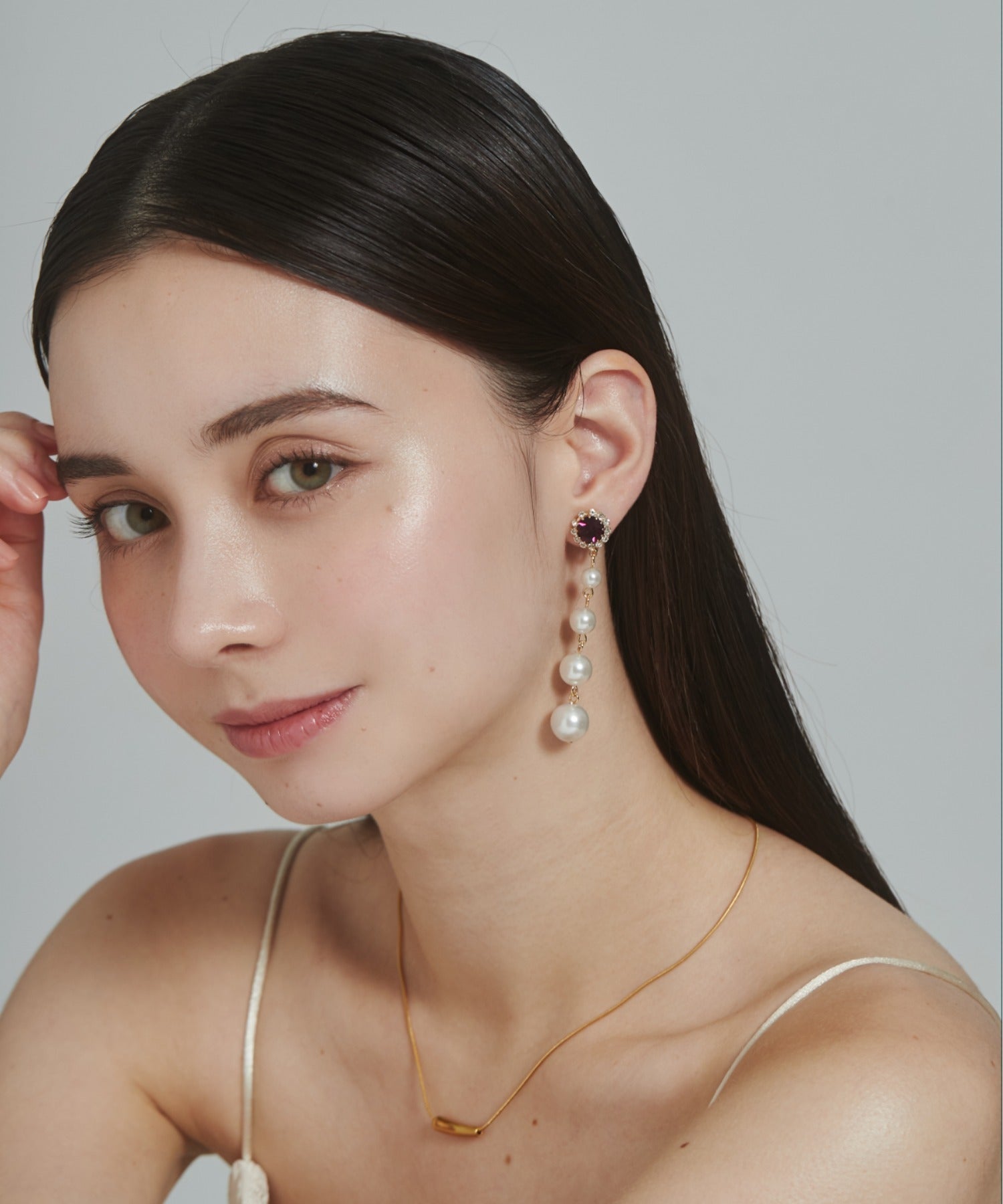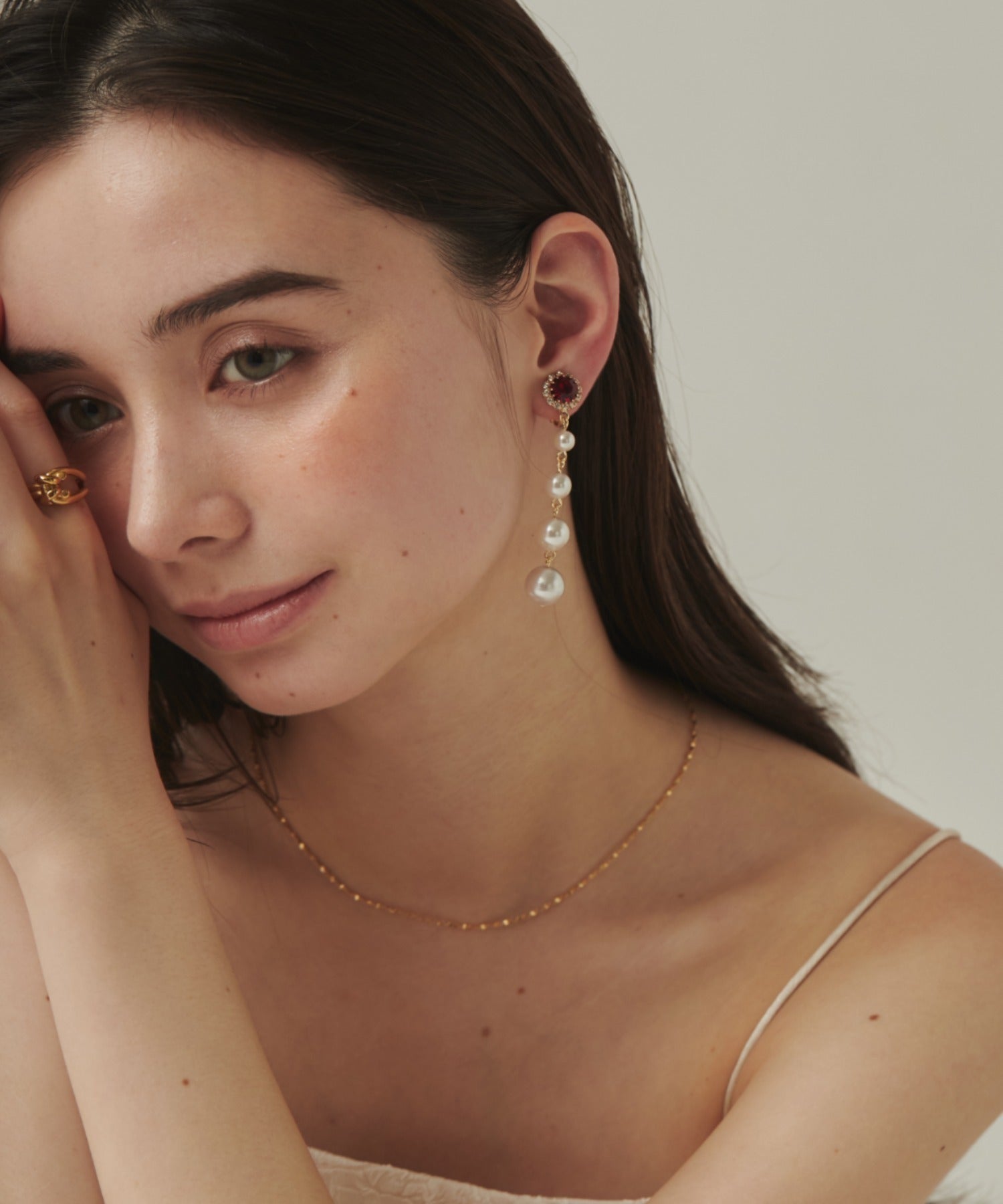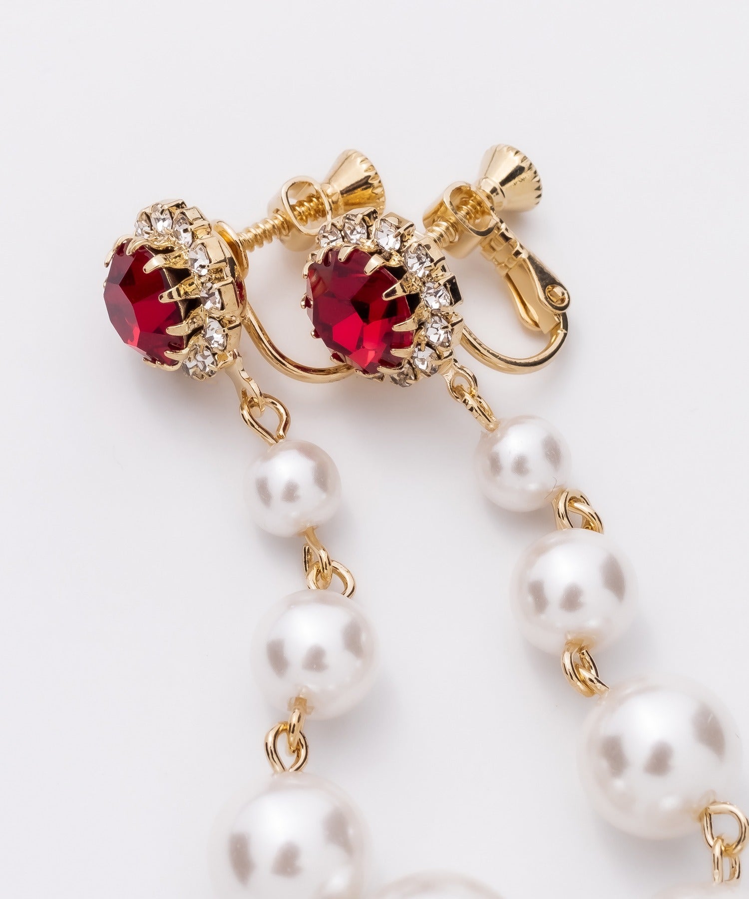 大ぶりのカラービジューとパールをあしらったデザインイヤリング。