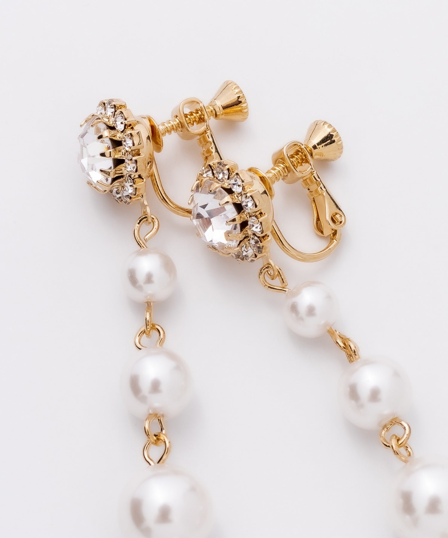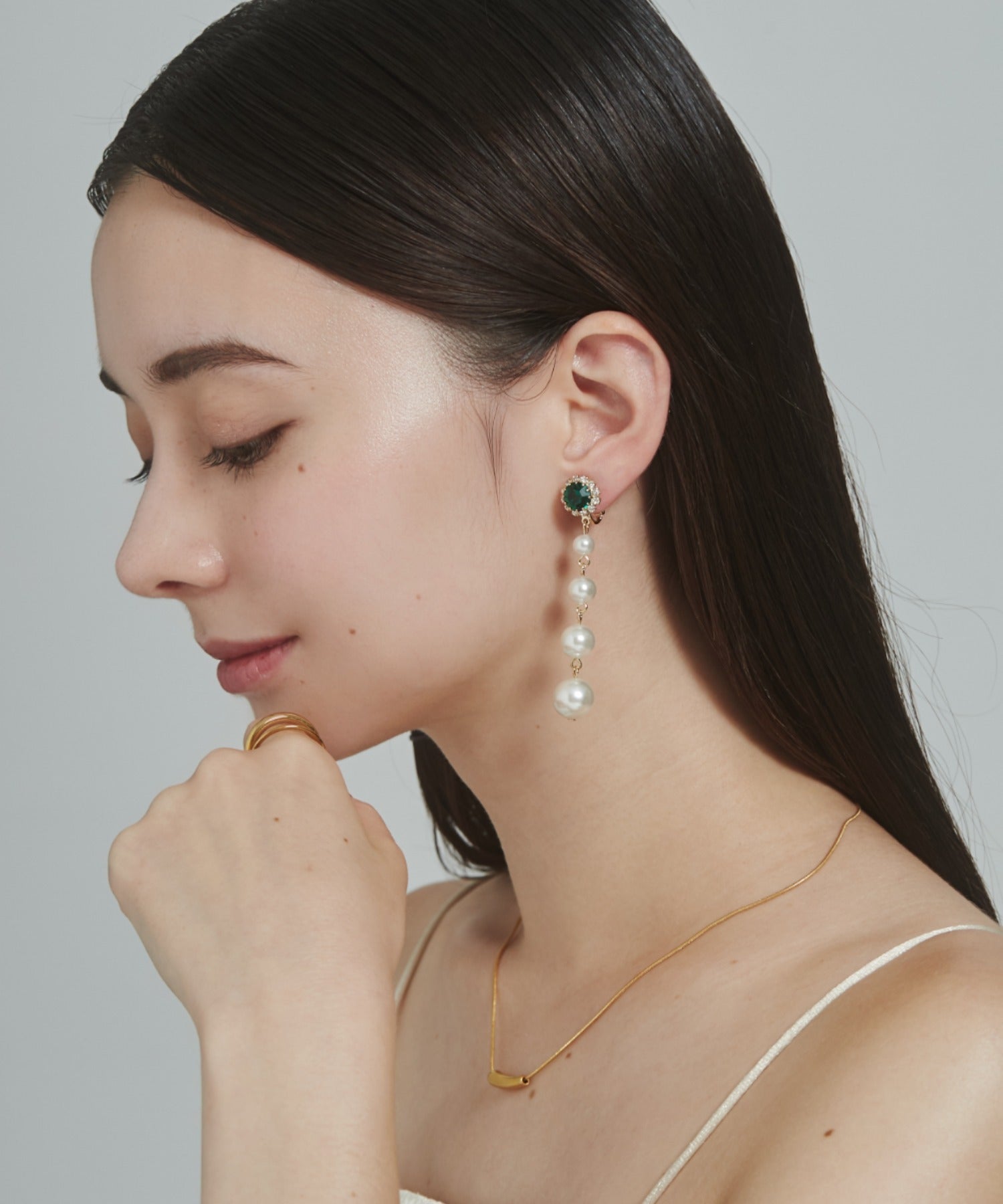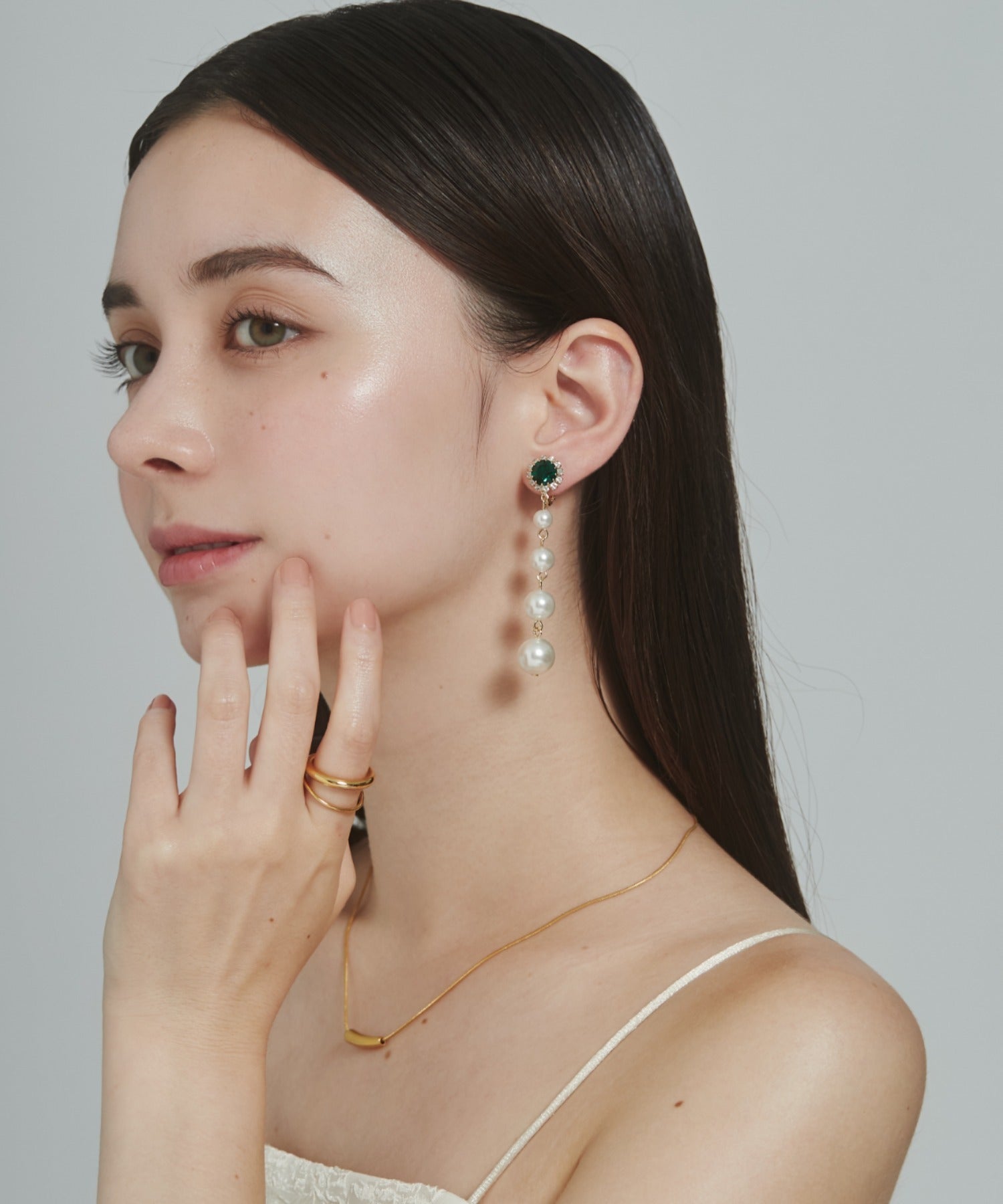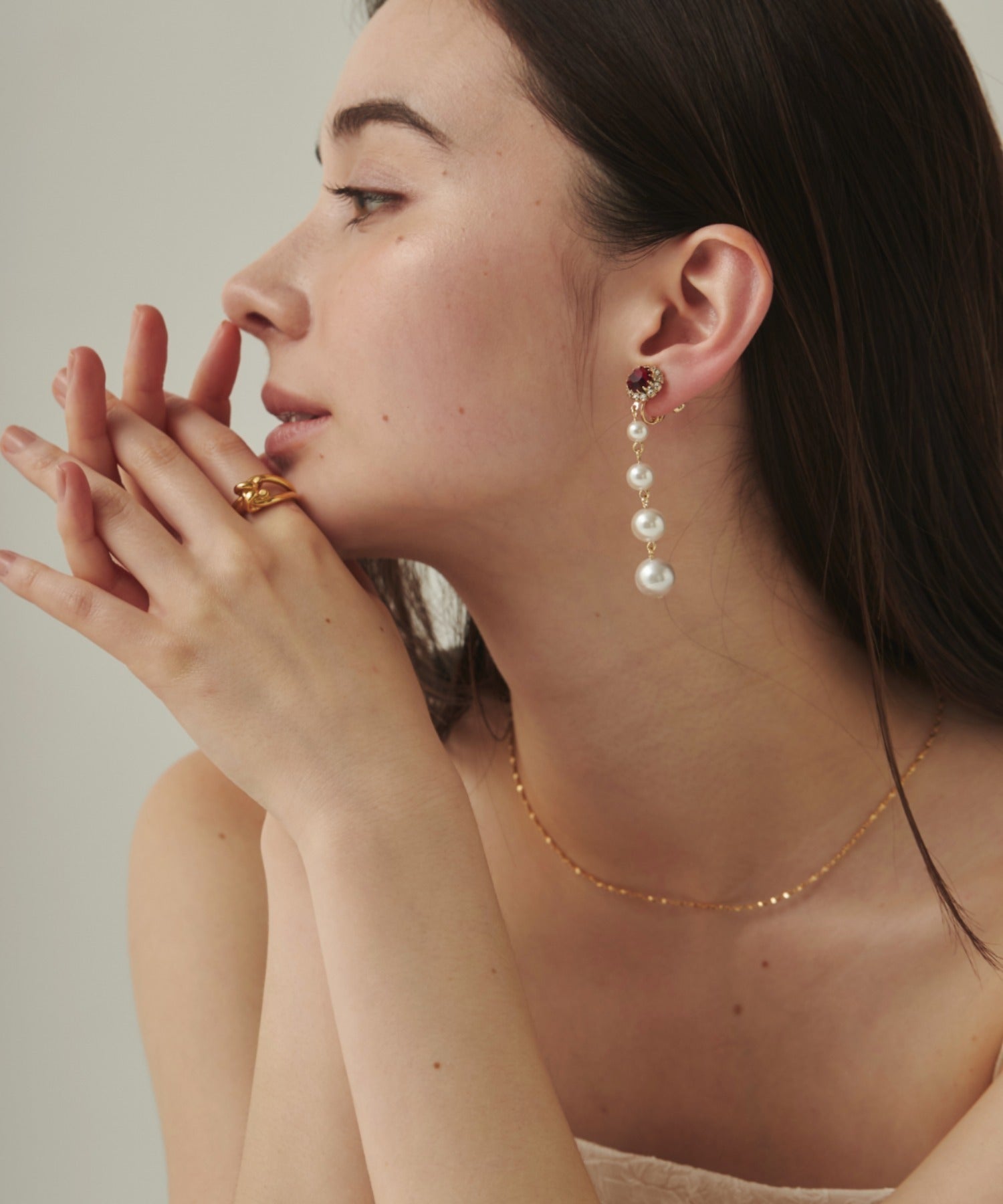 大ぶりのカラービジューとパールをあしらったデザインイヤリング。
