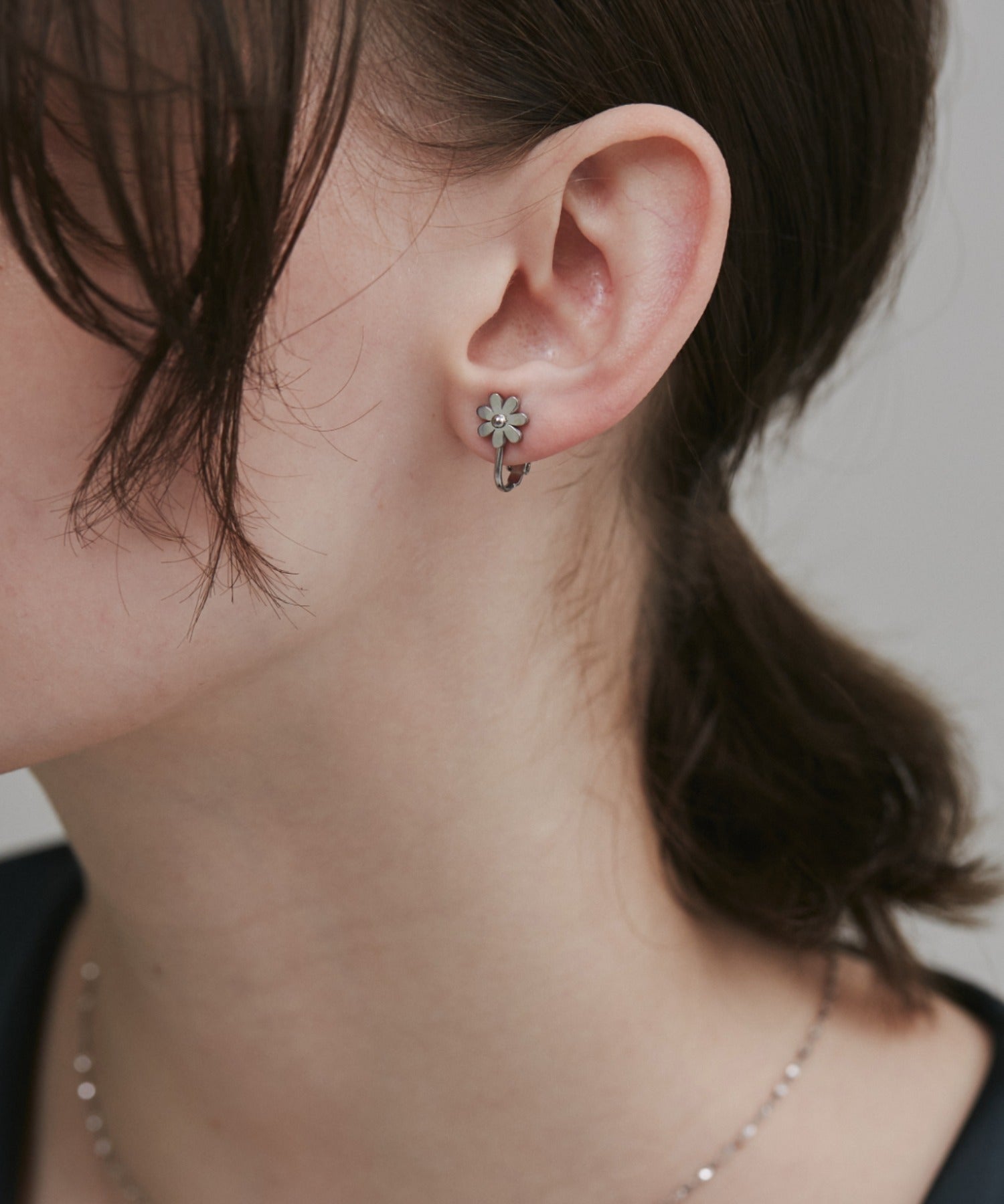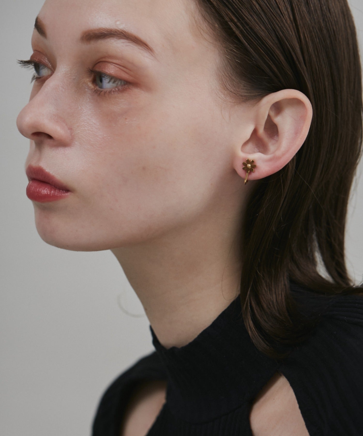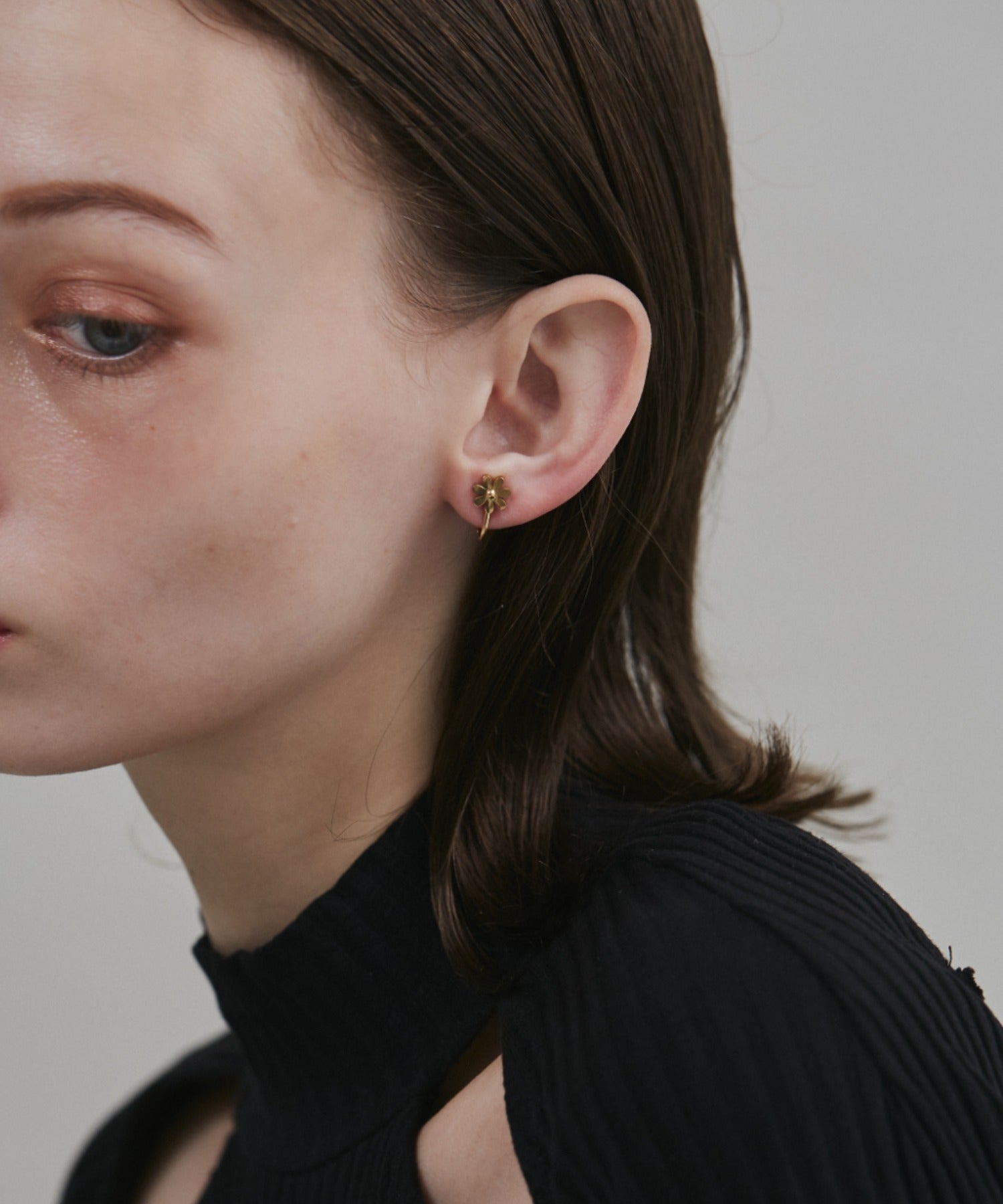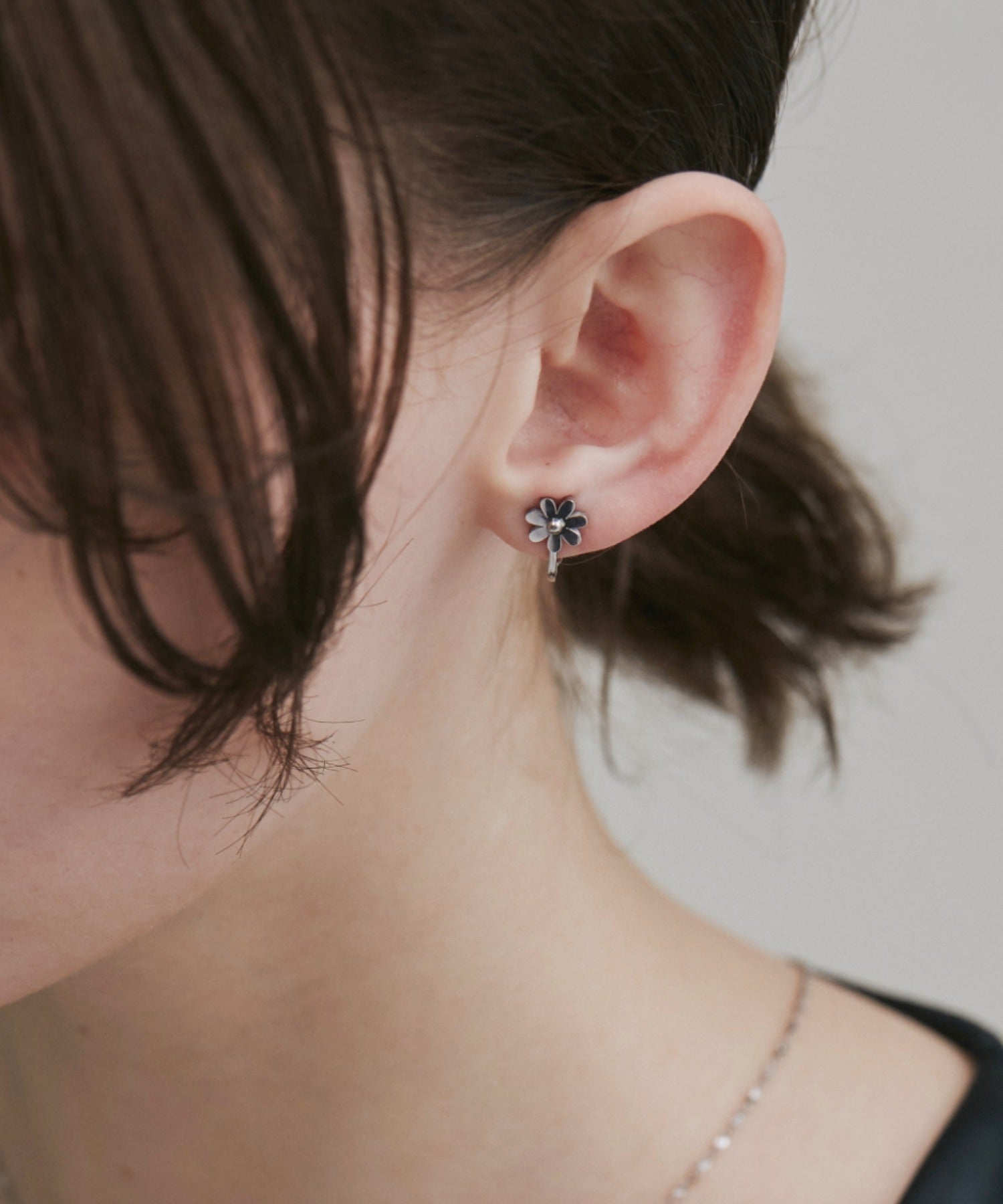 シンプルながらも付けたときのバランスにこだわったフラワーモチーフイヤリング。