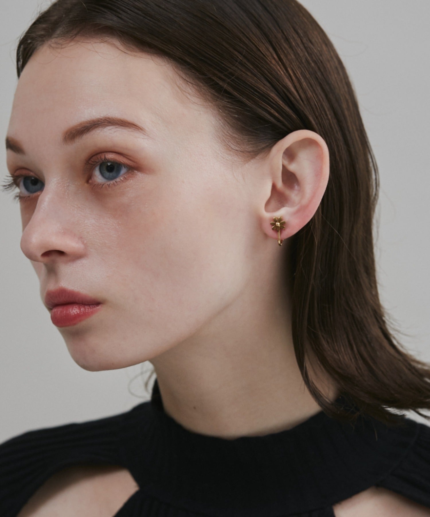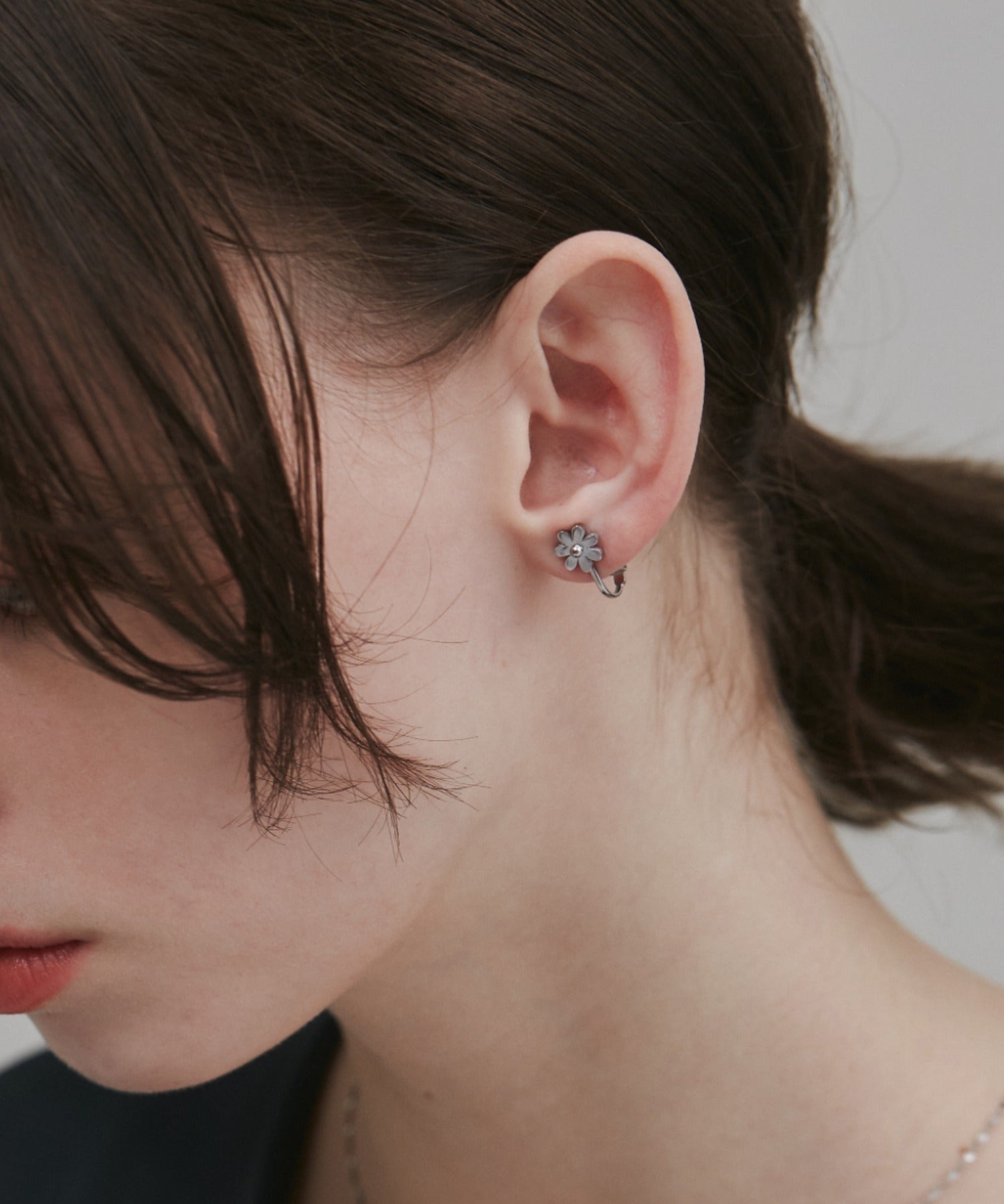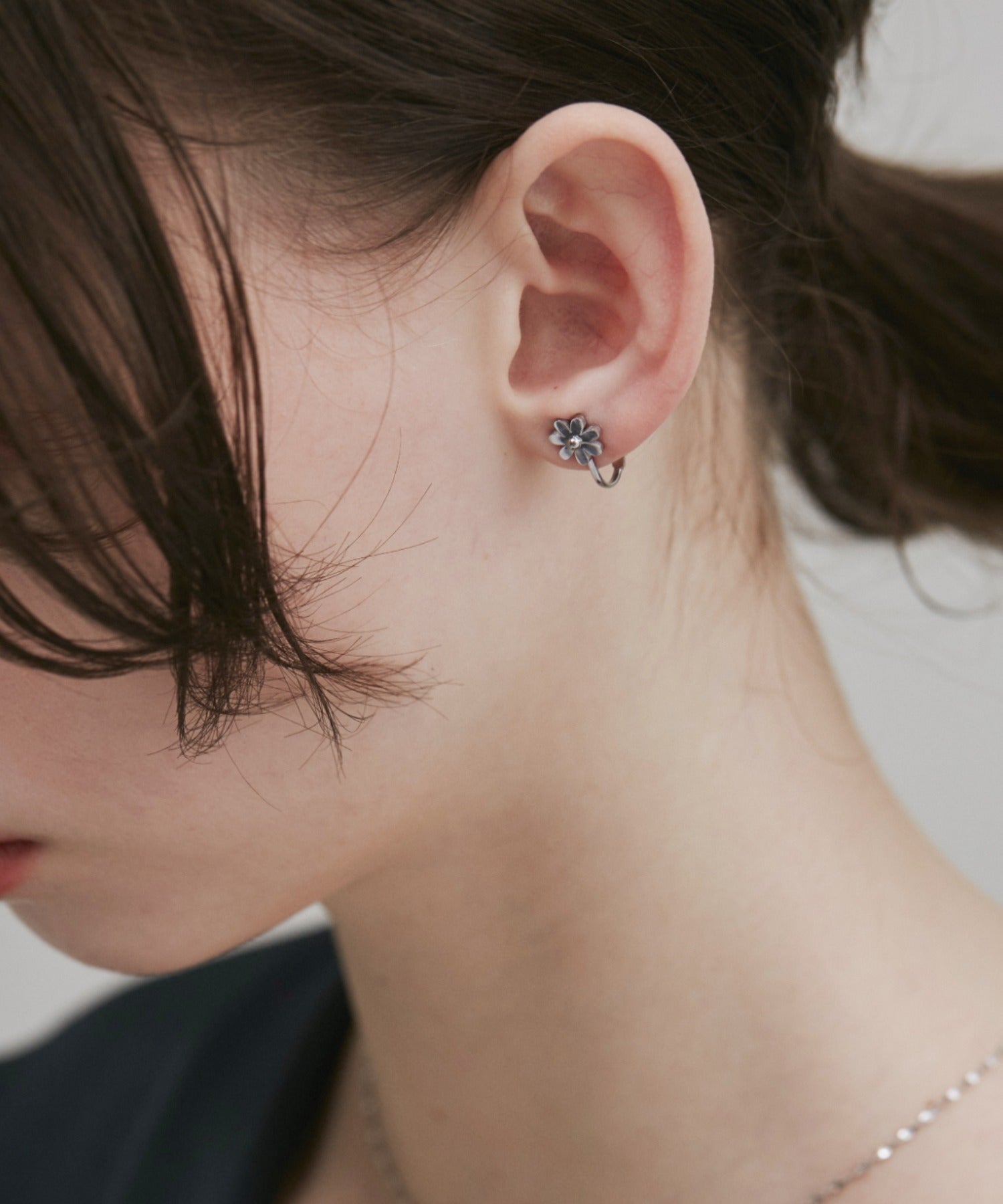 シンプルながらも付けたときのバランスにこだわったフラワーモチーフイヤリング。