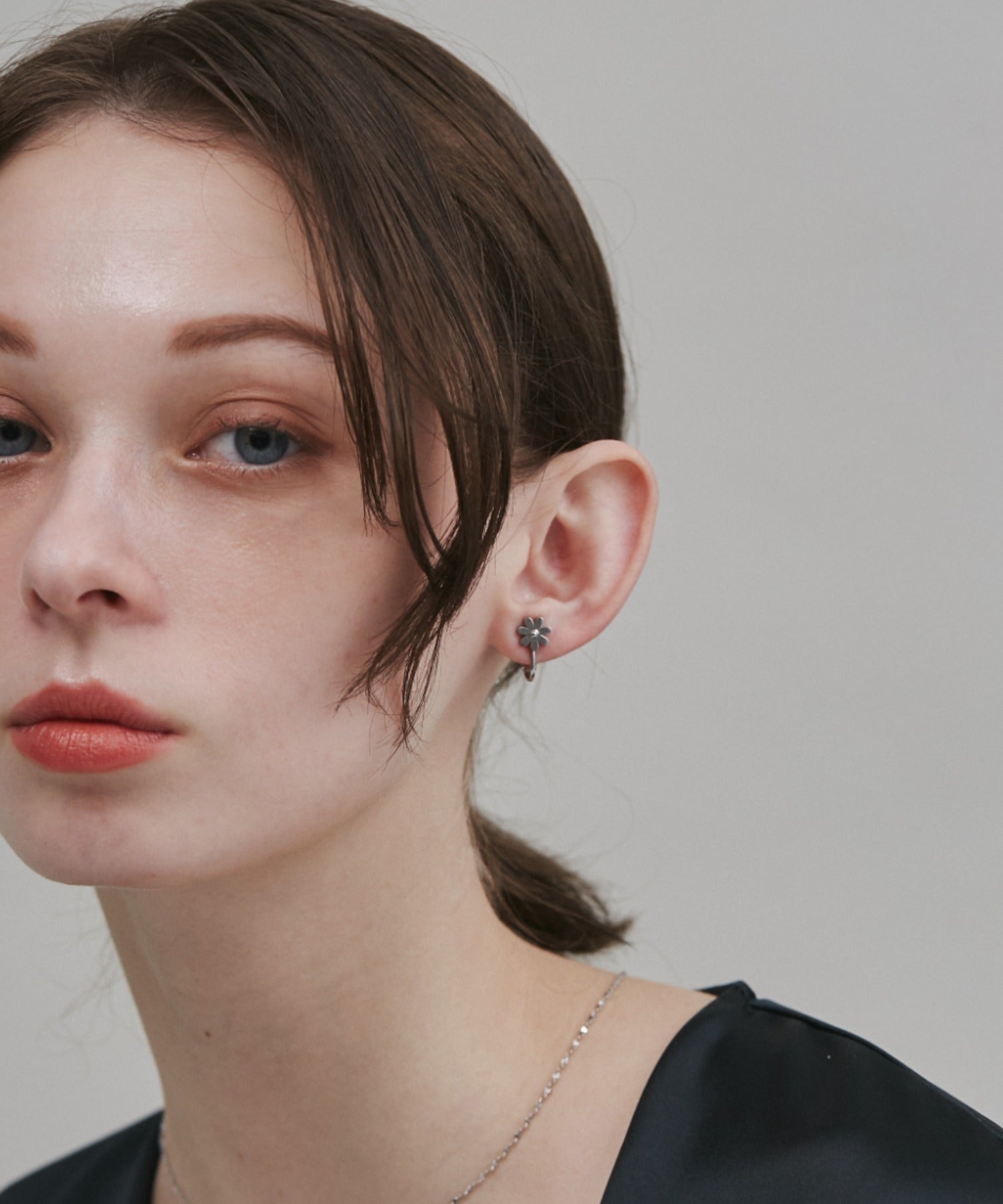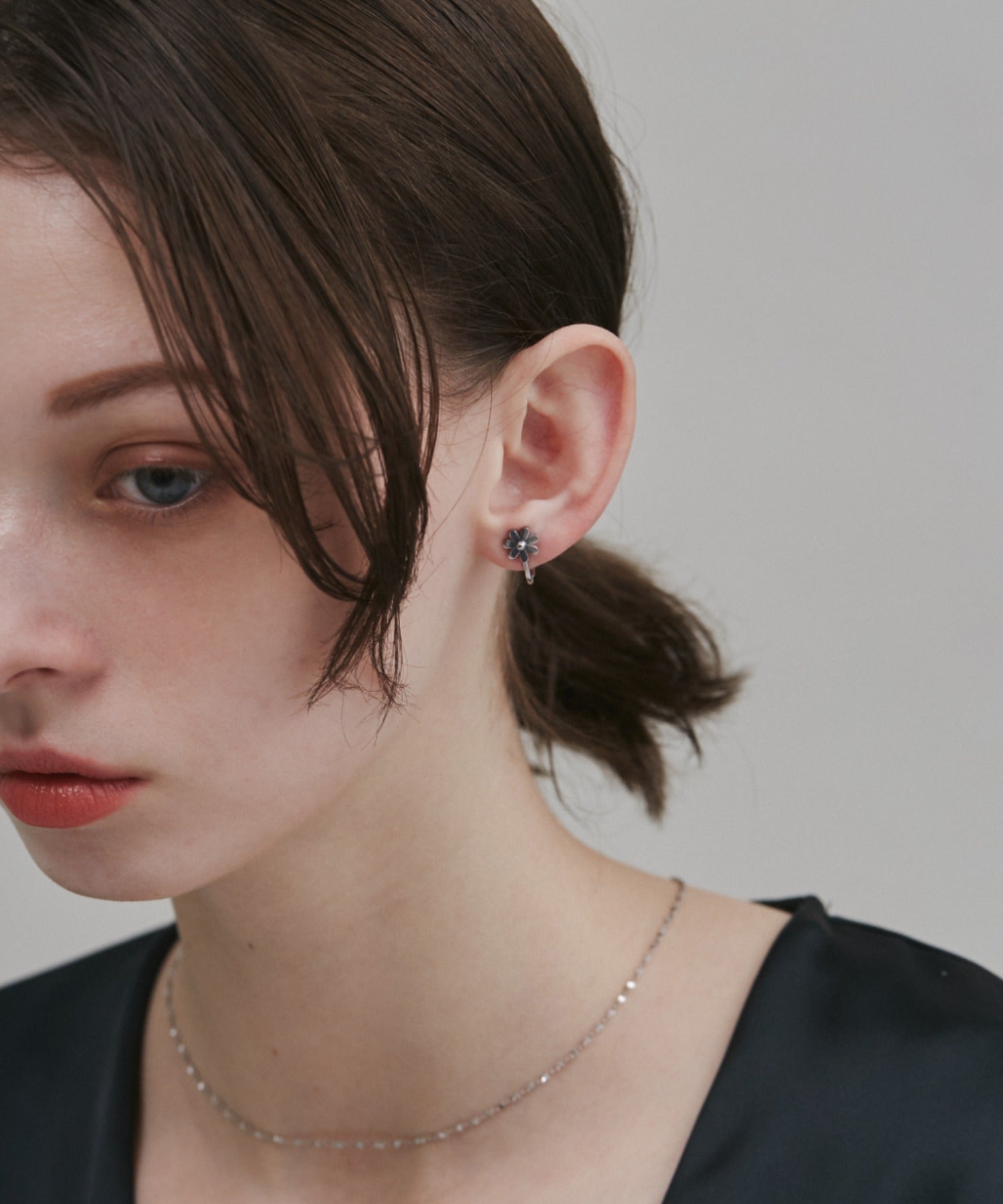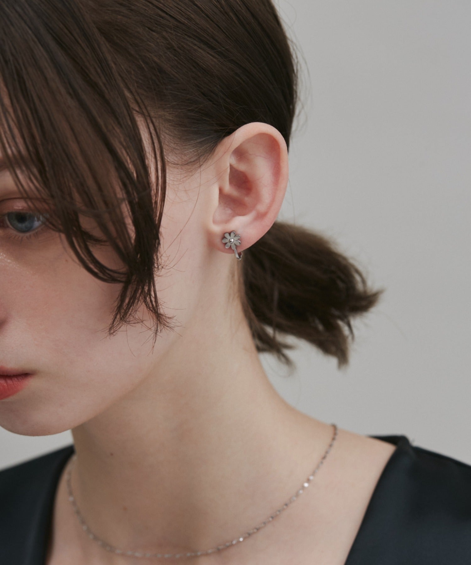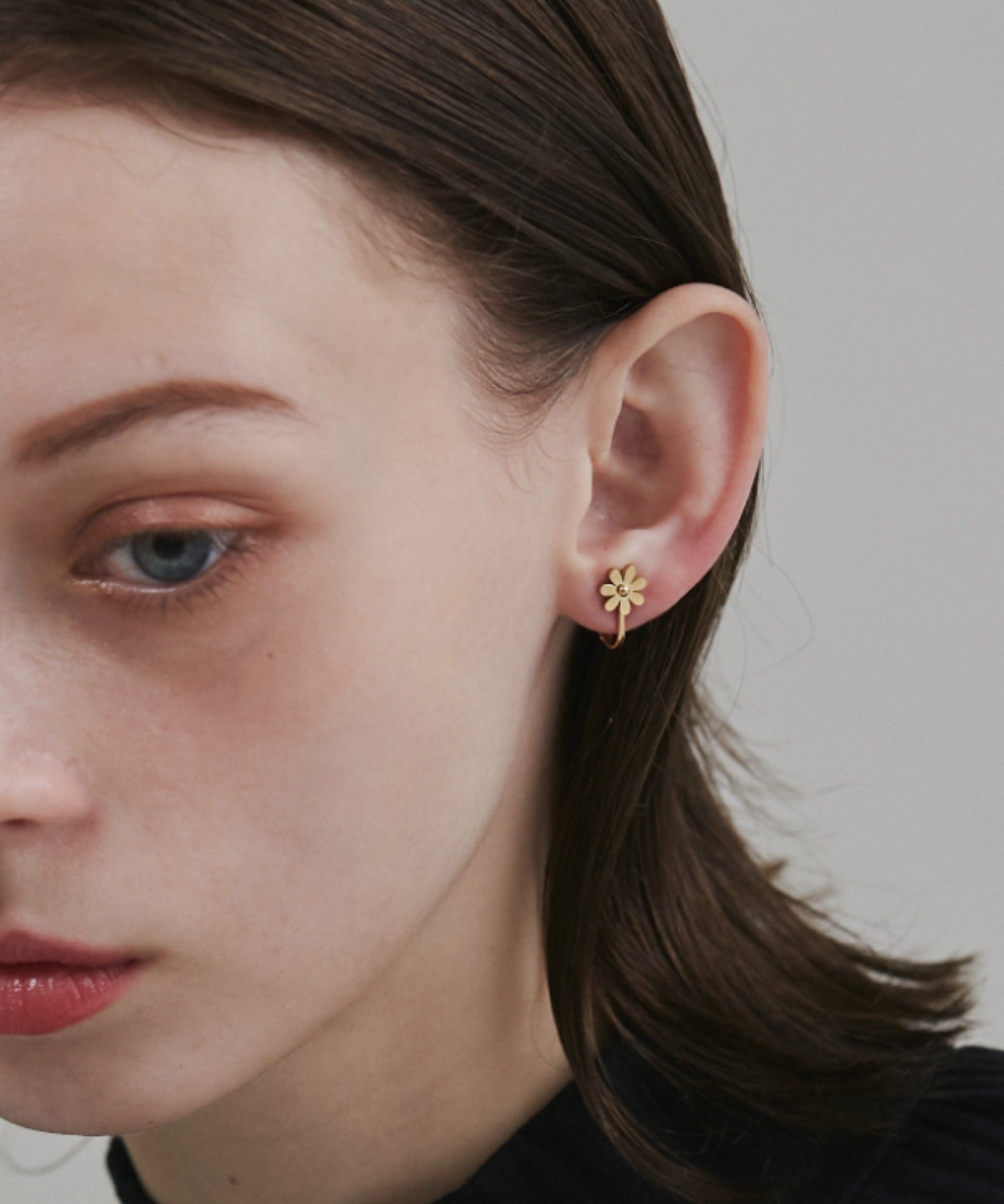 シンプルながらも付けたときのバランスにこだわったフラワーモチーフイヤリング。
