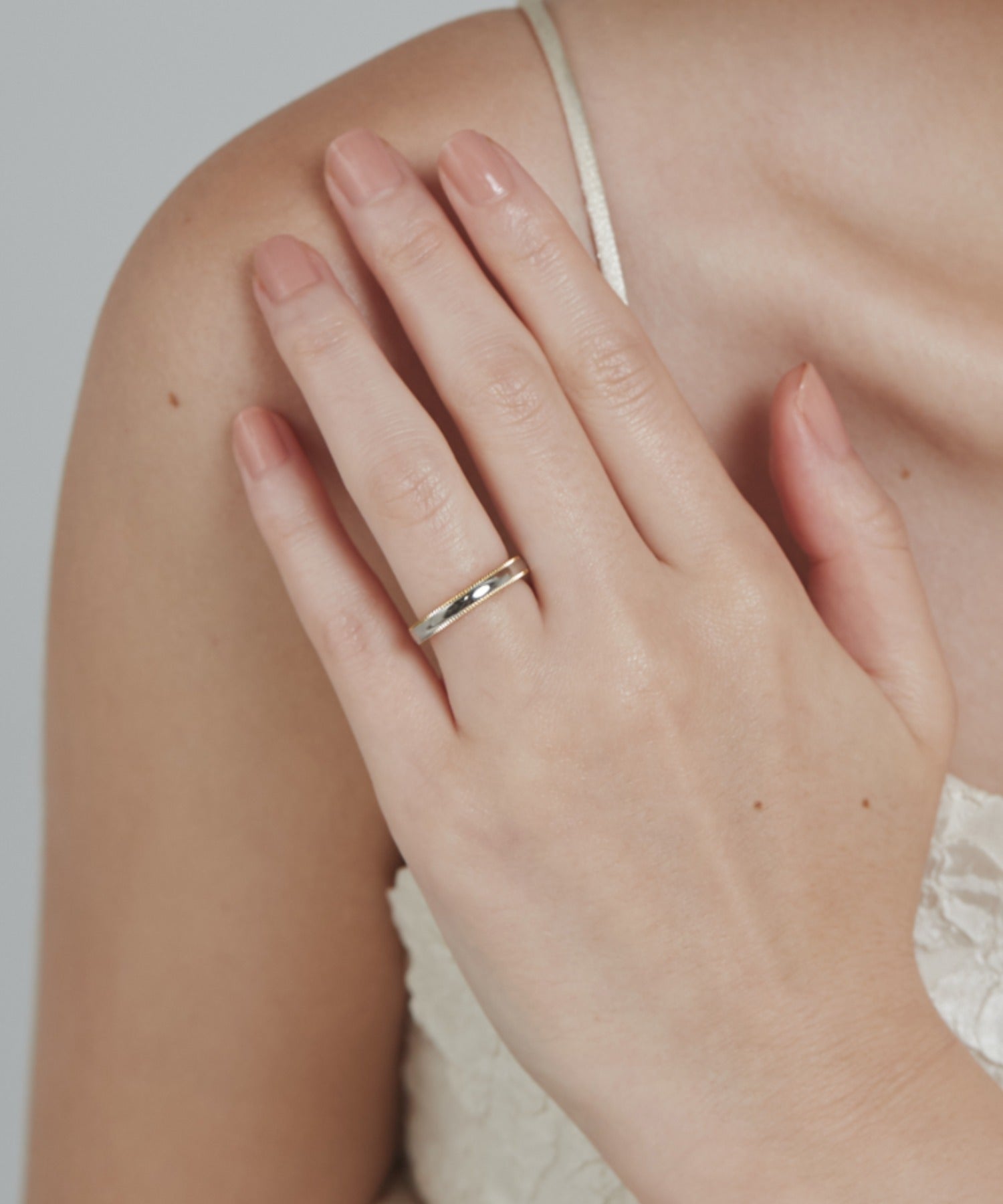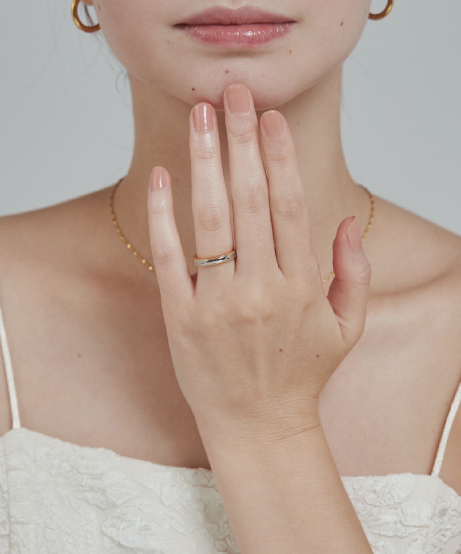 ゴールドとシルバーのバイカラーが大人可愛い印象のリング。