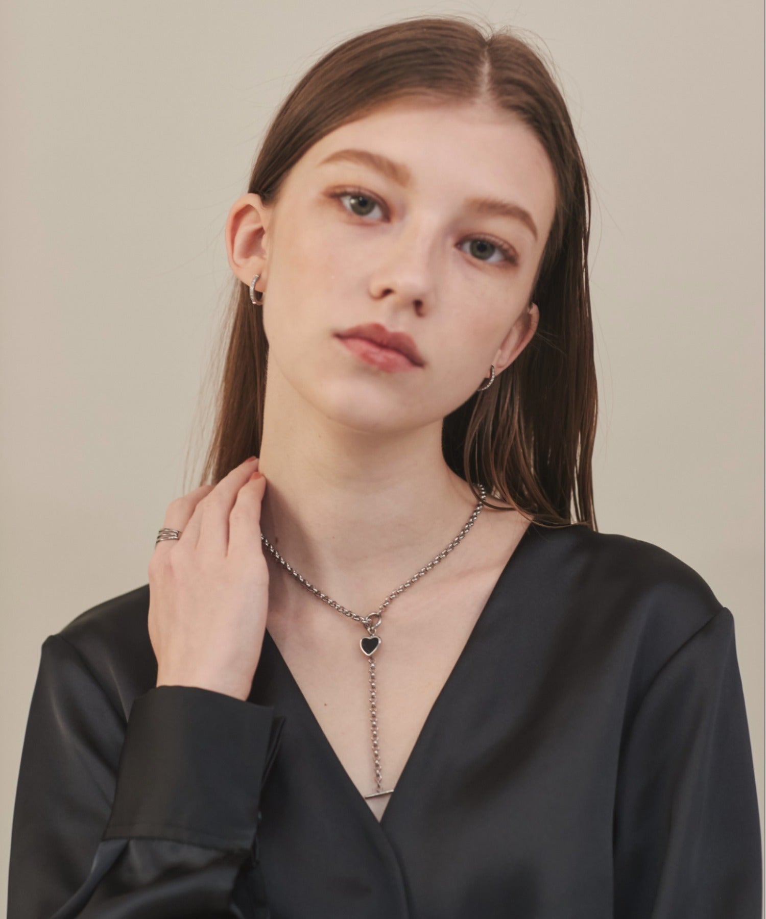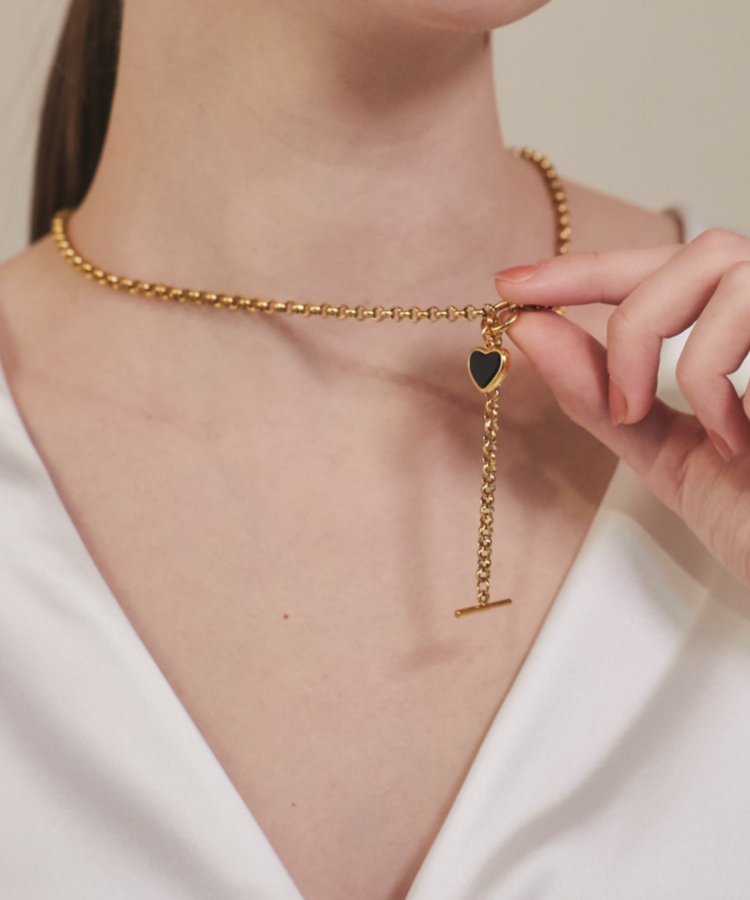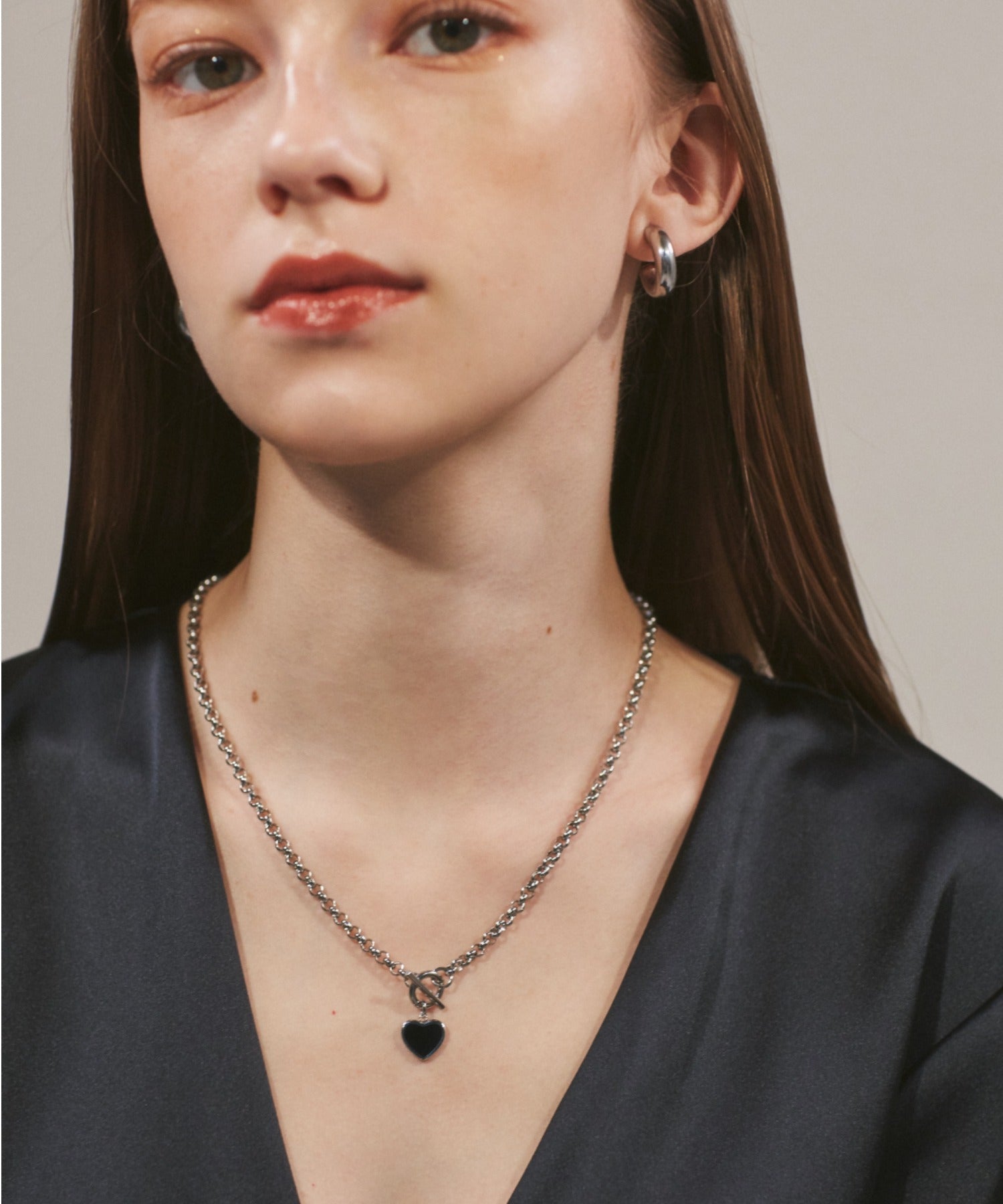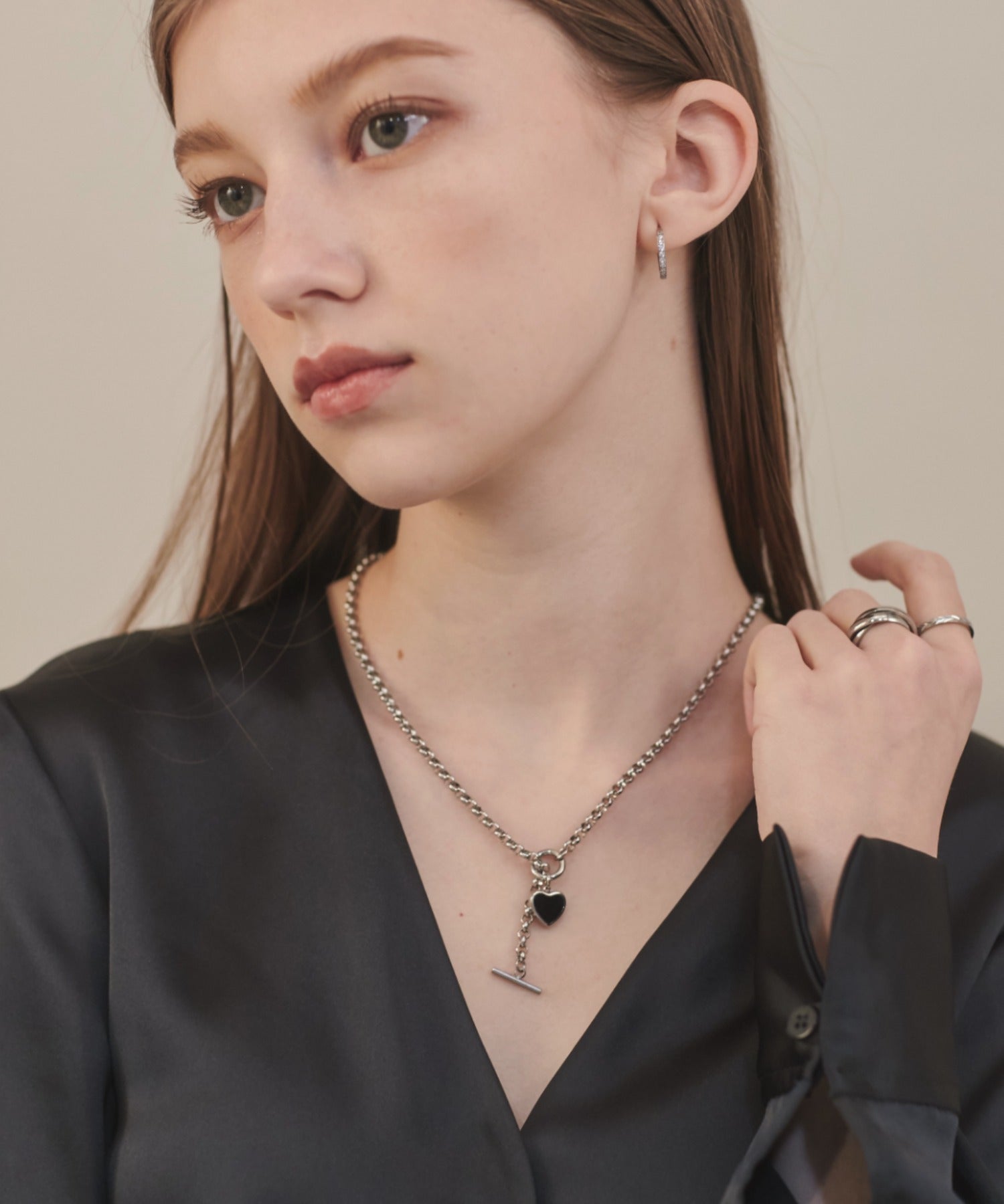 ハートデザインのトップが大人可愛い印象のマントルネックレス。