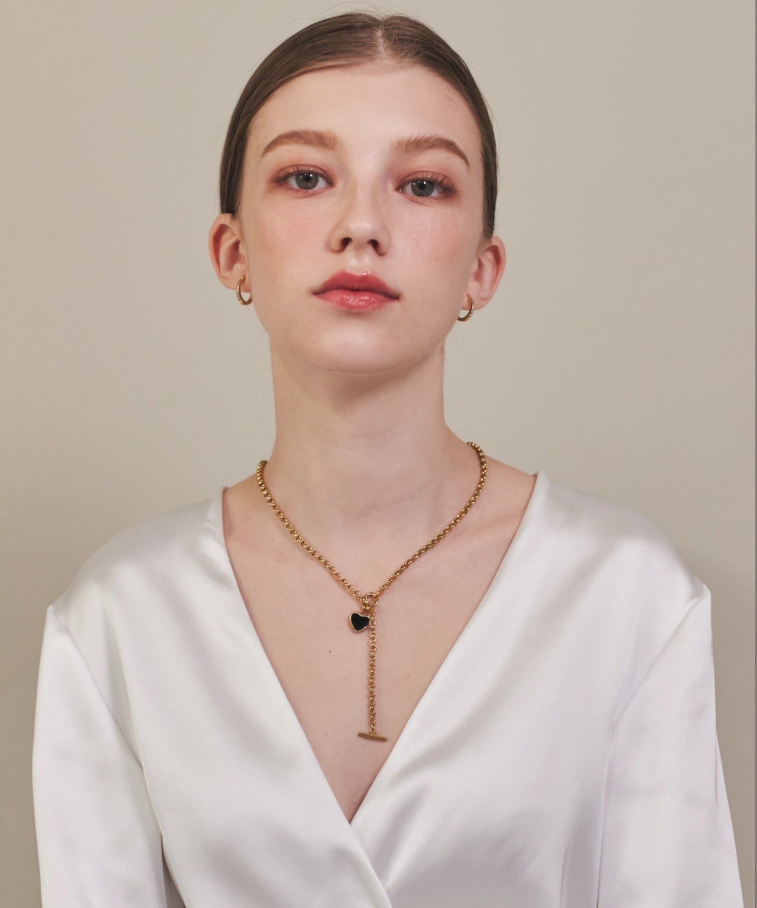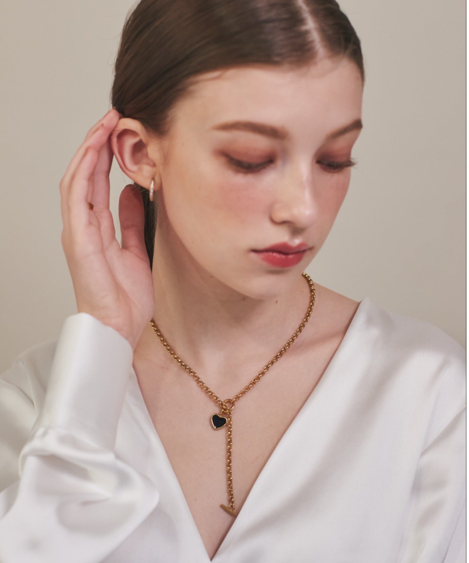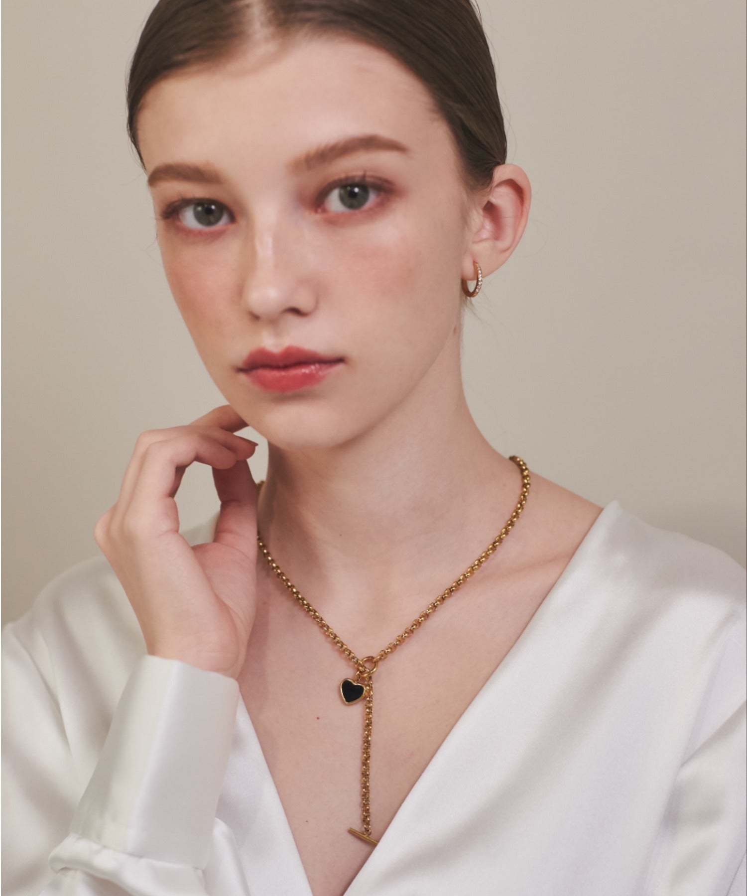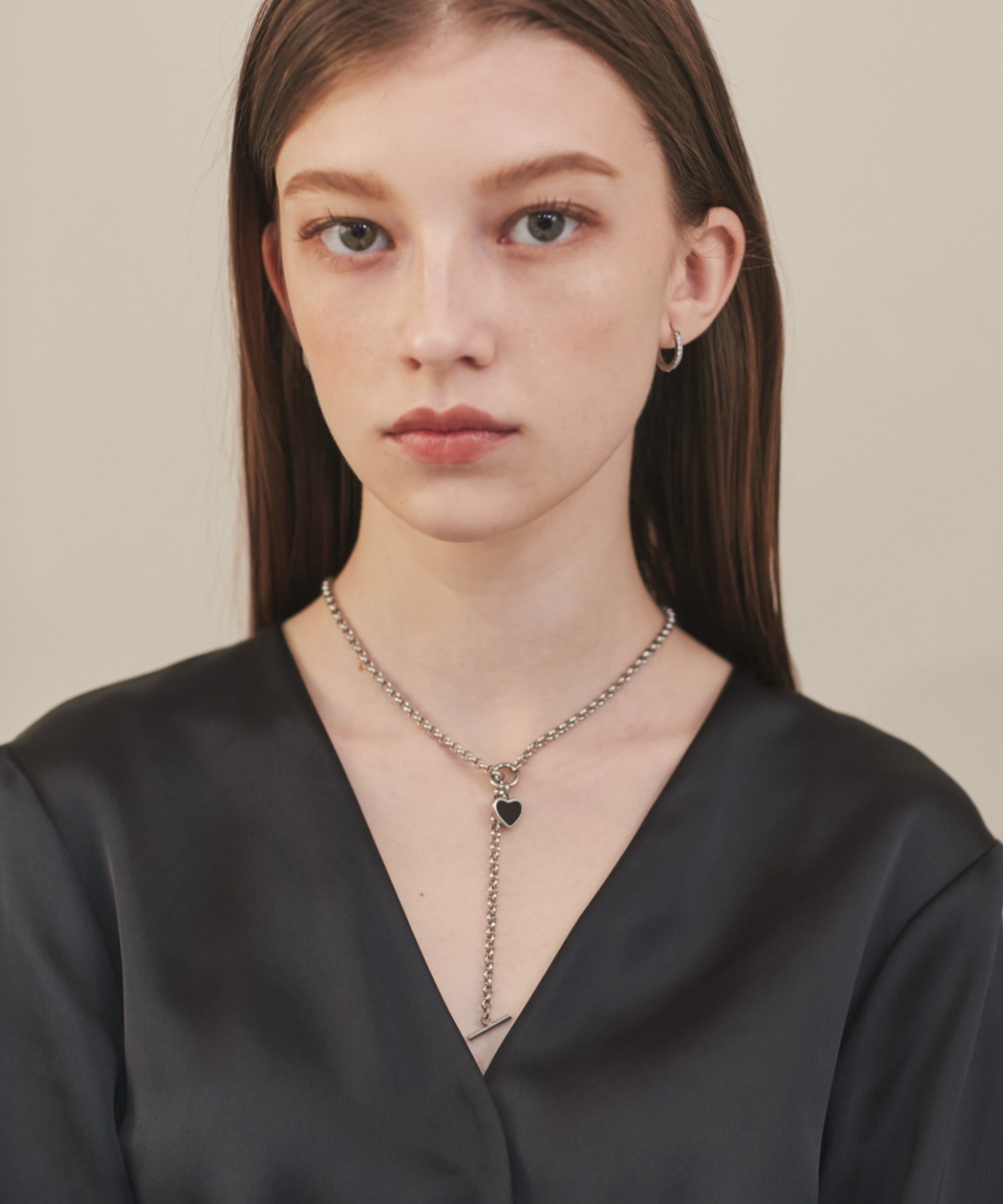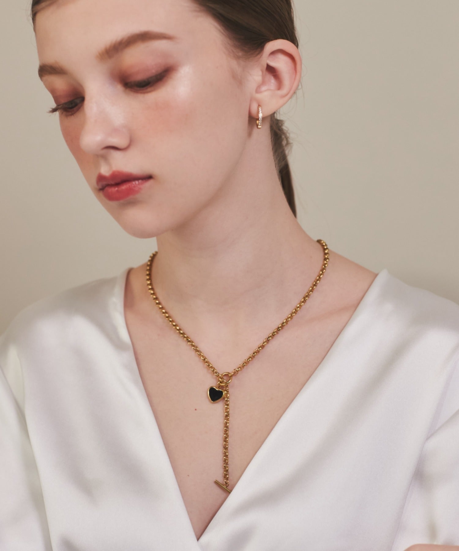 ハートデザインのトップが大人可愛い印象のマントルネックレス。