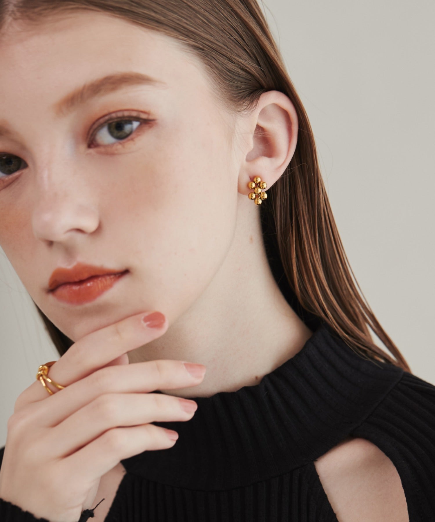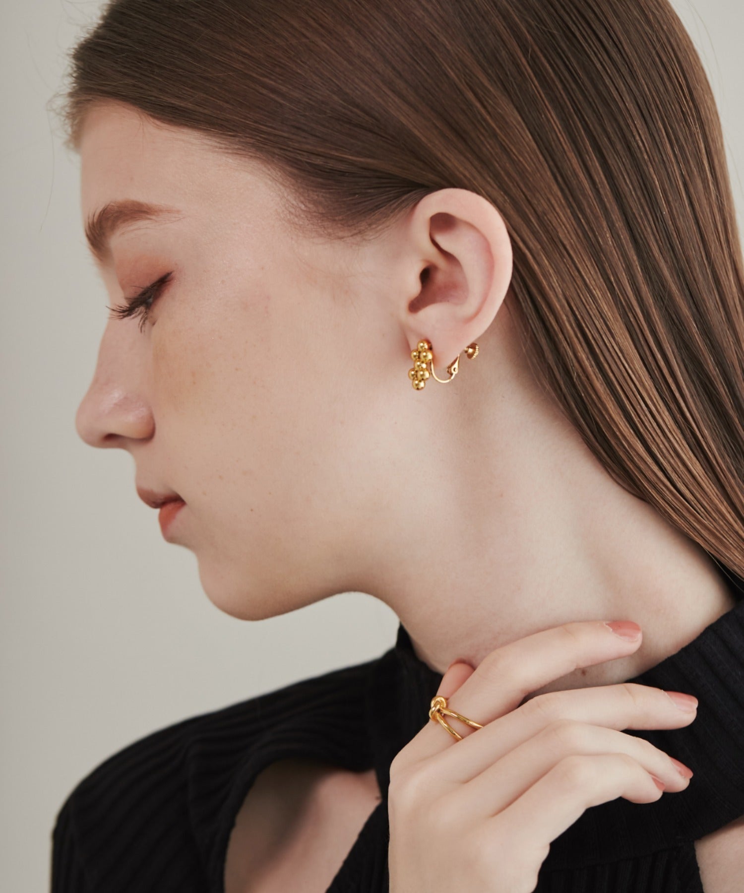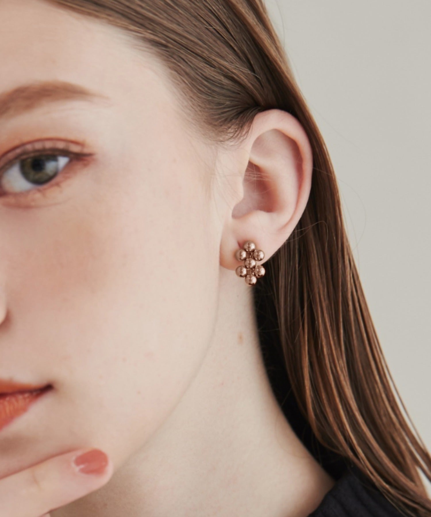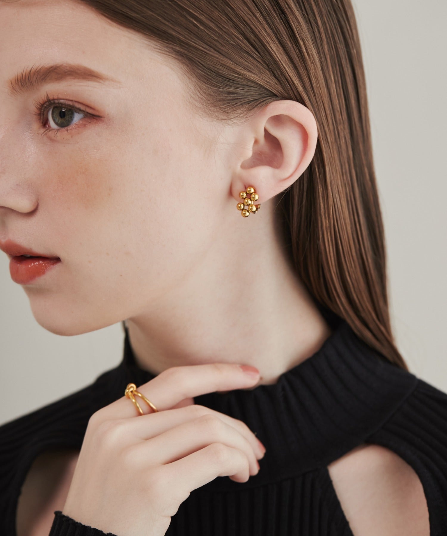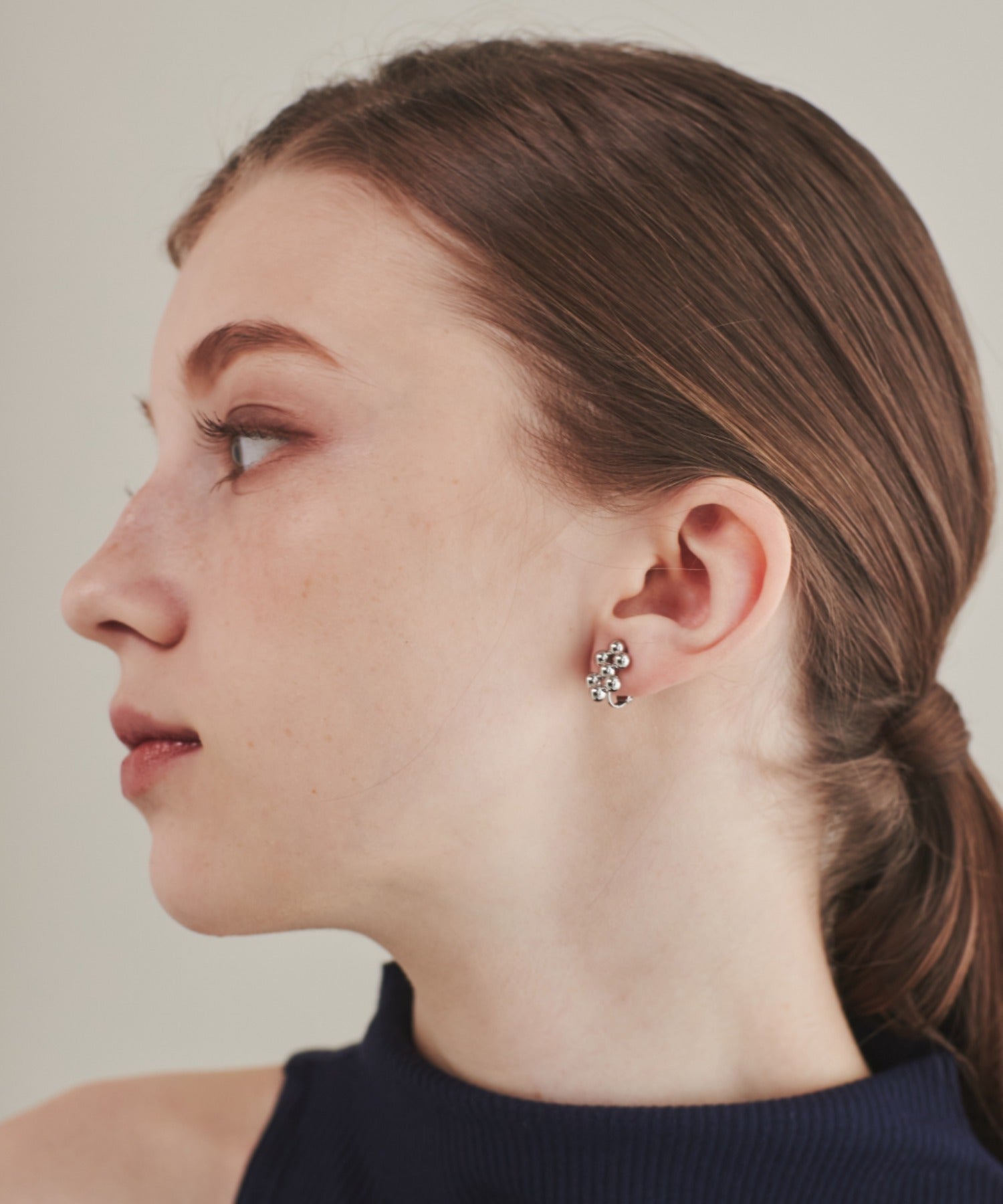小さい○を集めたようなデザインが大人可愛い印象のデザインイヤリング。