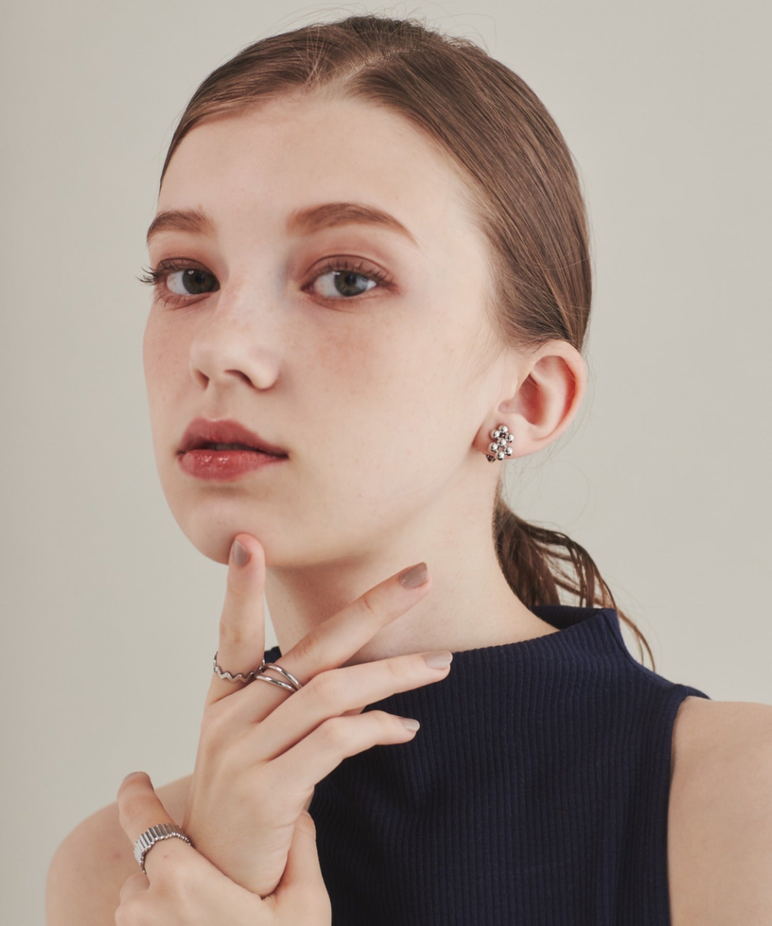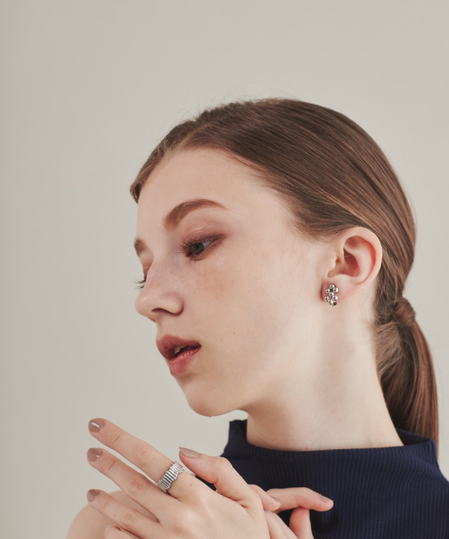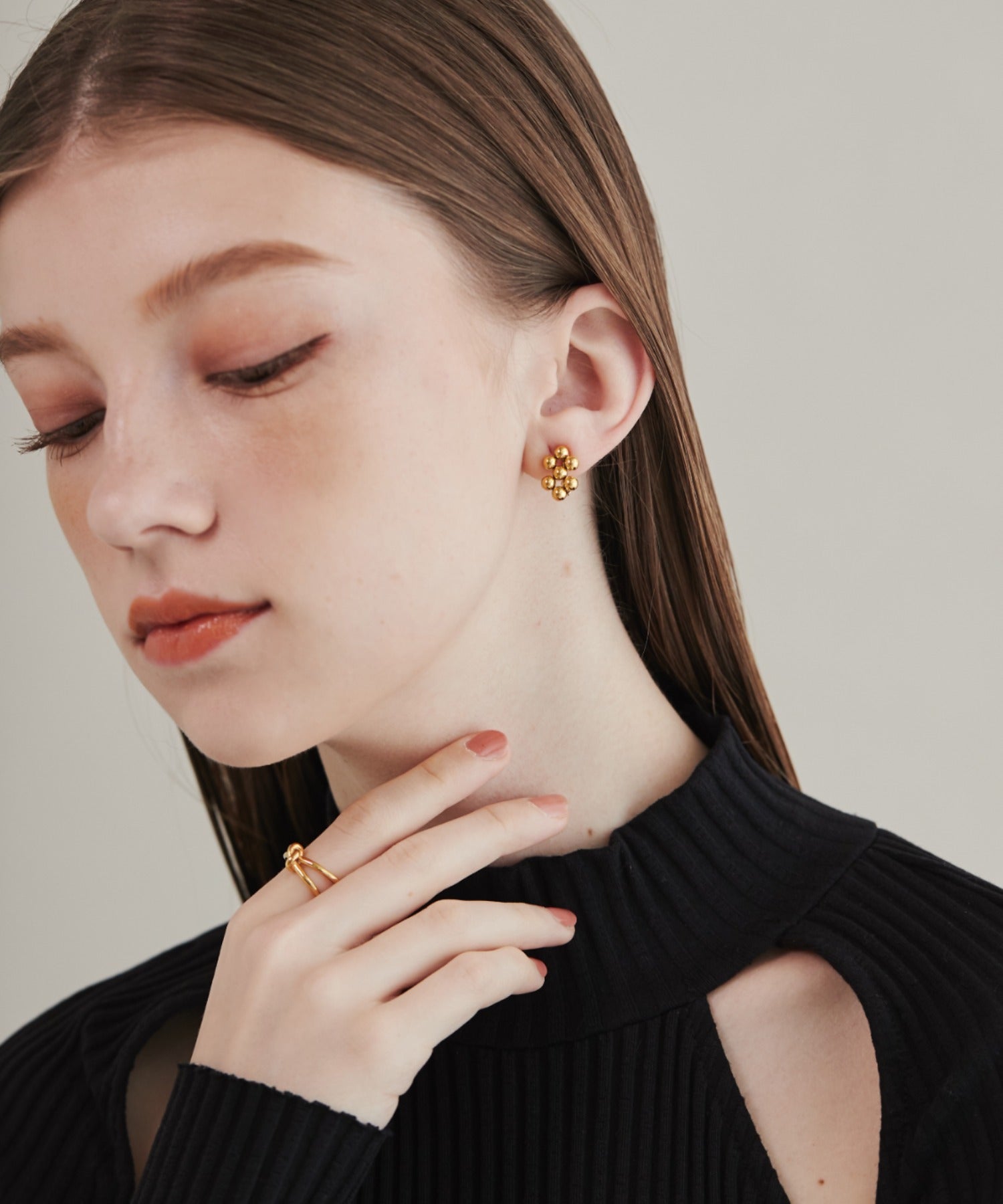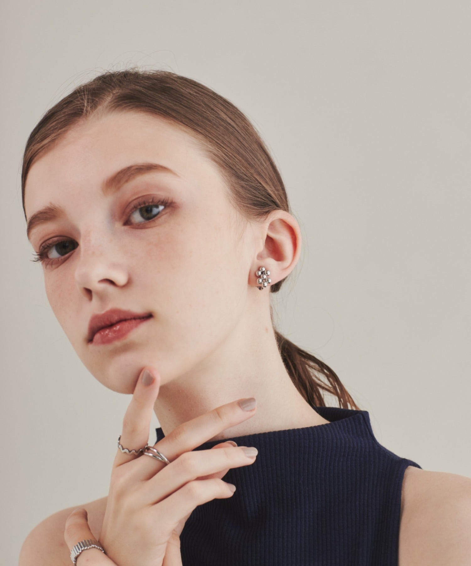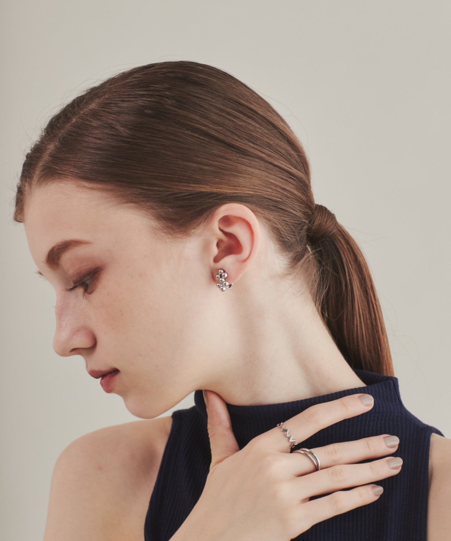 小さい○を集めたようなデザインが大人可愛い印象のデザインイヤリング。
