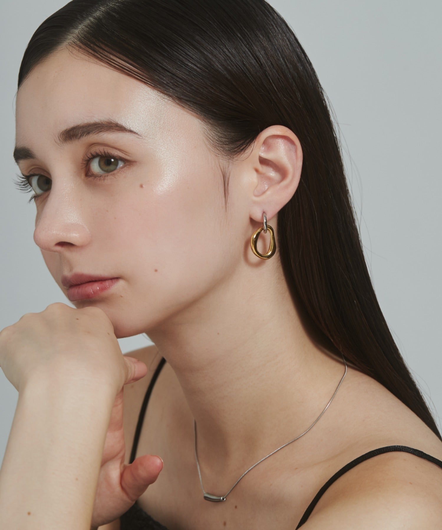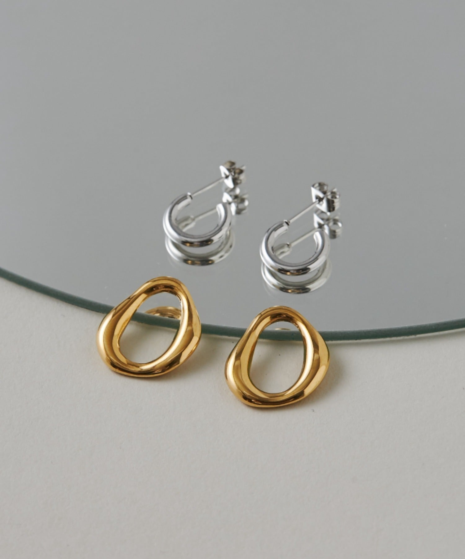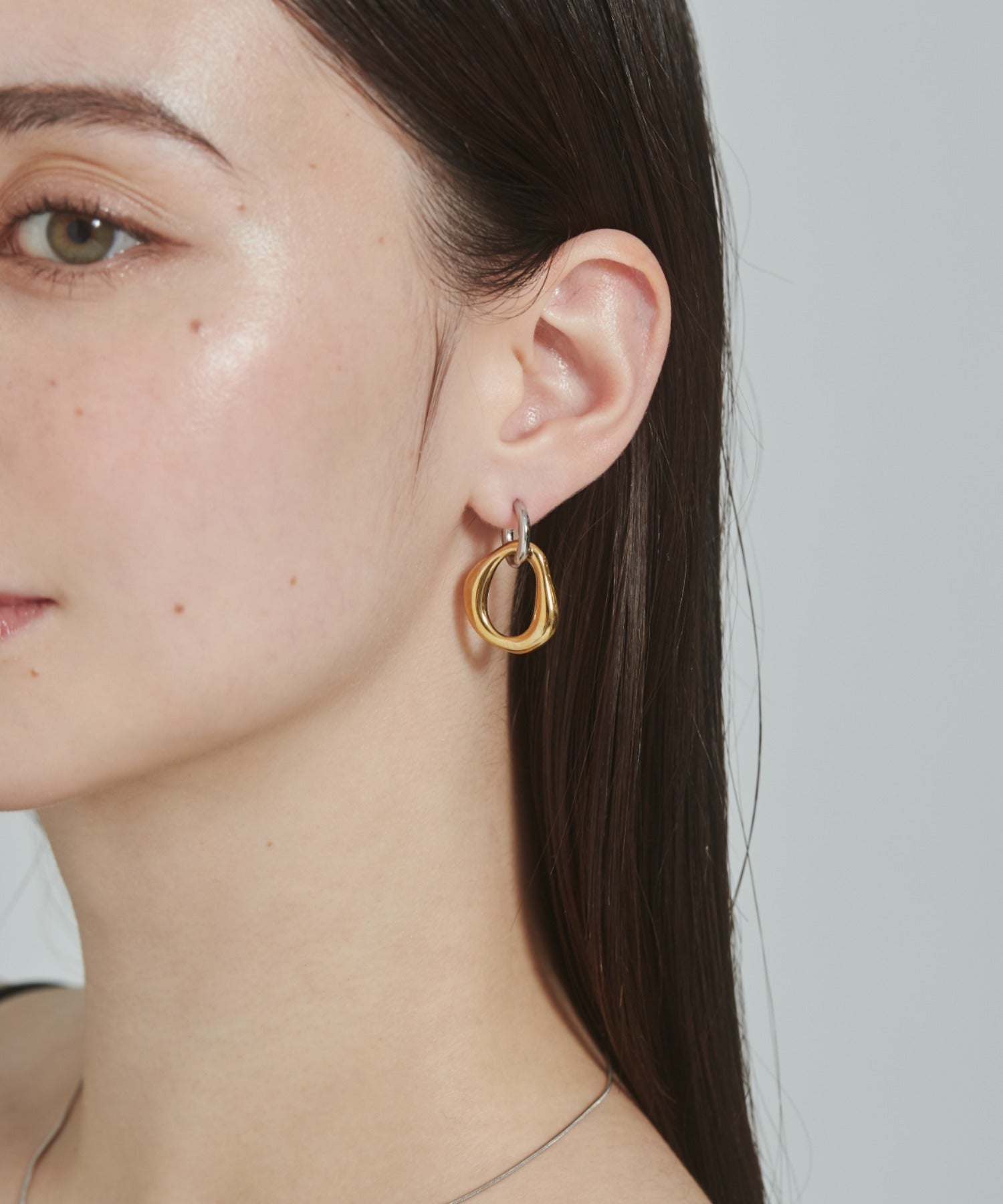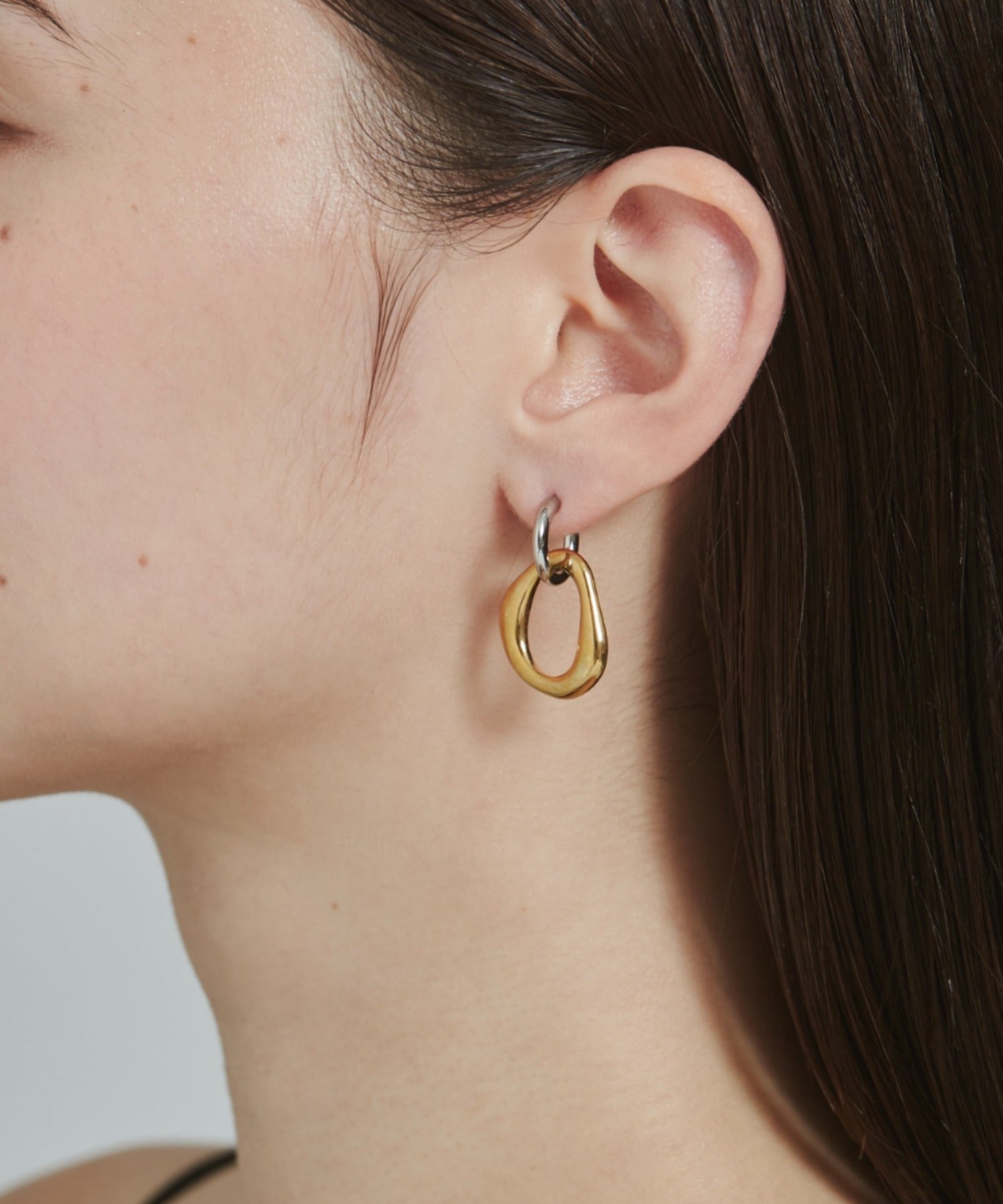 シンプルながらも付けた時のバランスに最大限こだわった 2way バイカラーピアス。