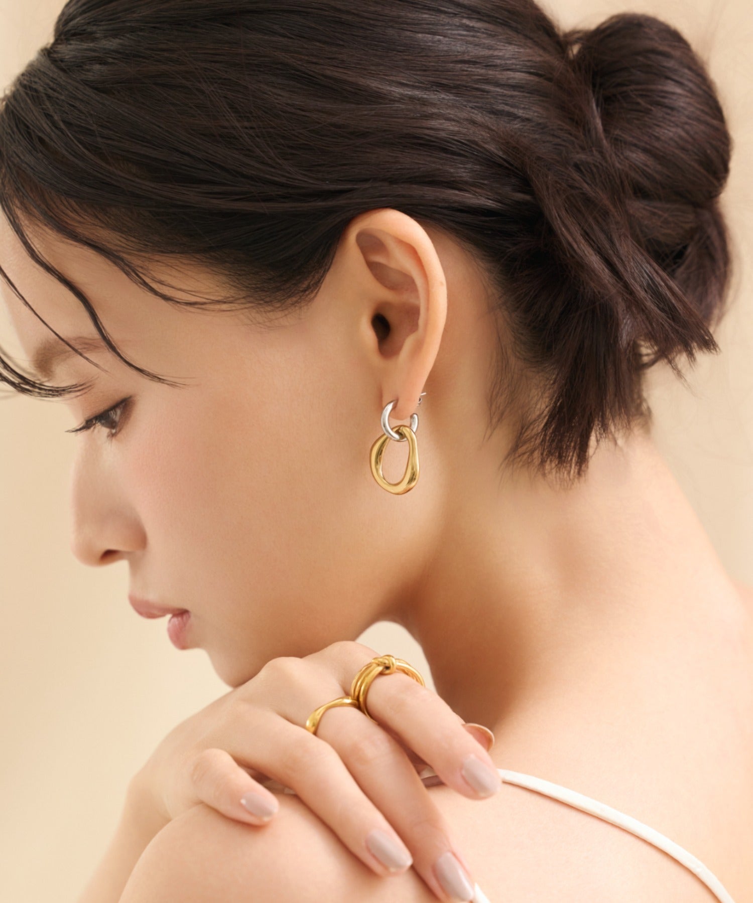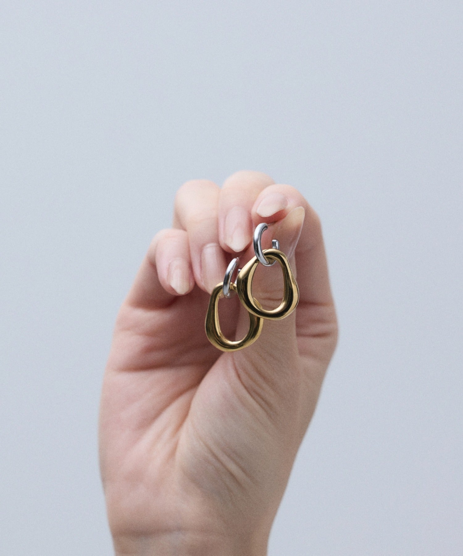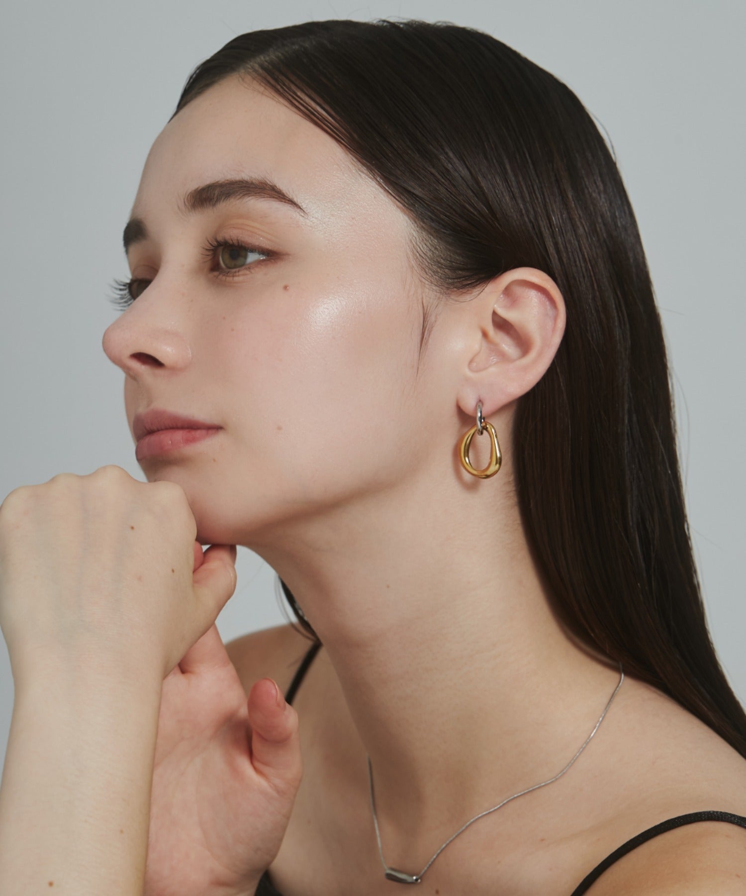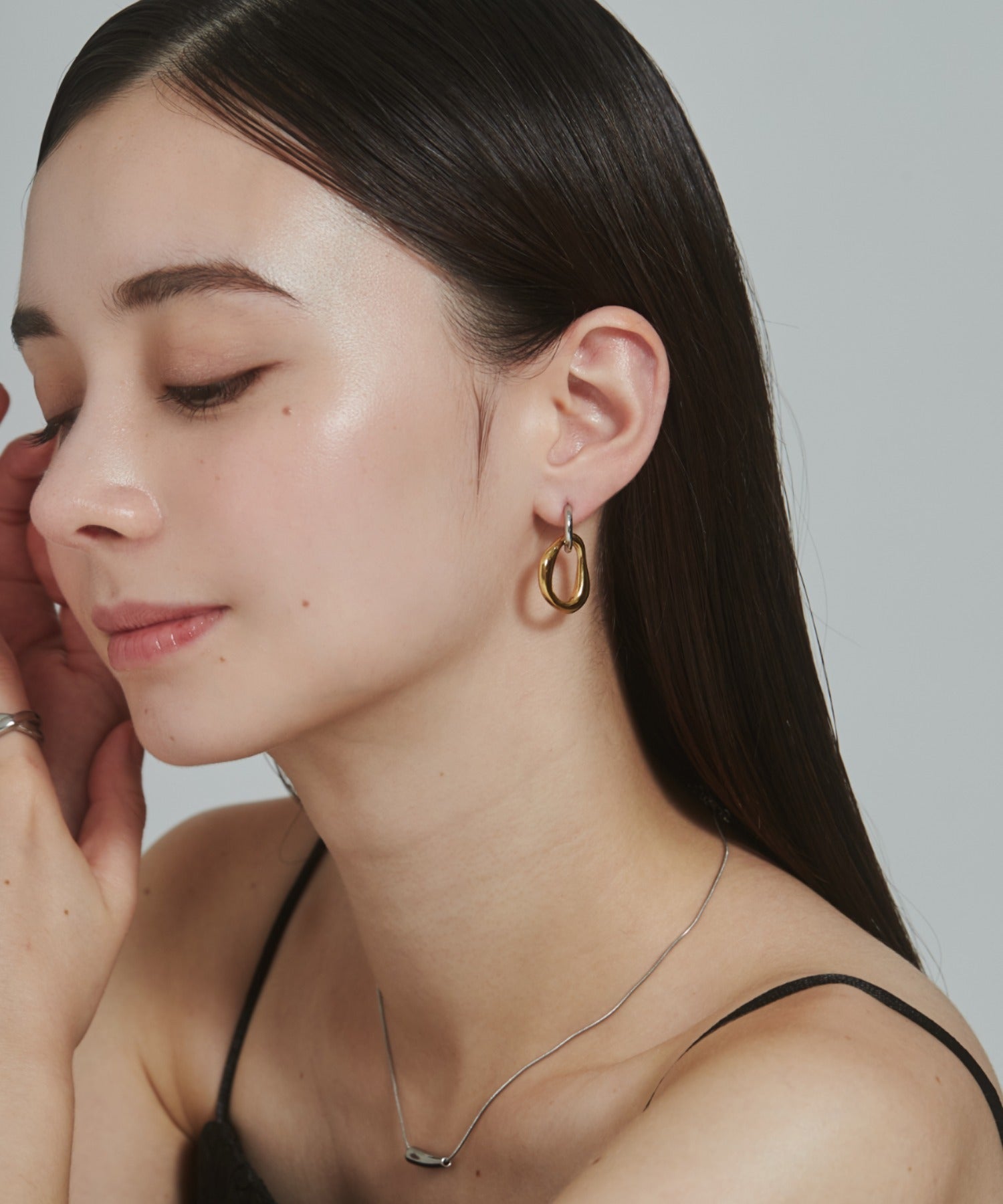 シンプルながらも付けた時のバランスに最大限こだわった 2way バイカラーピアス。