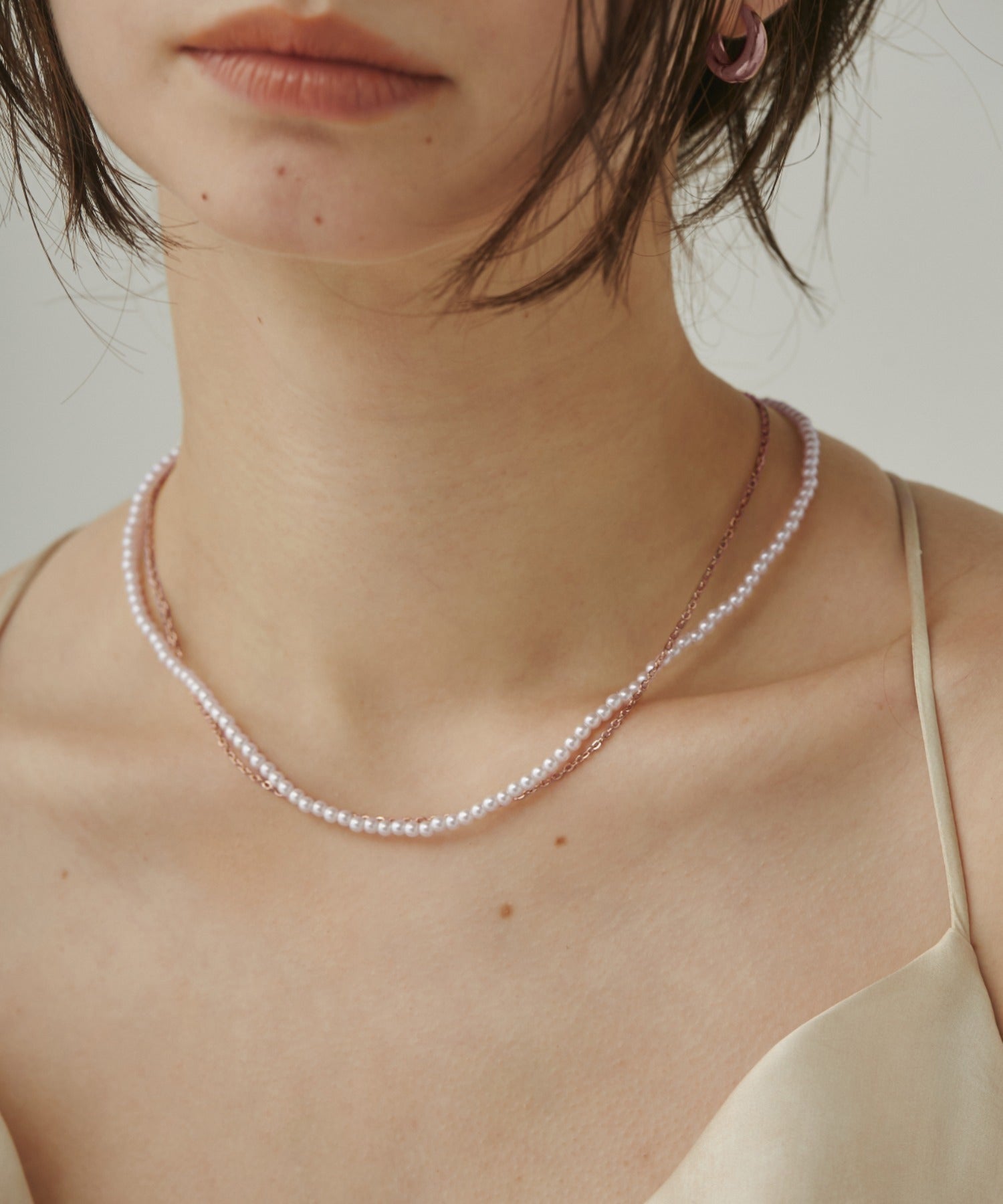 パールネックレスとシンプルなサージカルステンレスチェーンネックレスを組み合わせたセットアイテム。