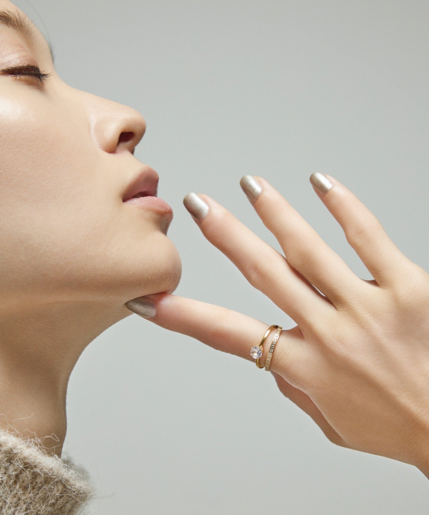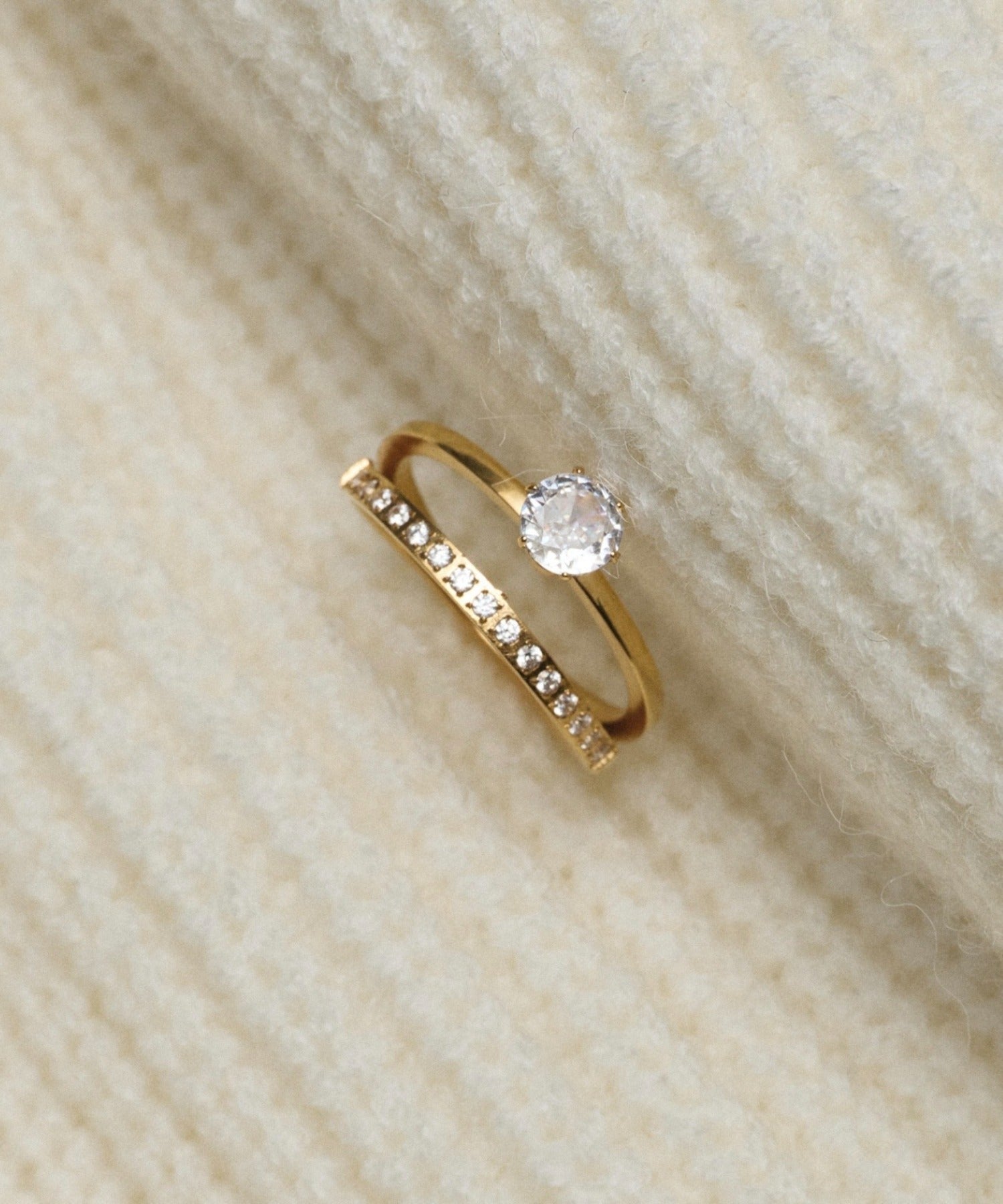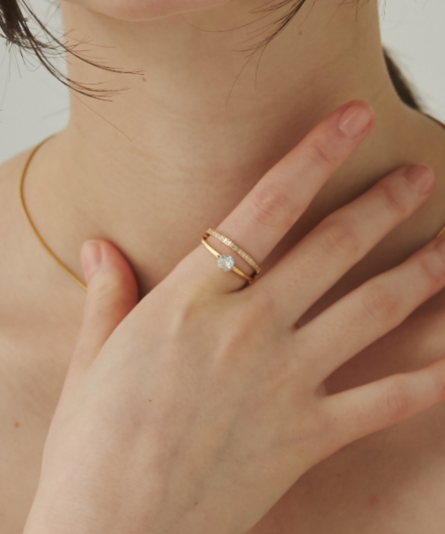 2つの指輪を重ねたようなデザインが特徴のビジューリング。