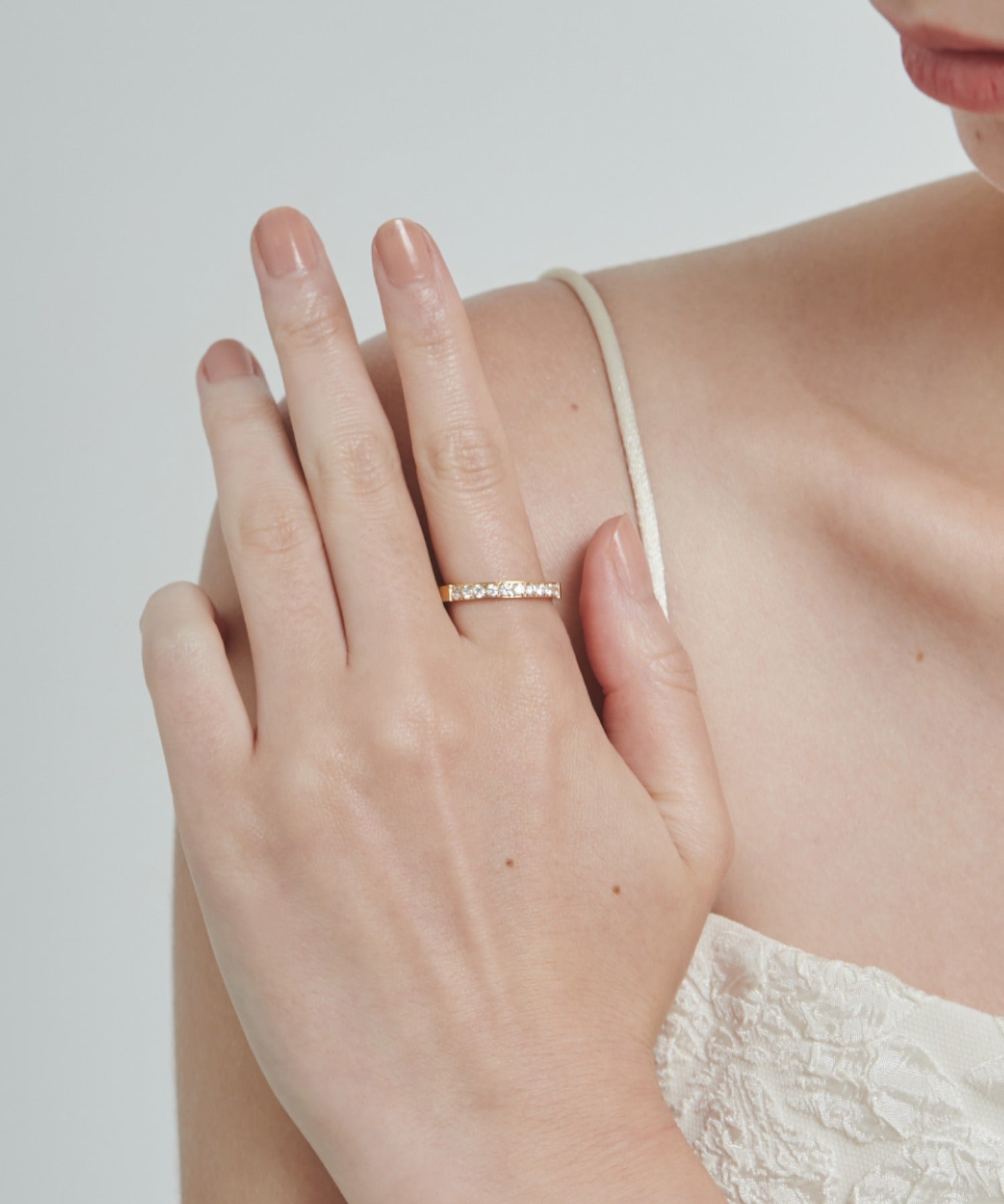 美しく光り輝くビジューが指もとを優美に照らしてくれるリング。