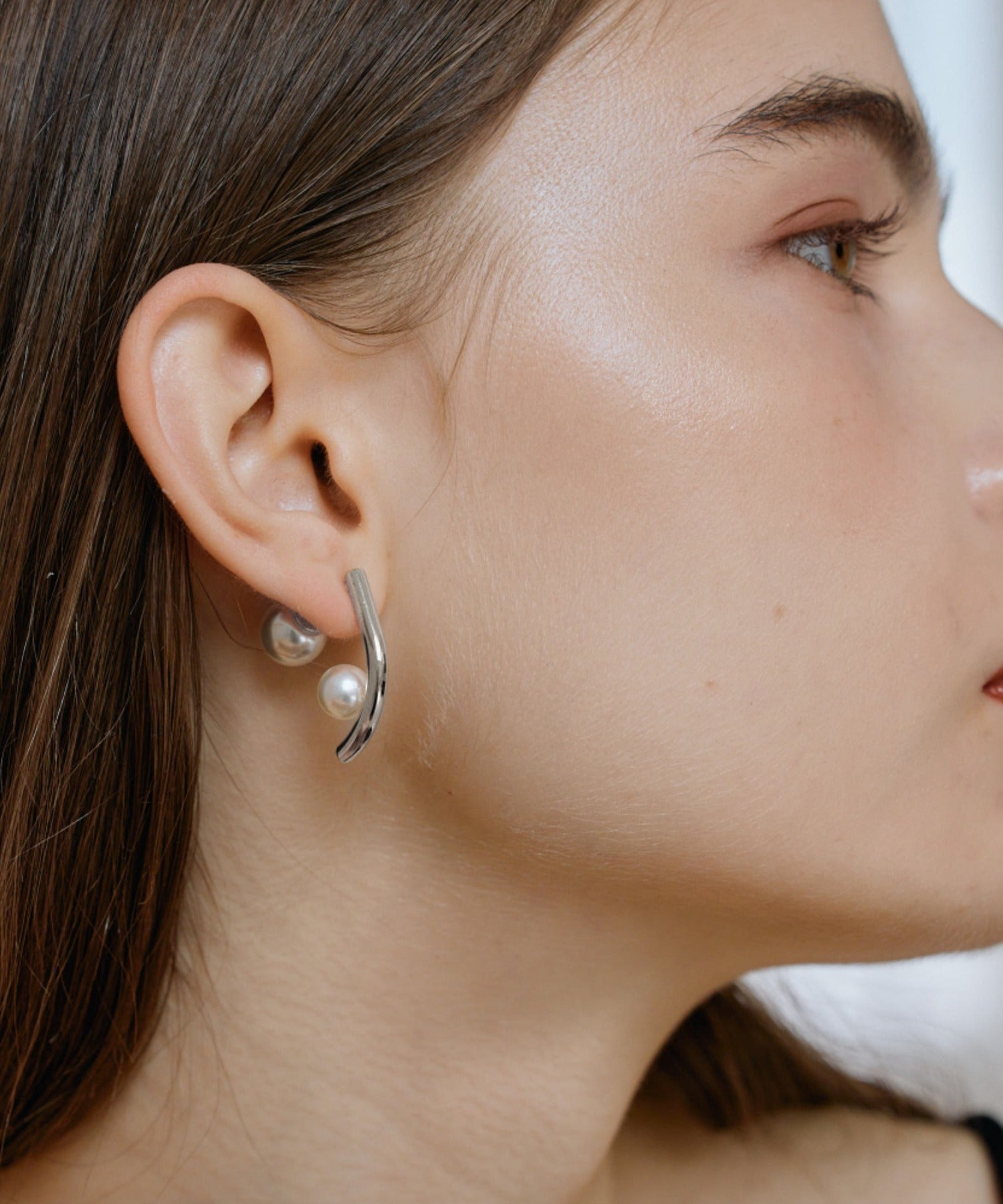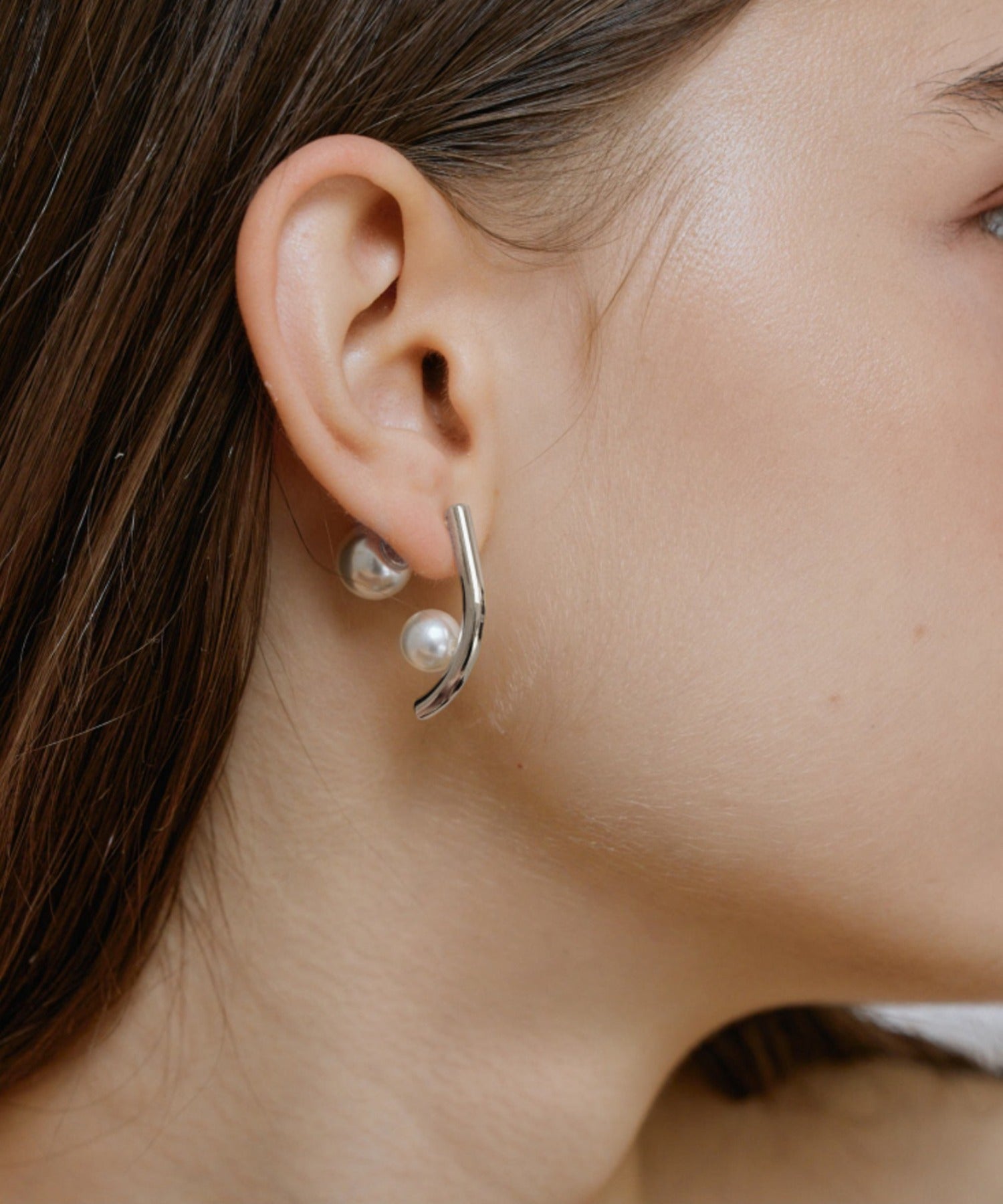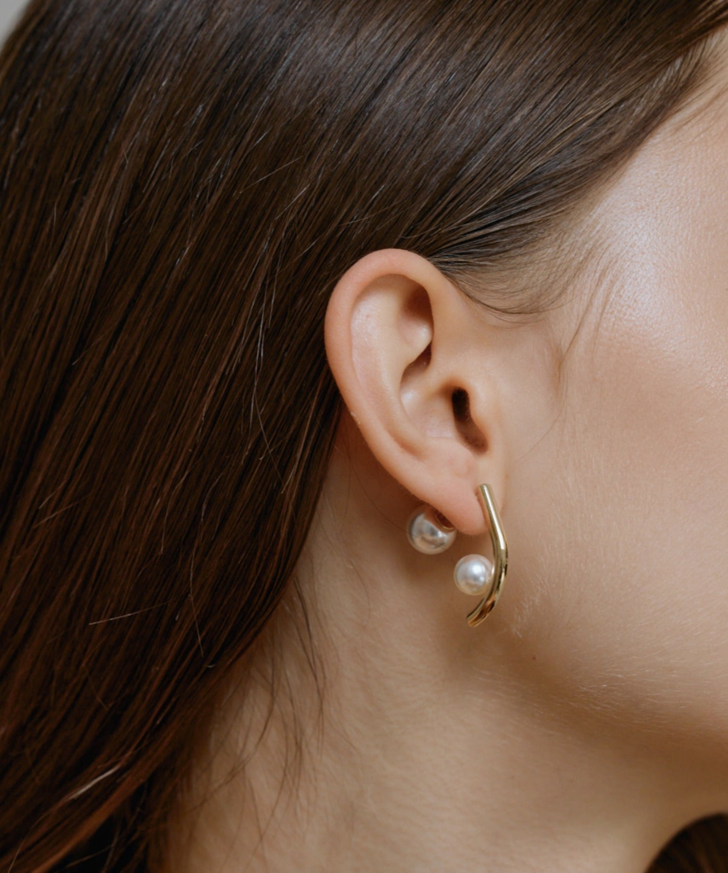 サイドから見るとプレートにころんと乗ったパールが愛らしいデザインピアス。