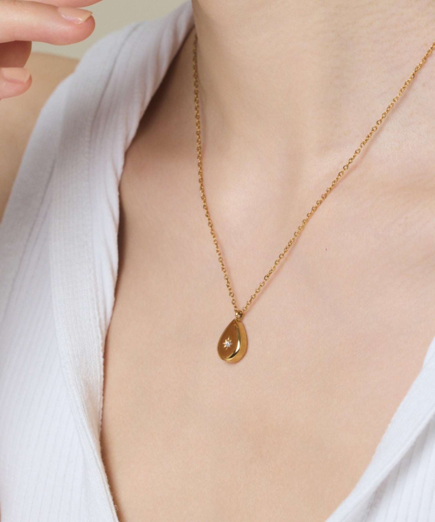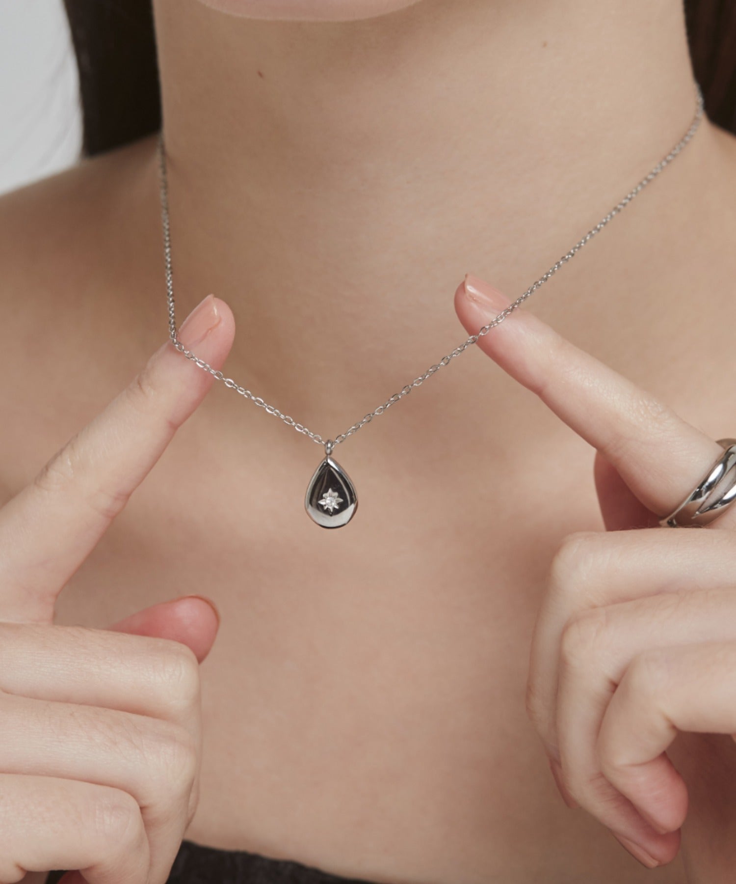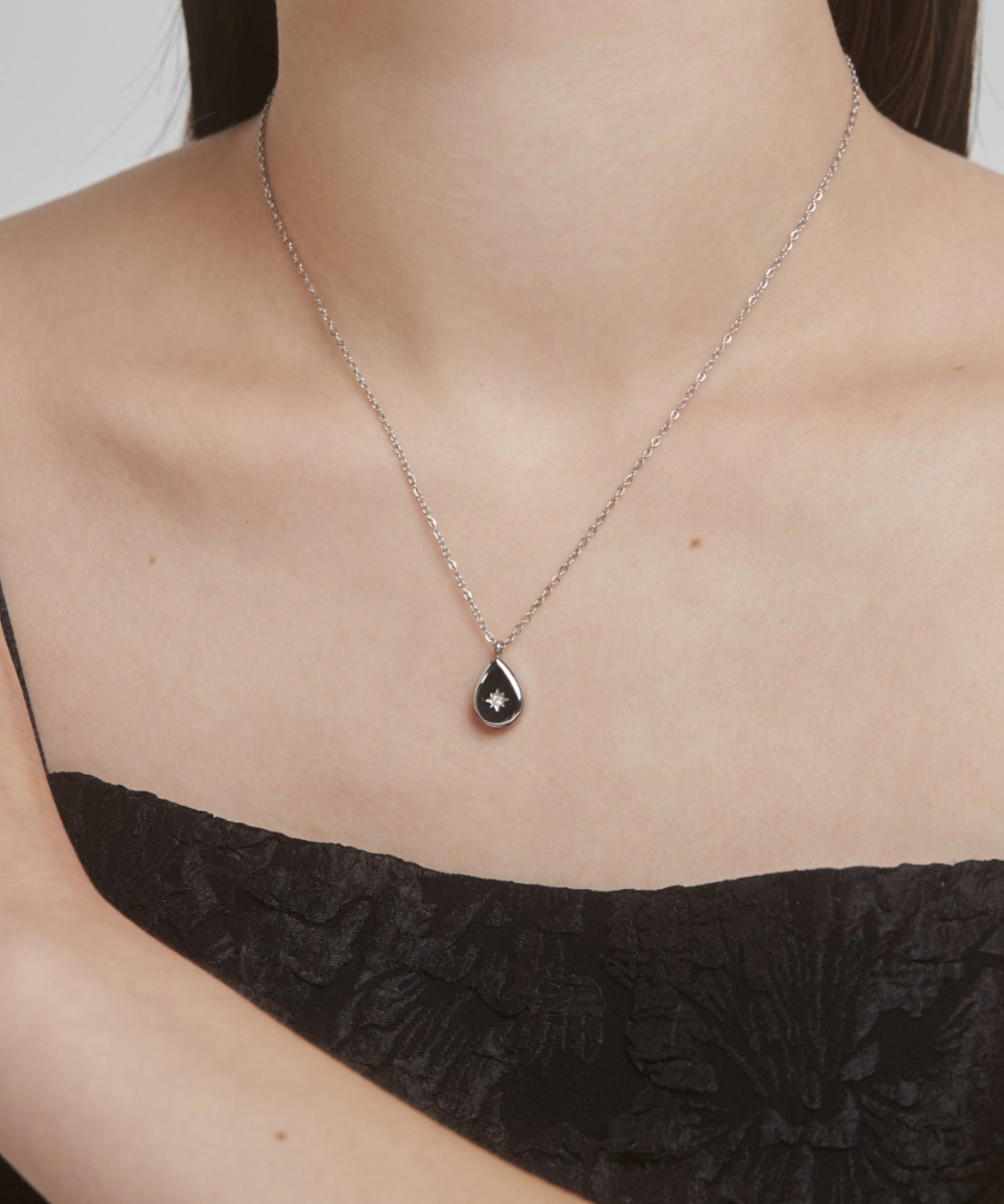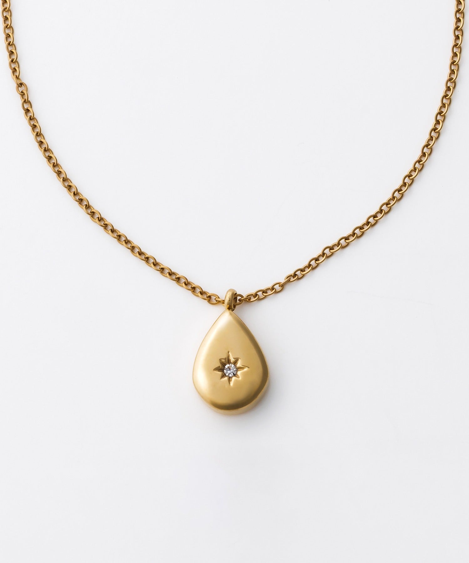 雫デザインのトップに美しく光り輝くビジューをあしらったデザインネックレス。