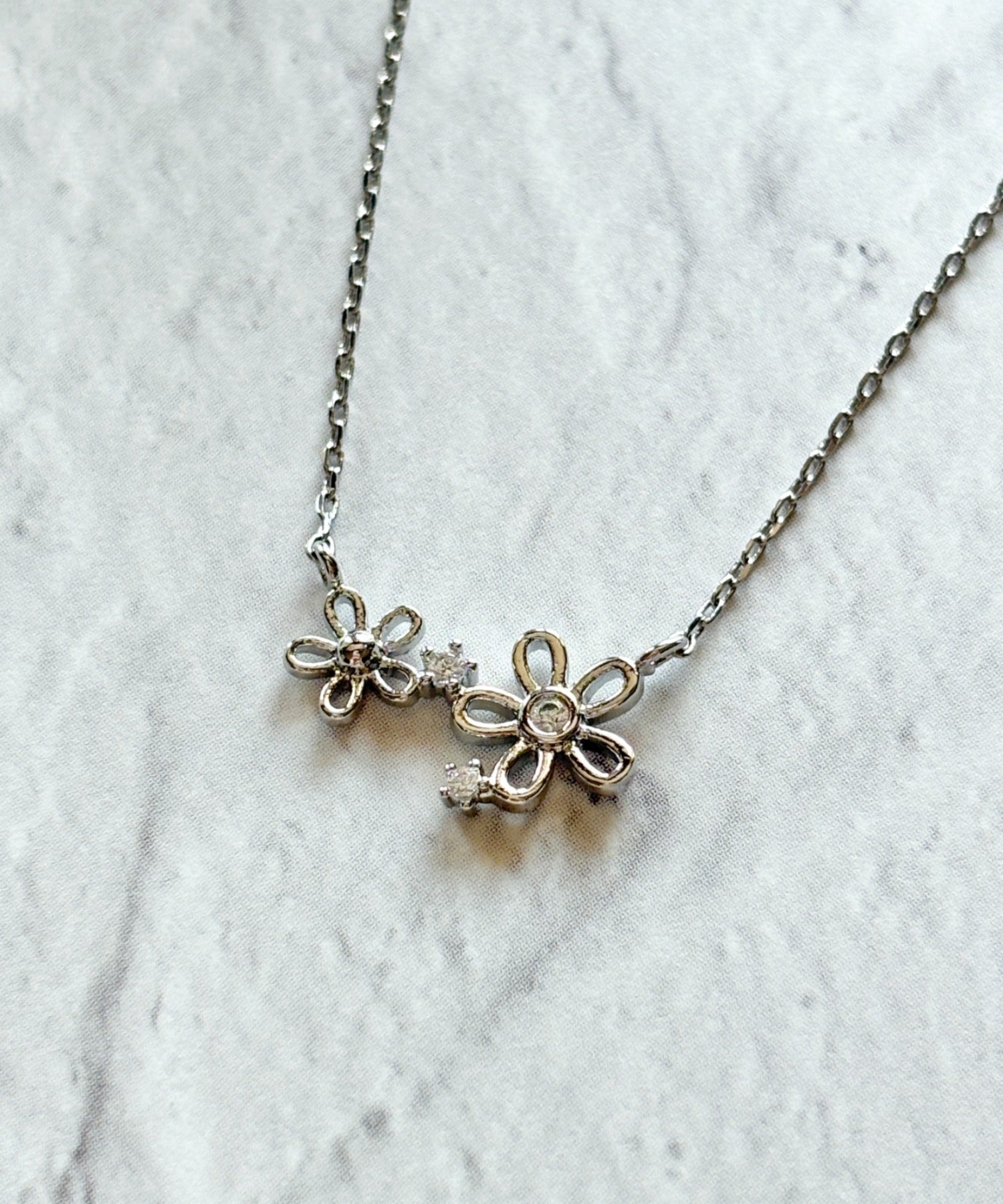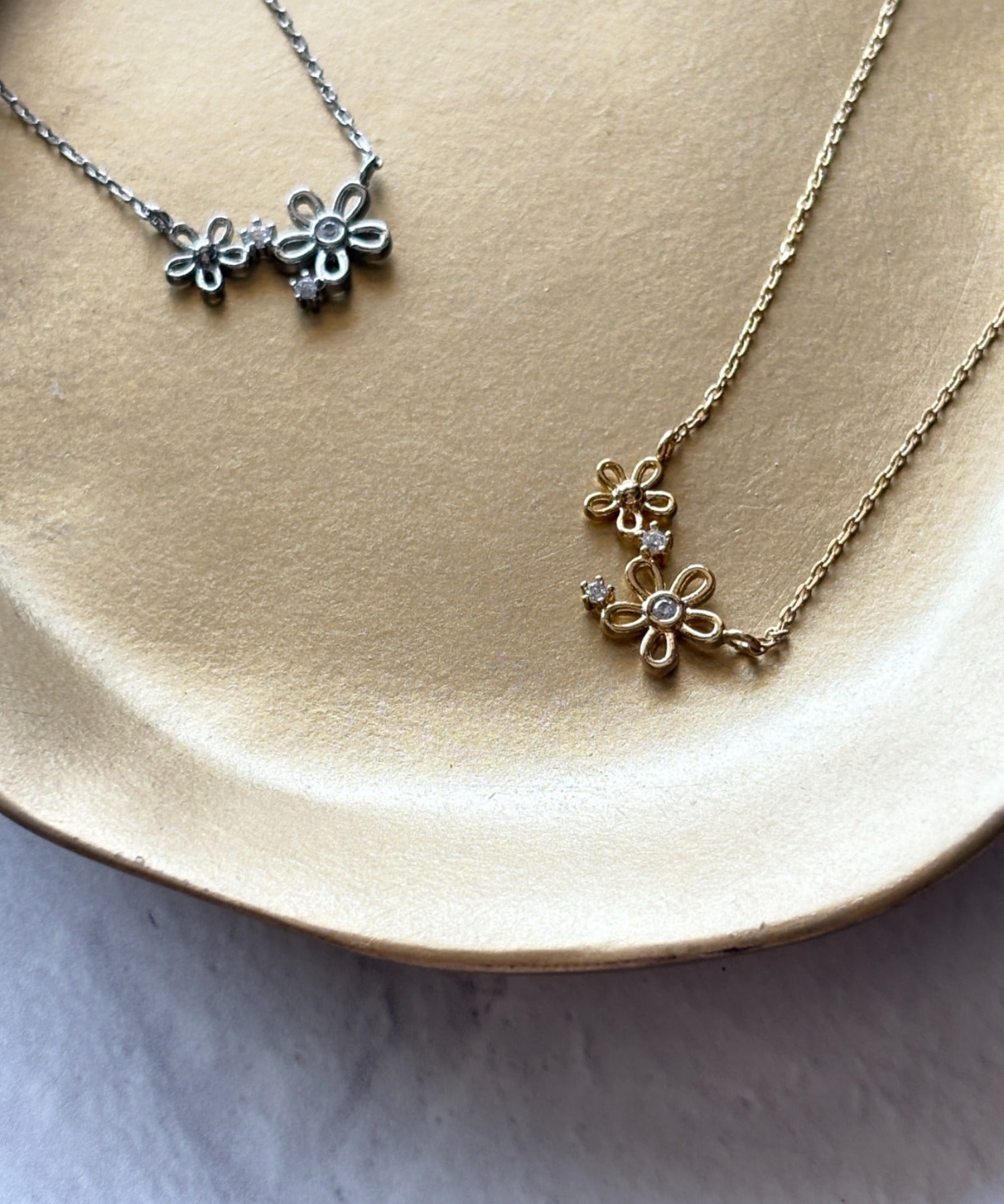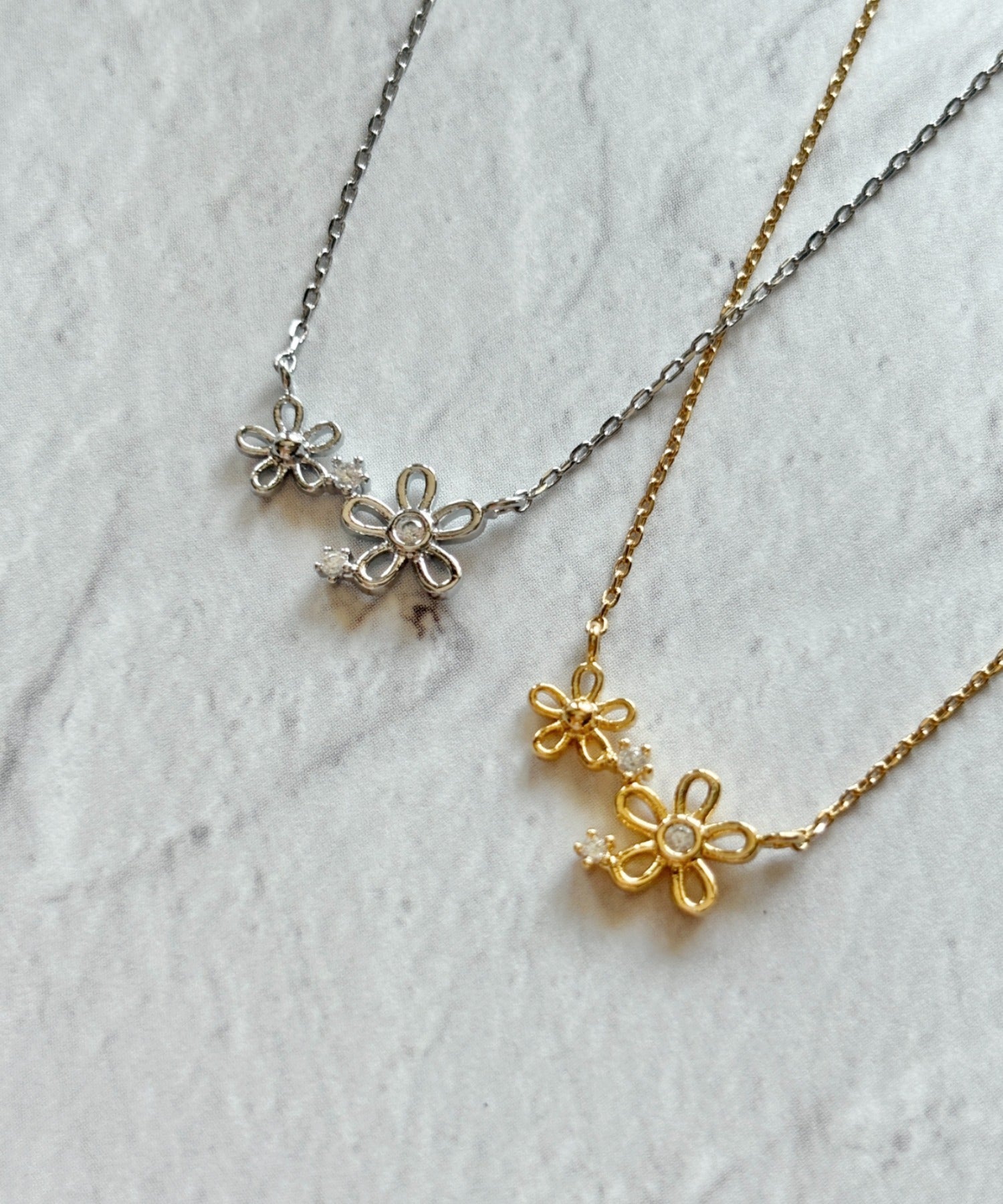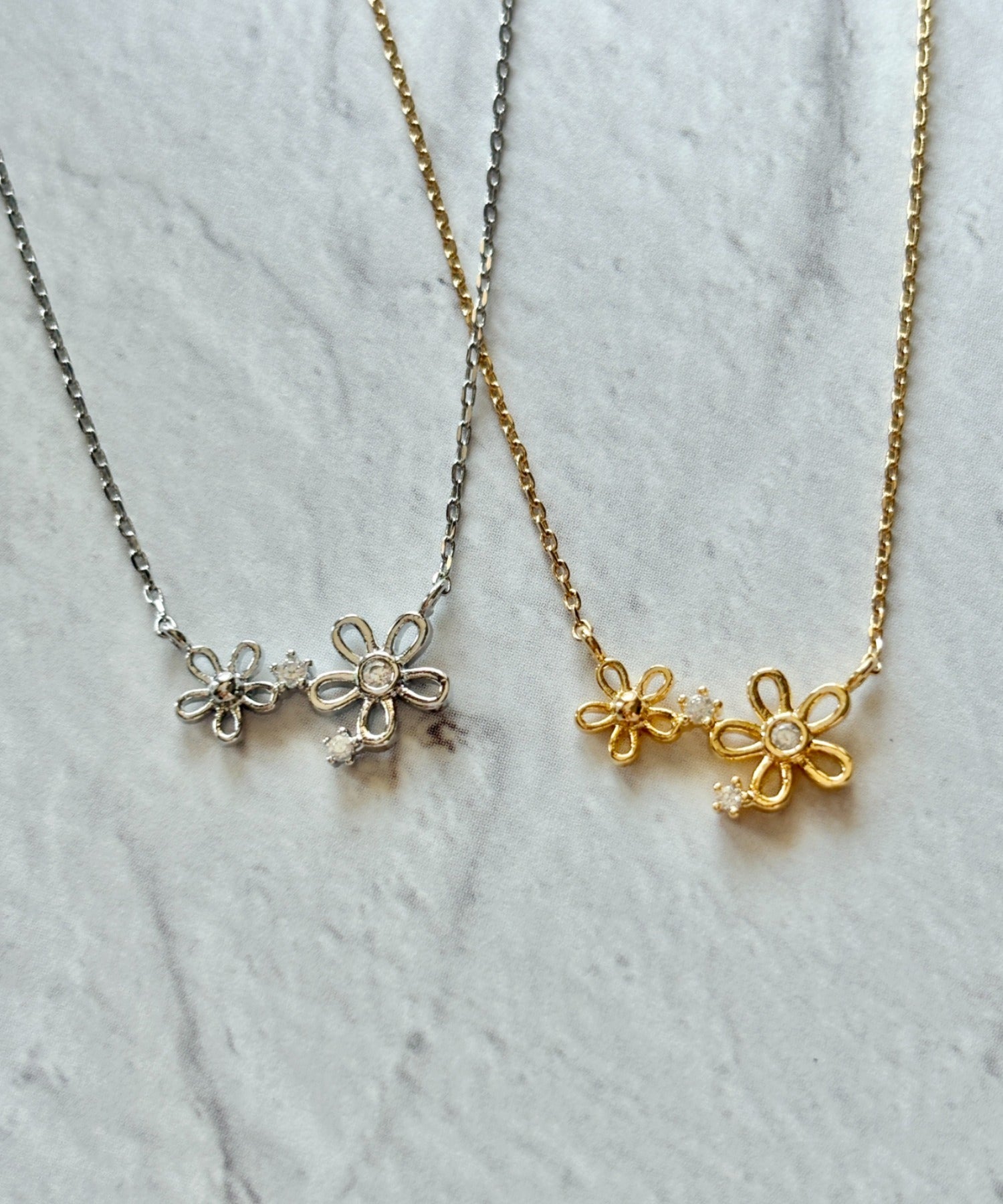 大きさの異なるフラワーモチーフを2つ組み合わせたデザインネックレス。