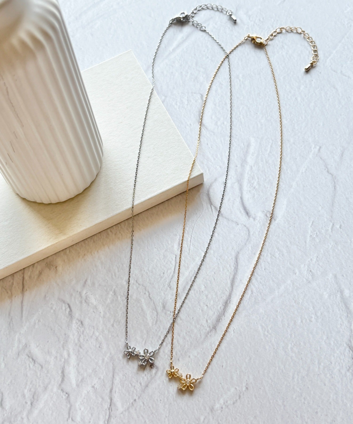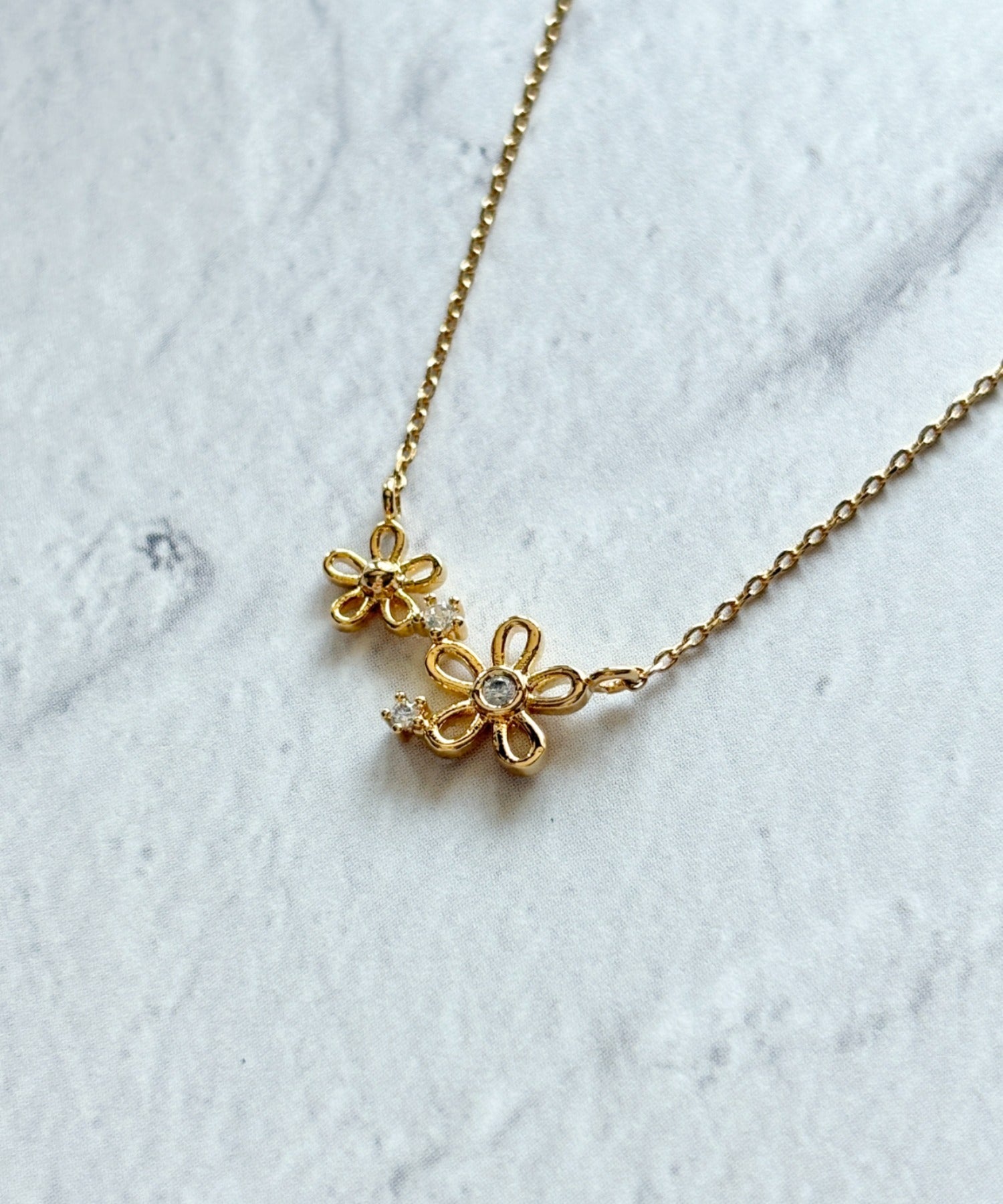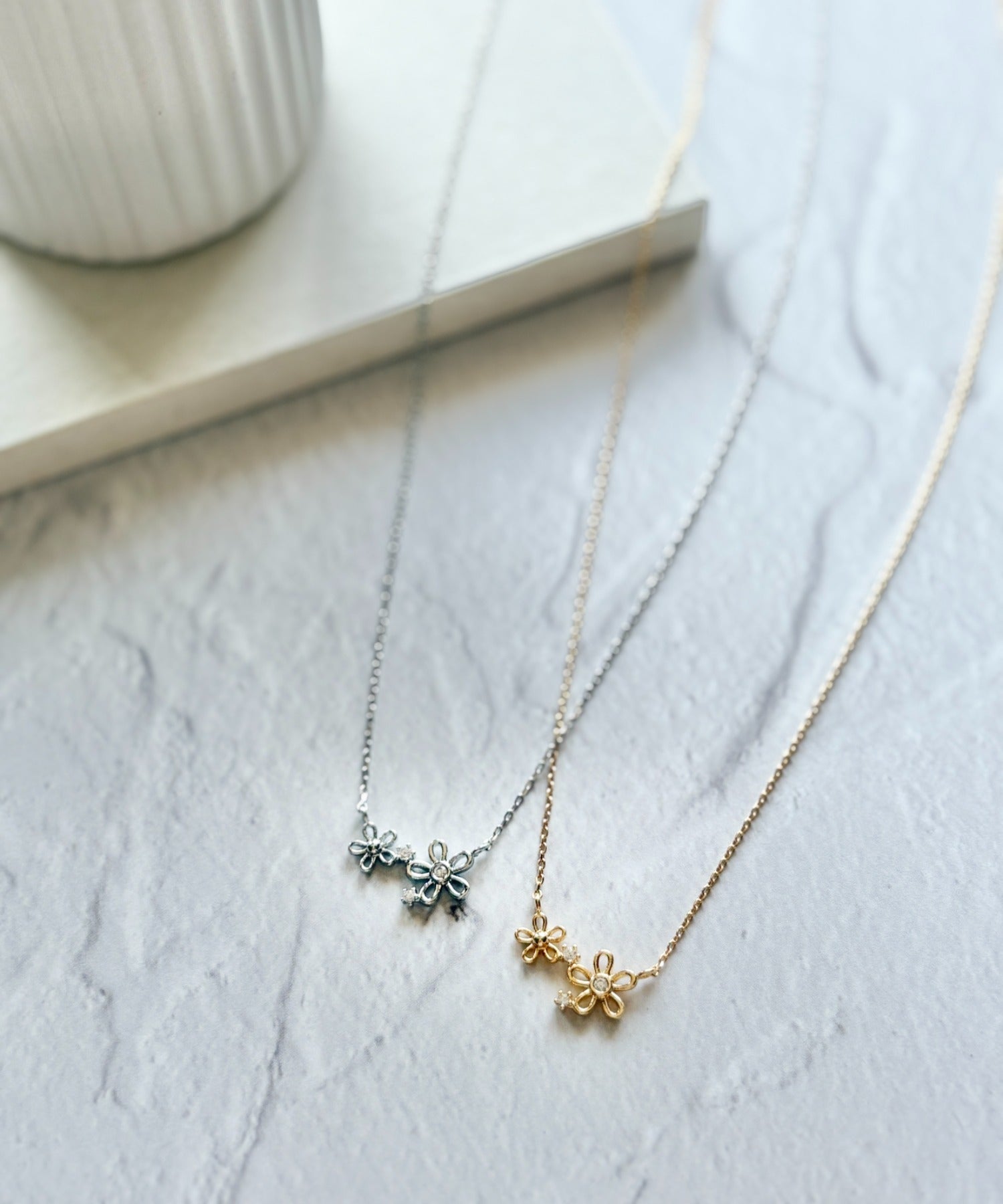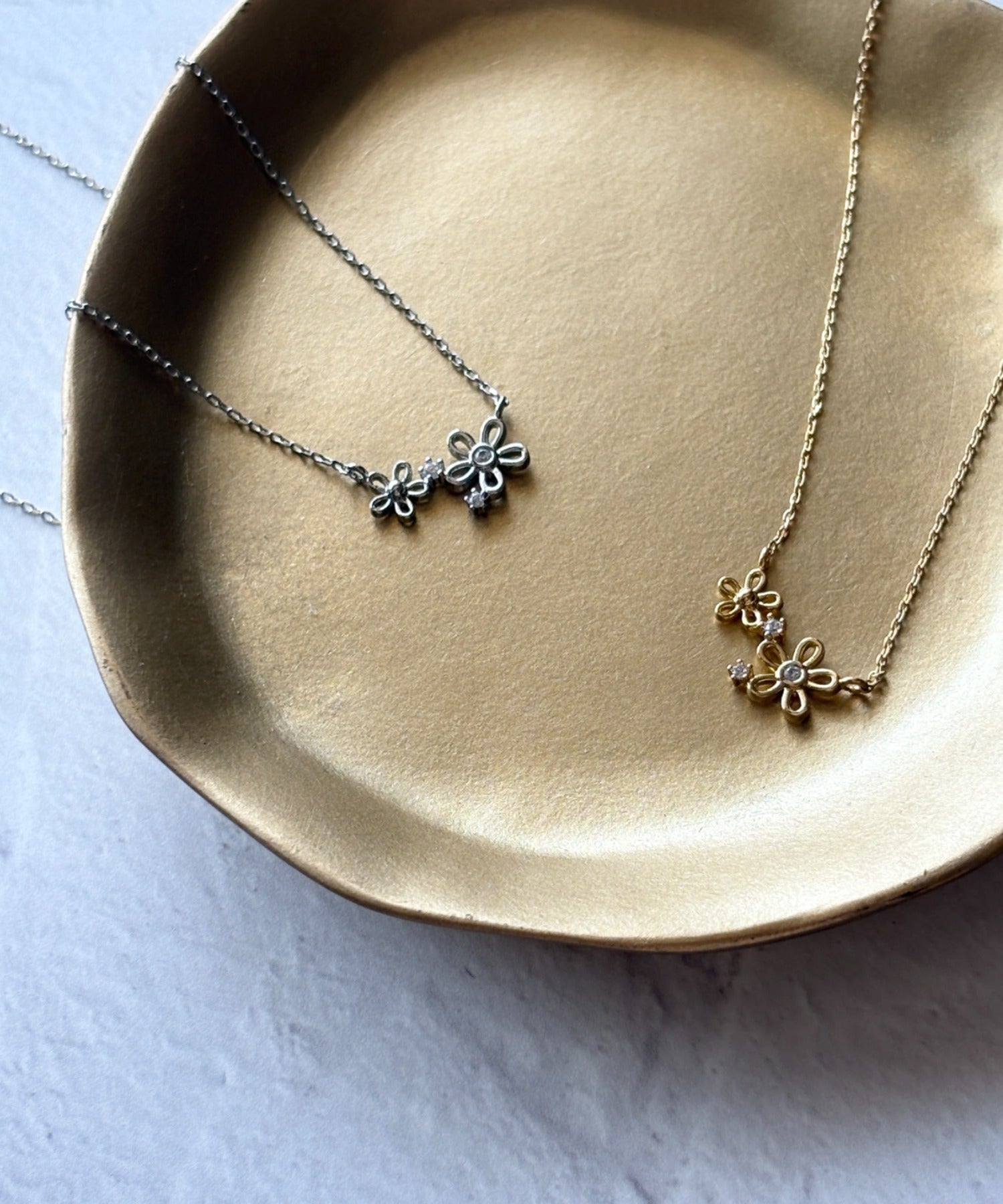 大きさの異なるフラワーモチーフを2つ組み合わせたデザインネックレス。