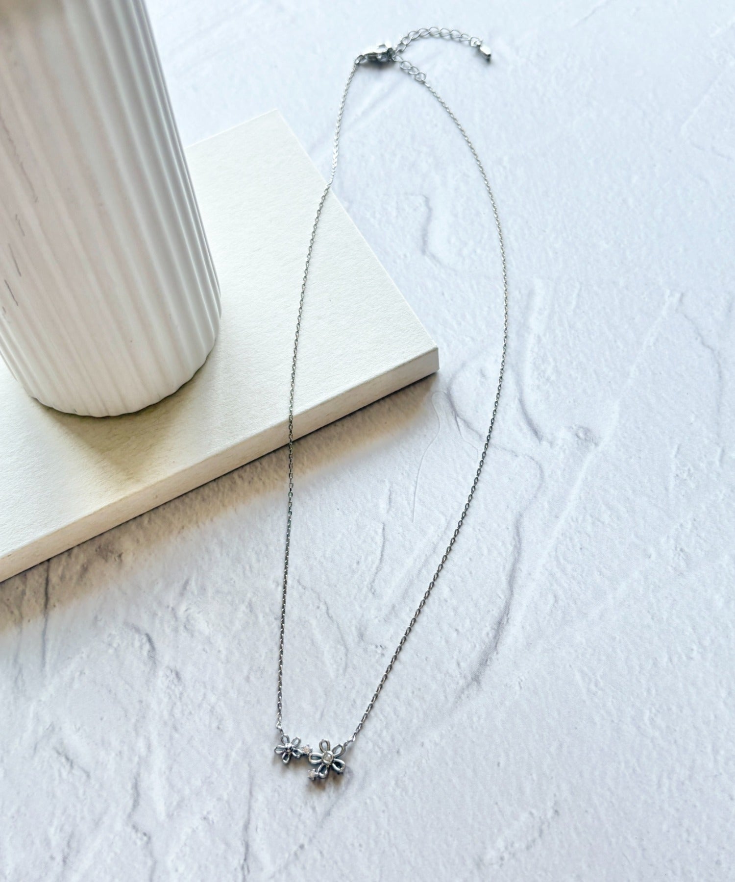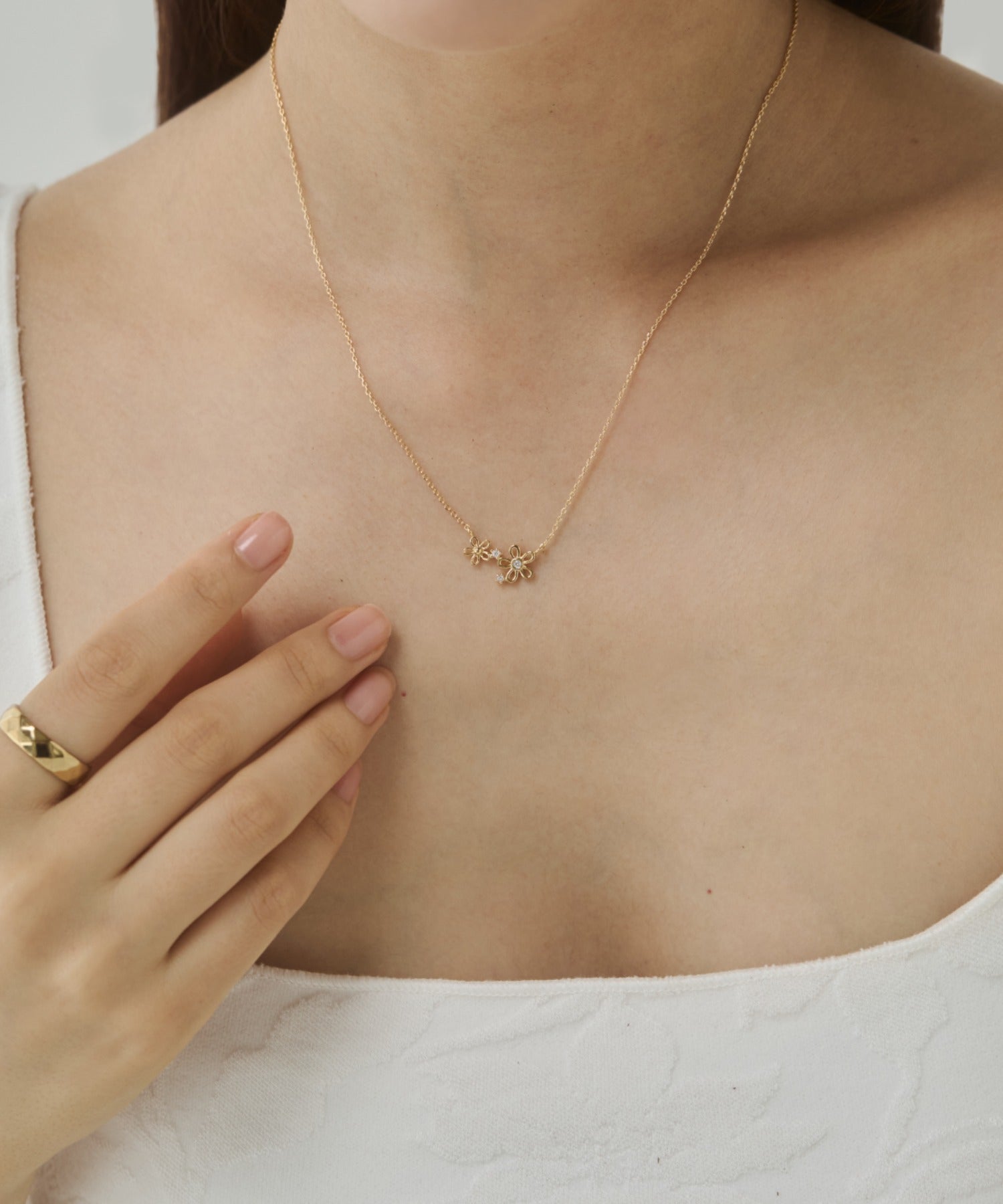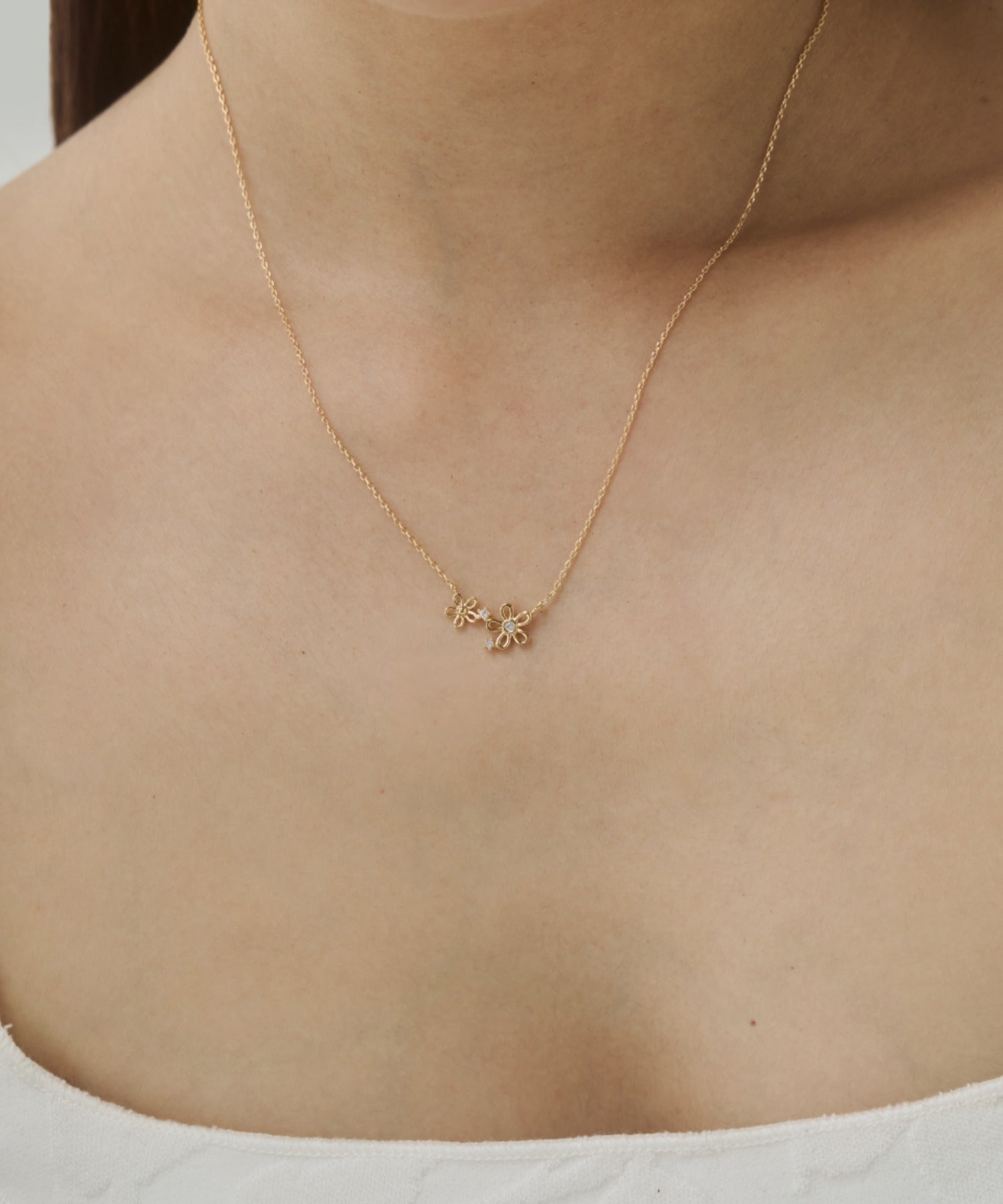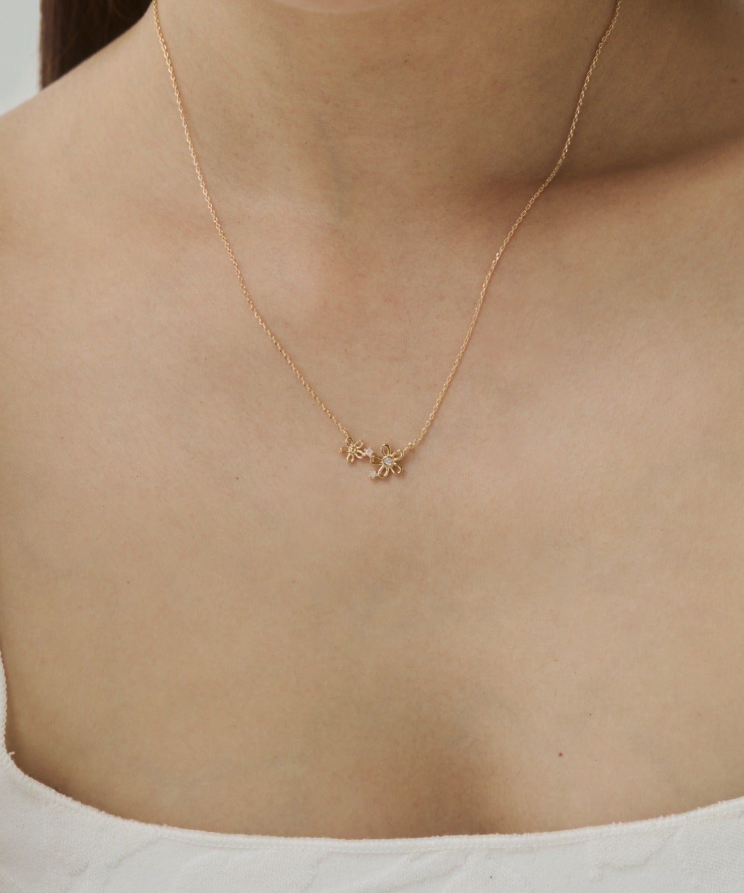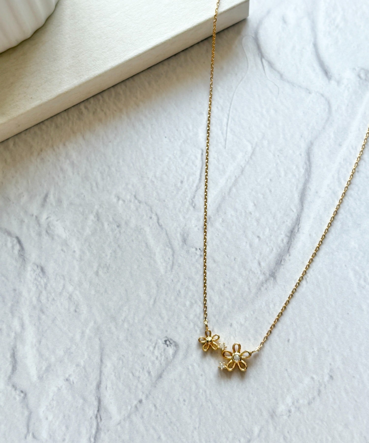 大きさの異なるフラワーモチーフを2つ組み合わせたデザインネックレス。