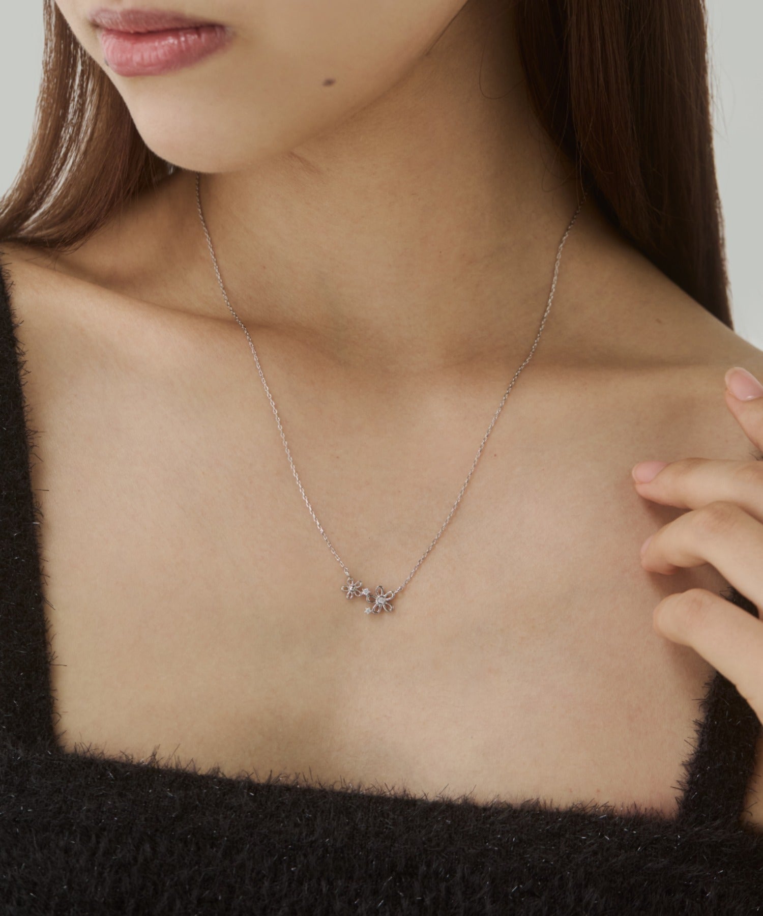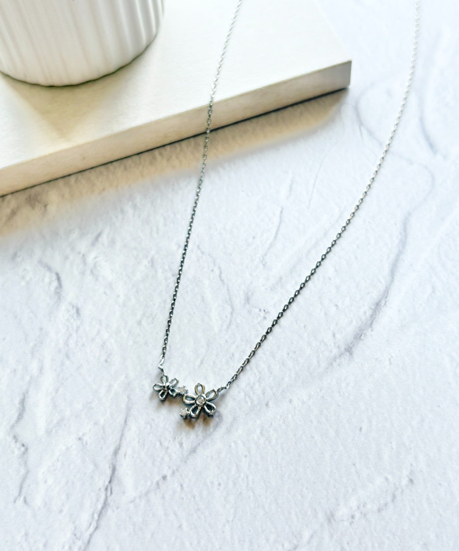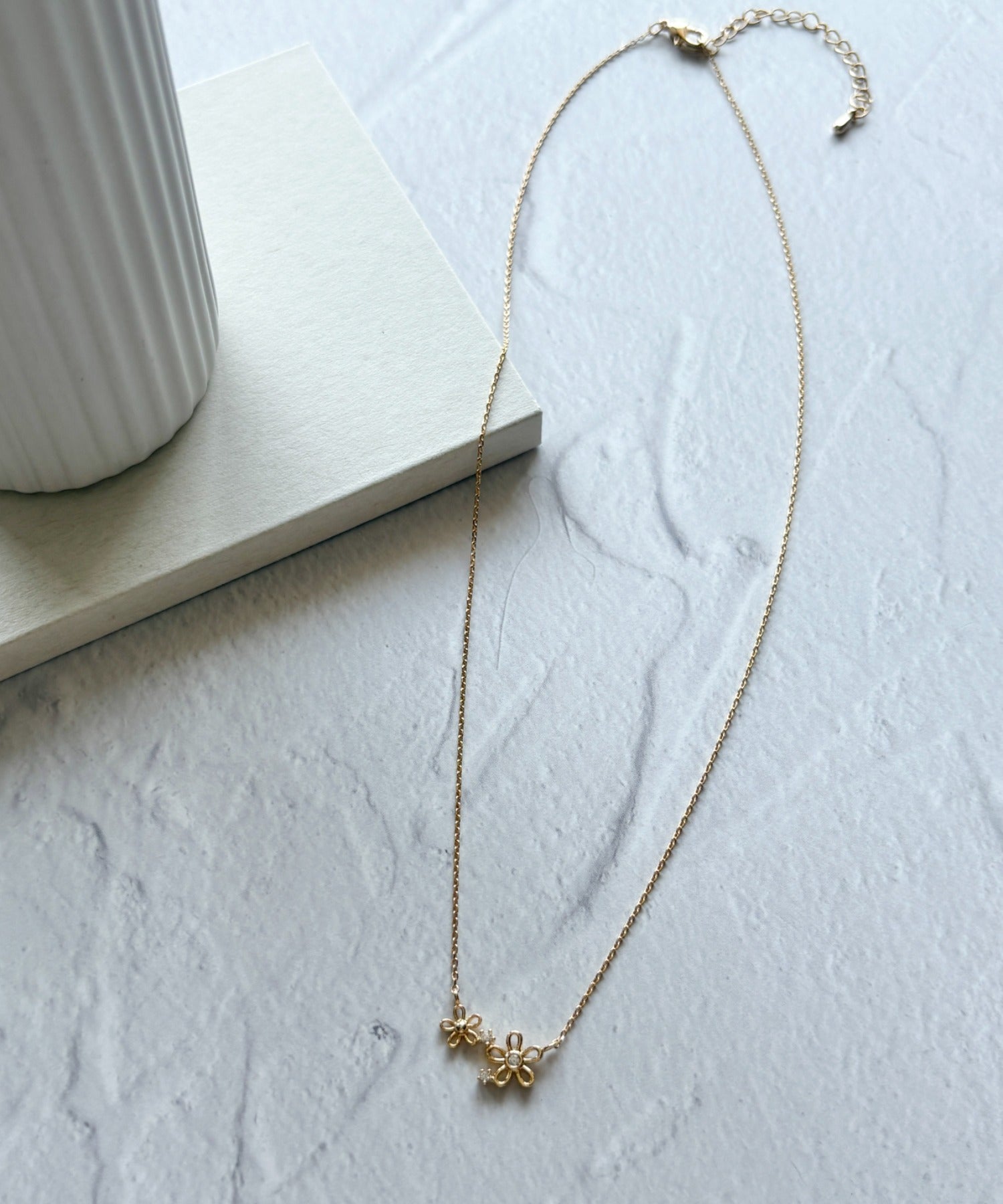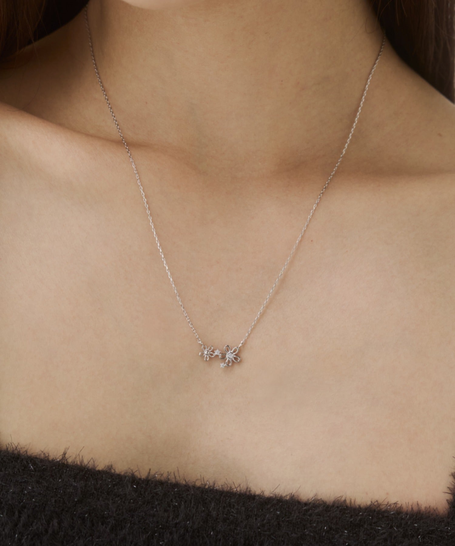 大きさの異なるフラワーモチーフを2つ組み合わせたデザインネックレス。