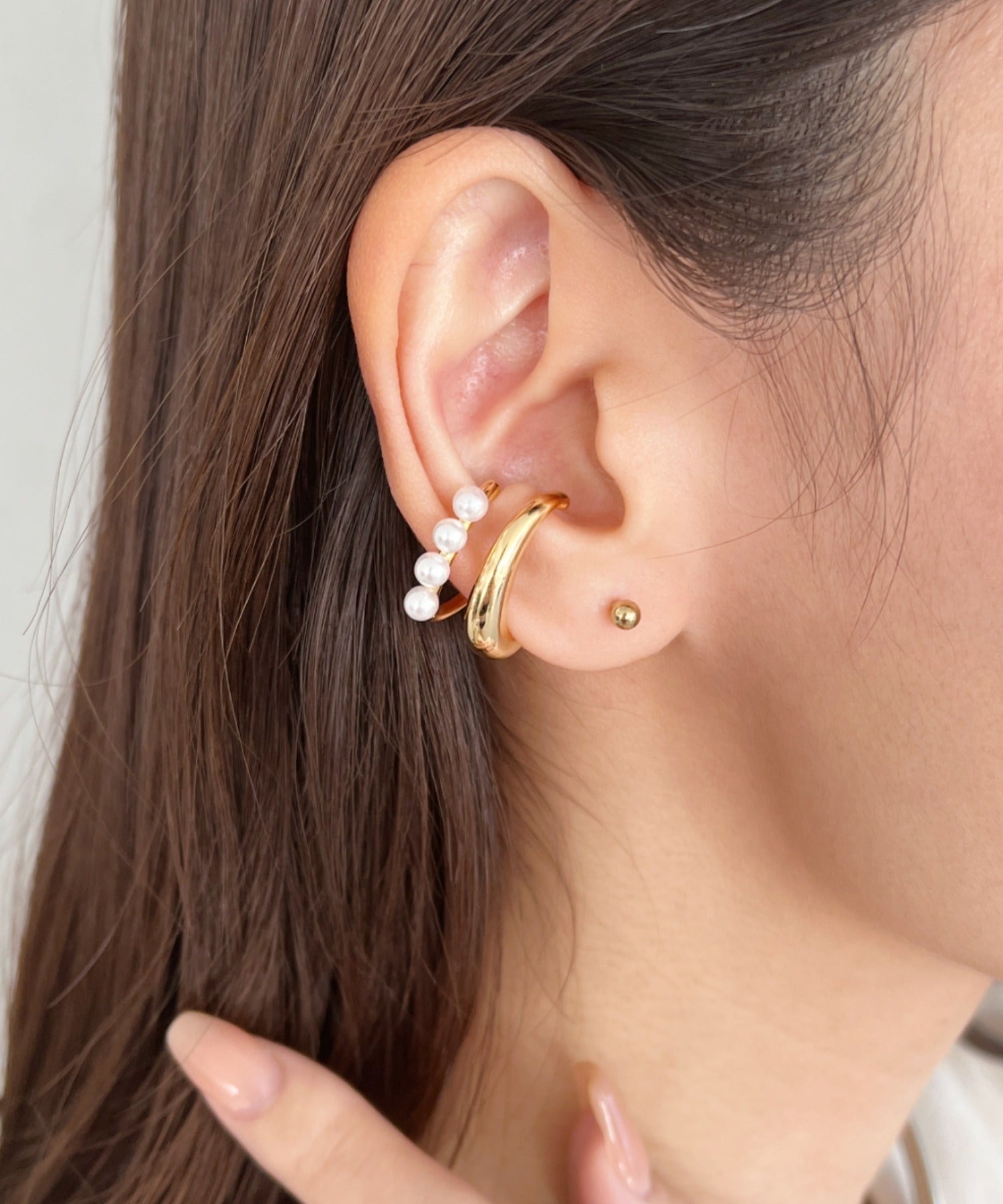 シンプルにイヤーカフを主役としたスタイルもおすすめ。