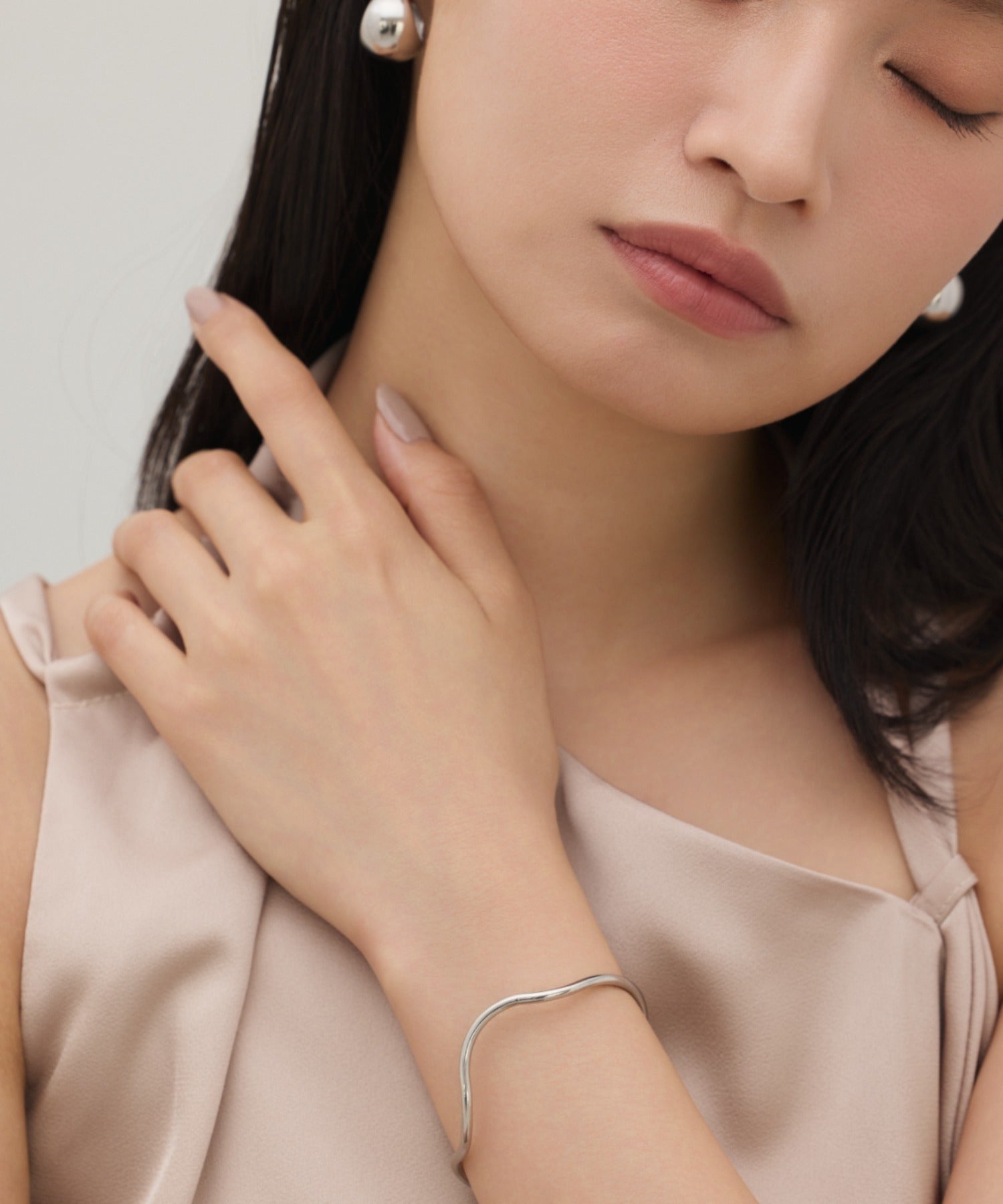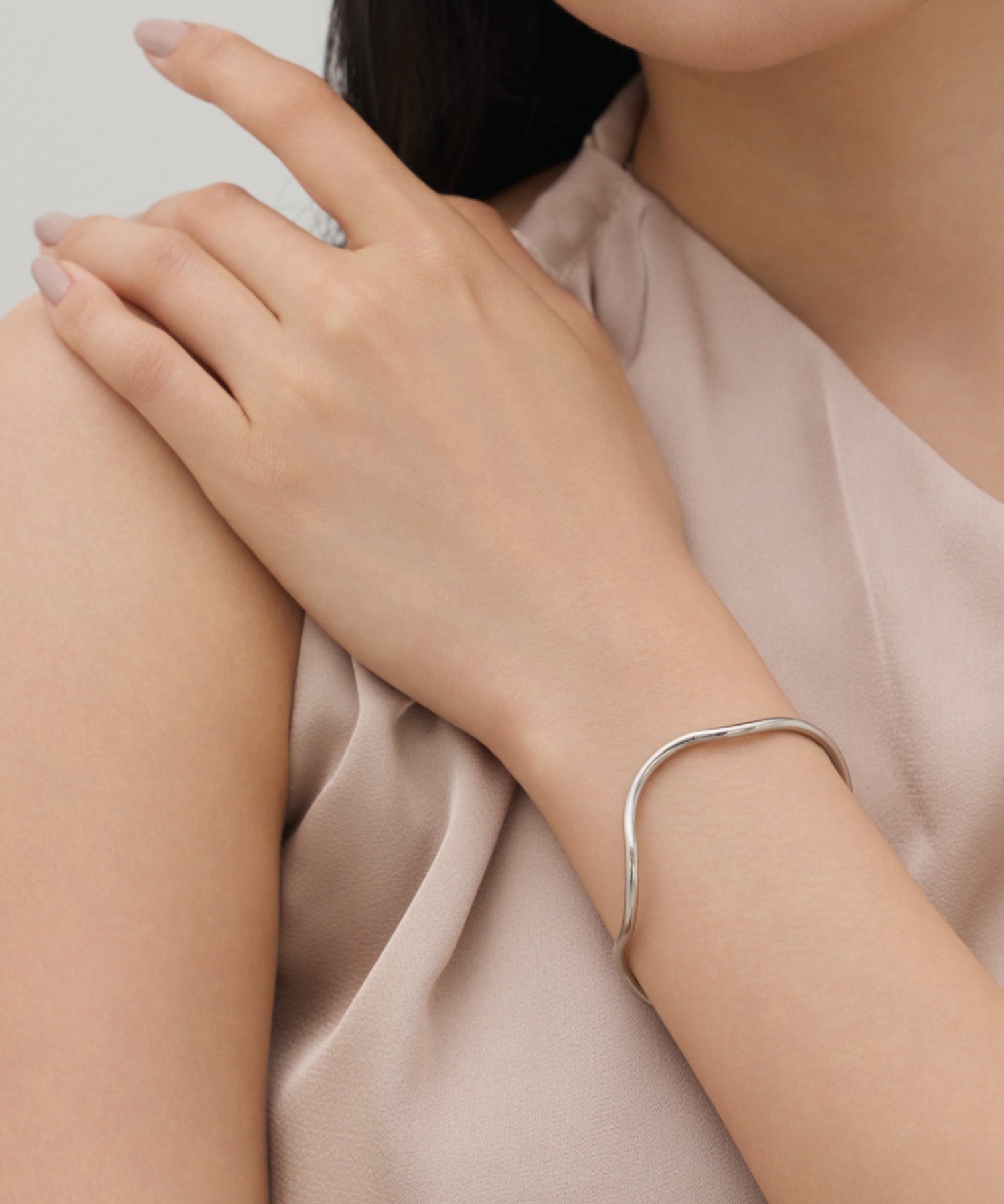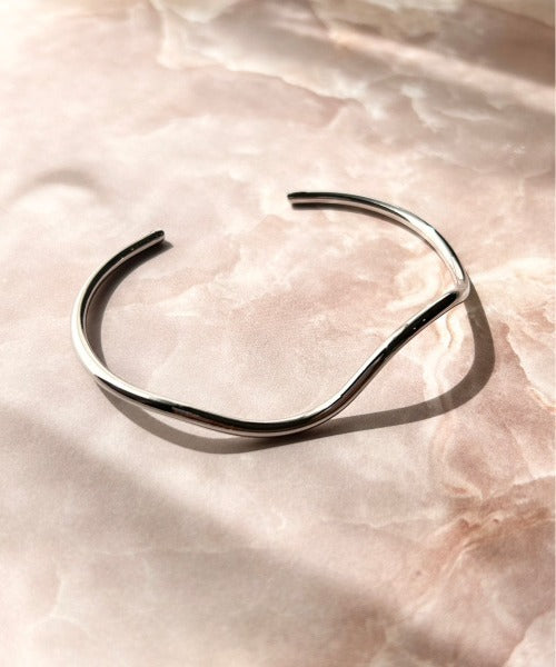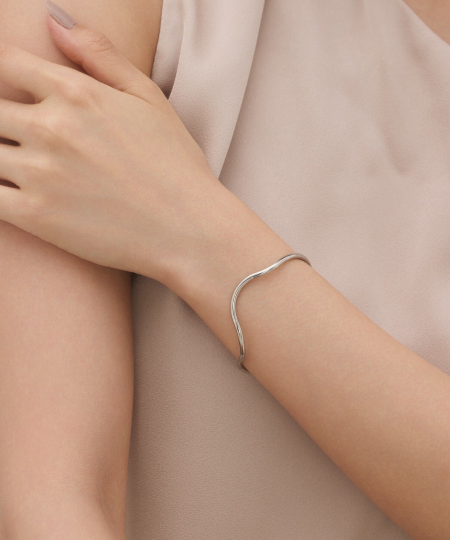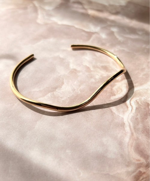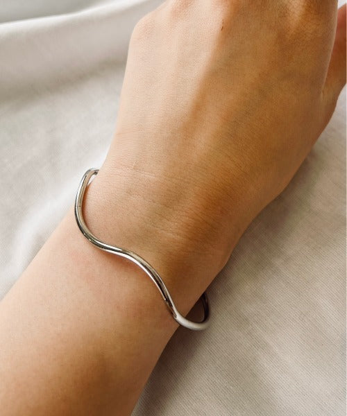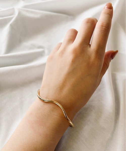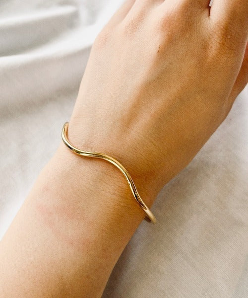 センターのウェーブラインの程よいニュアンス感と華奢なデザインは女性らしく何にでも合わせやすい万能バングル。