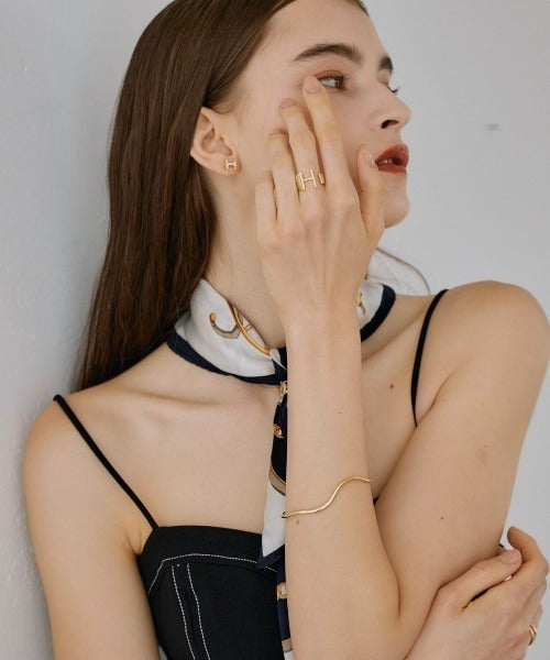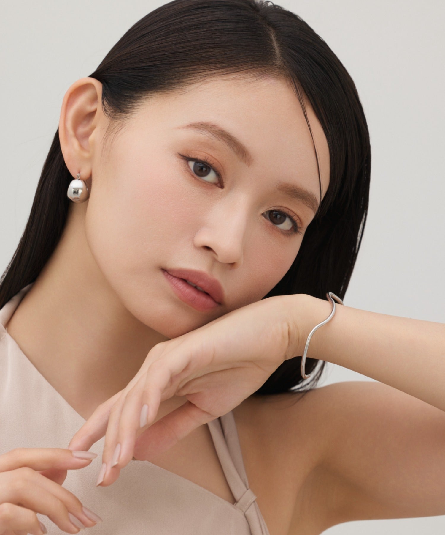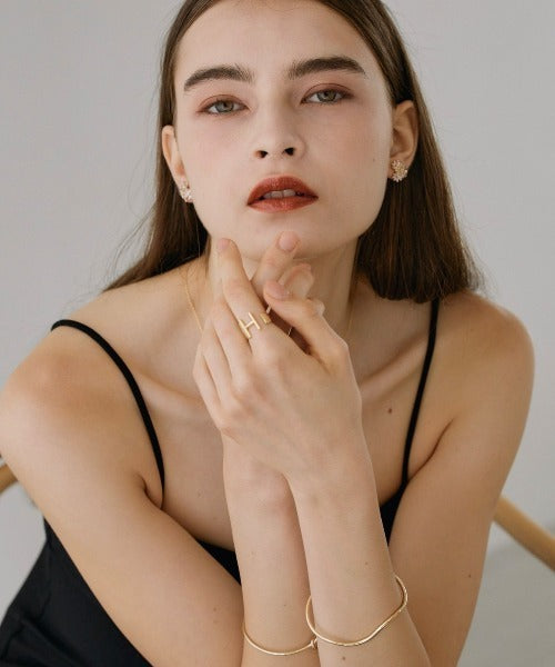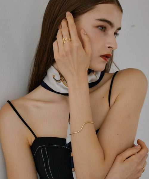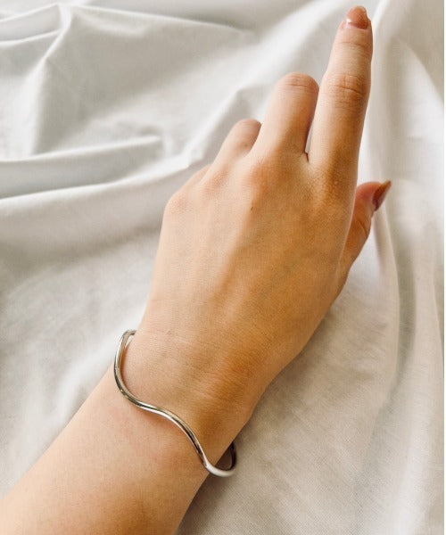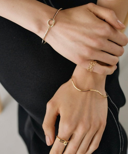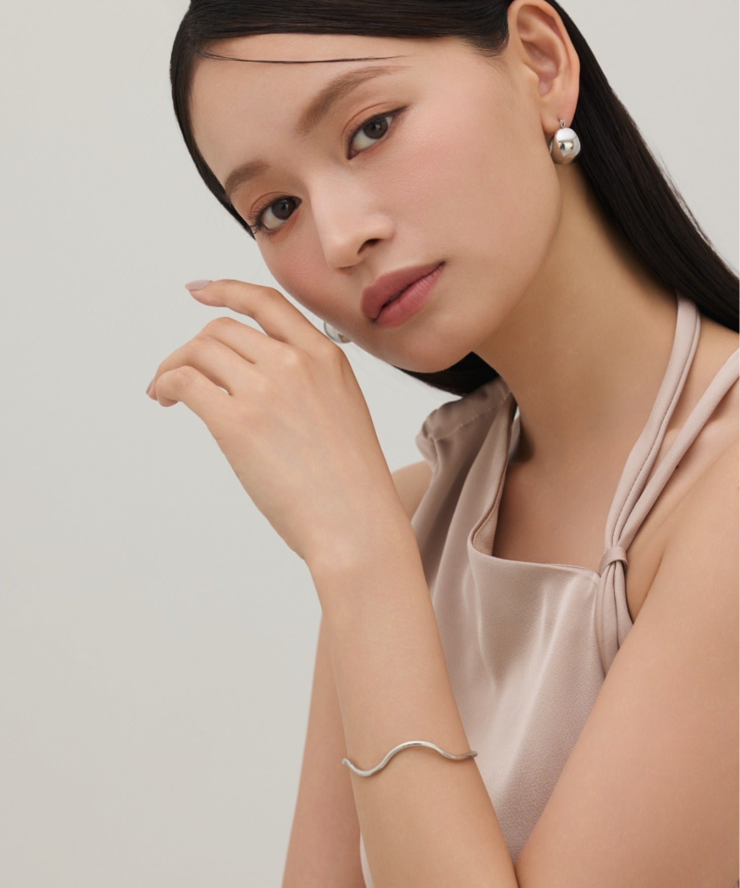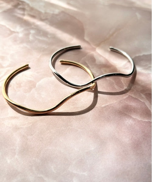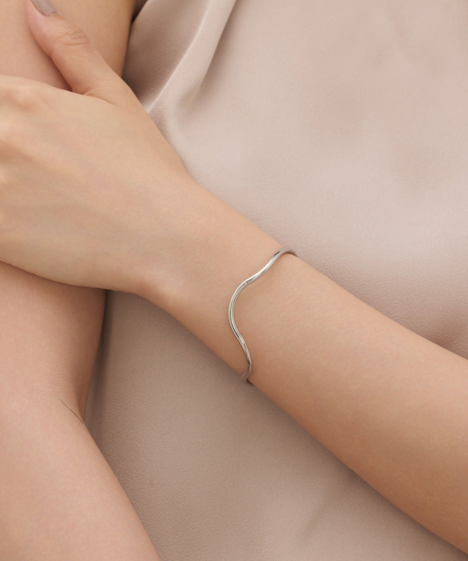 センターのウェーブラインの程よいニュアンス感と華奢なデザインは女性らしく何にでも合わせやすい万能バングル。