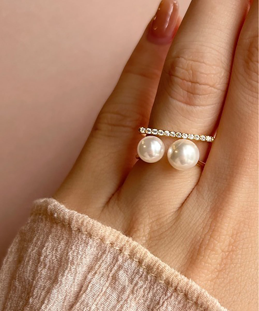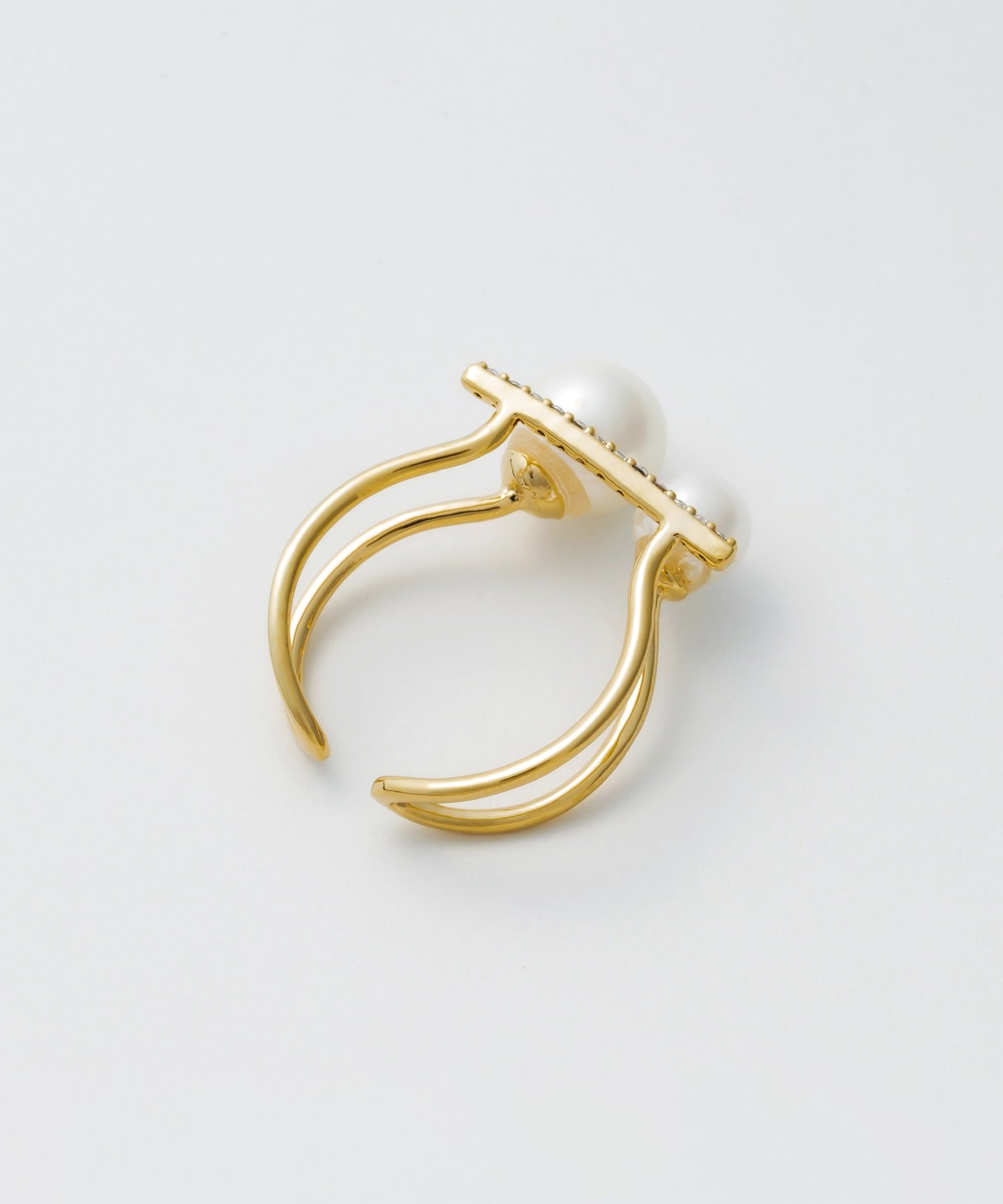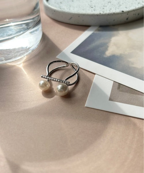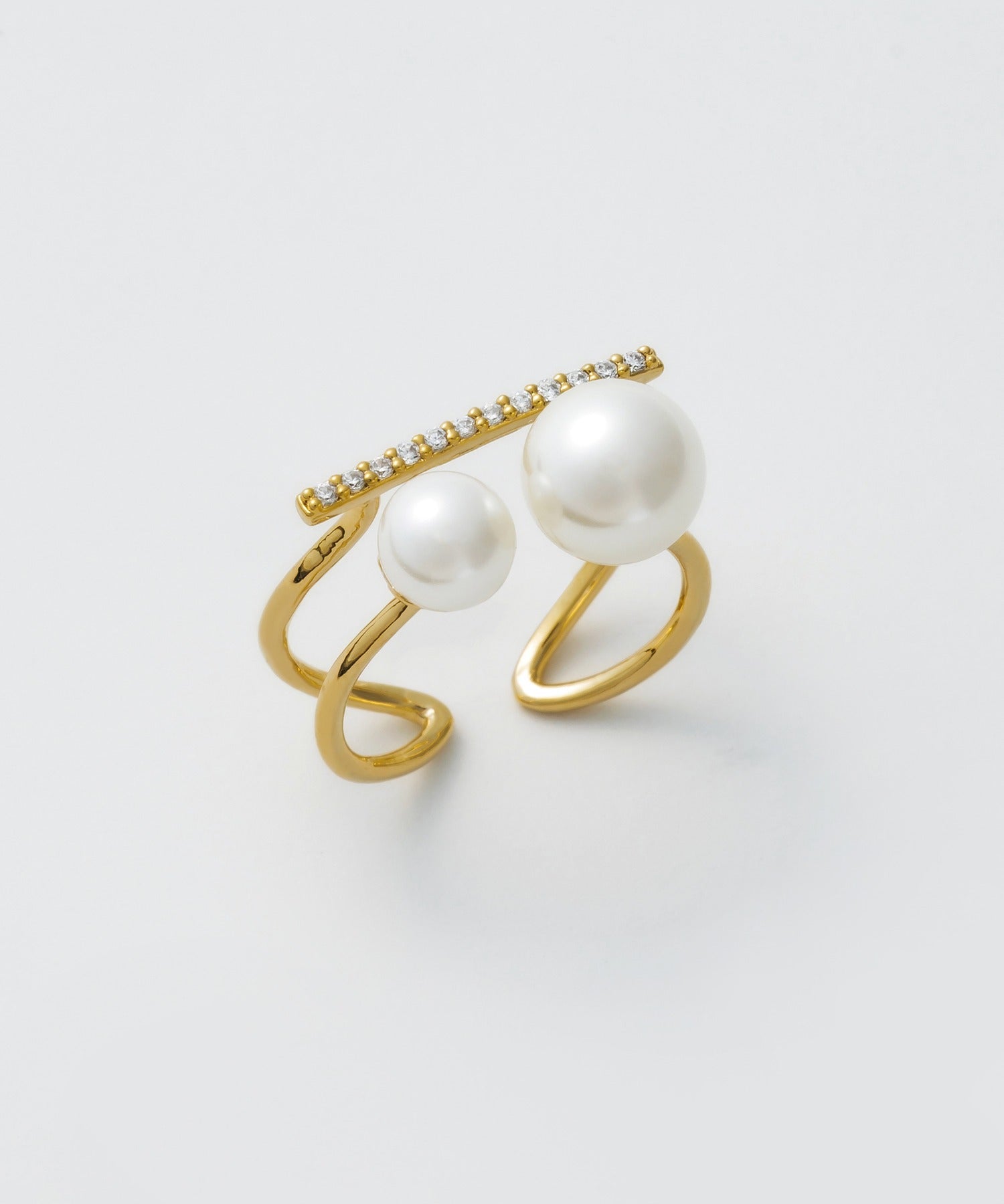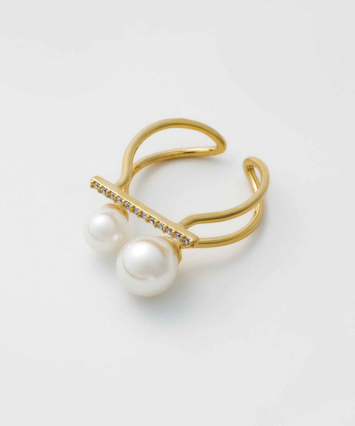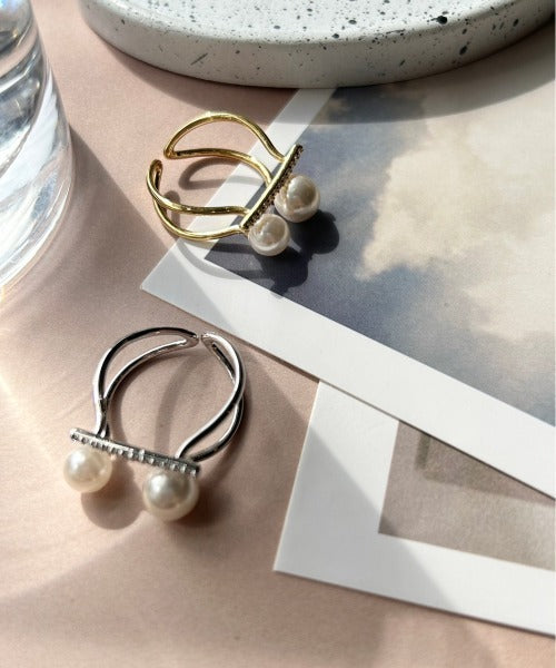 ダブルパールがアクセントになった美しいビジューリング。繊細で個性的な湾曲したモチーフは上品でモダンな雰囲気を引き立てます。