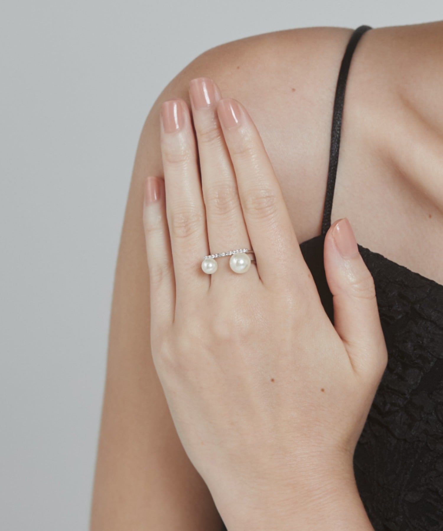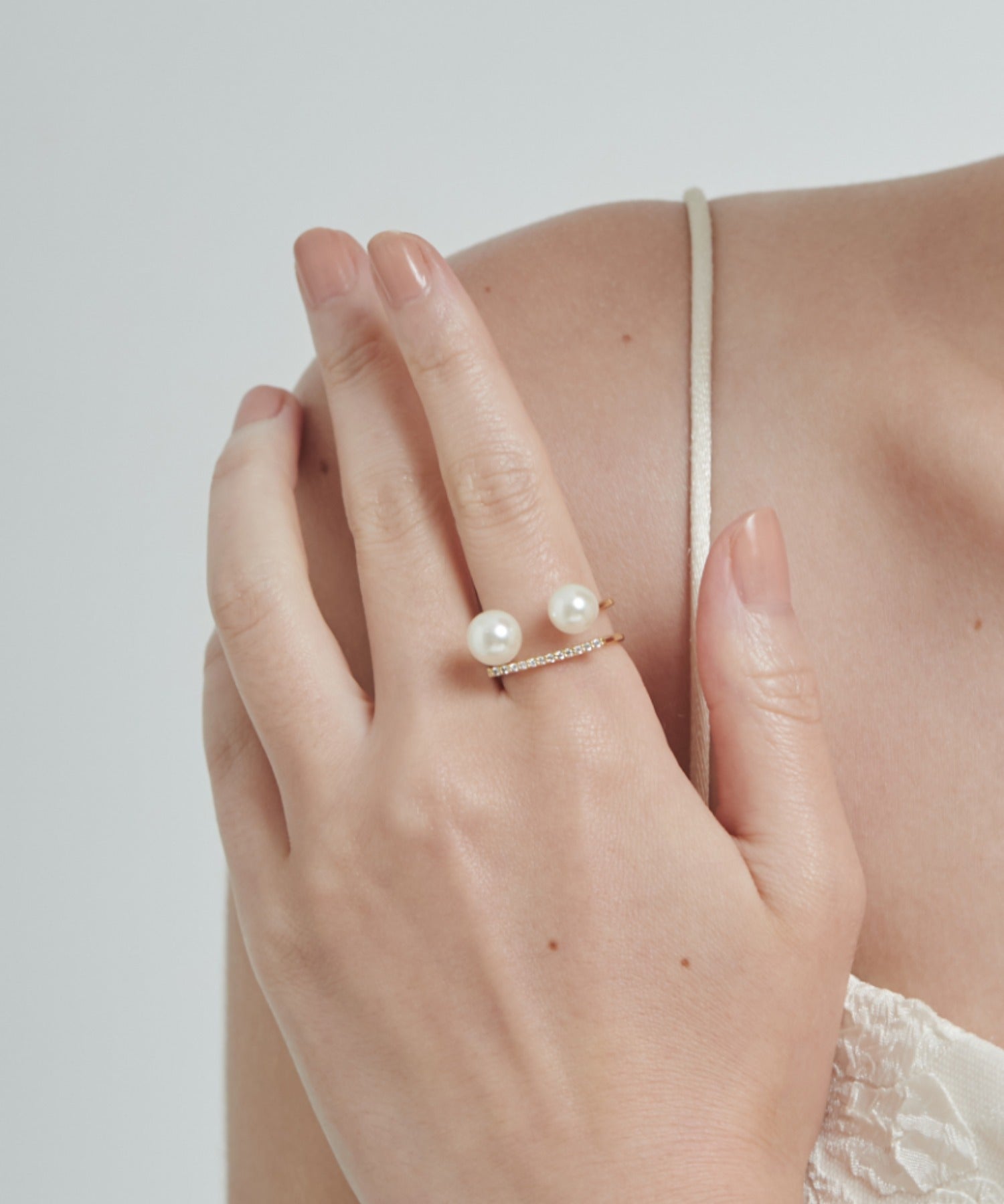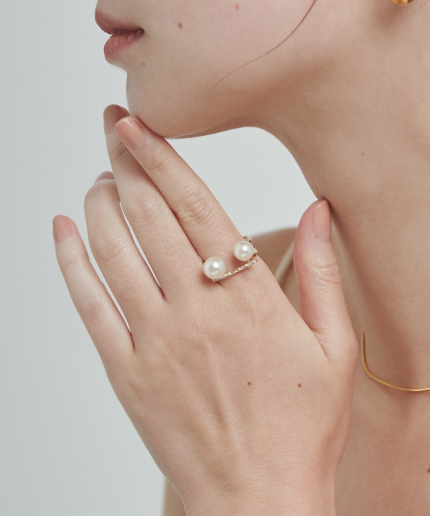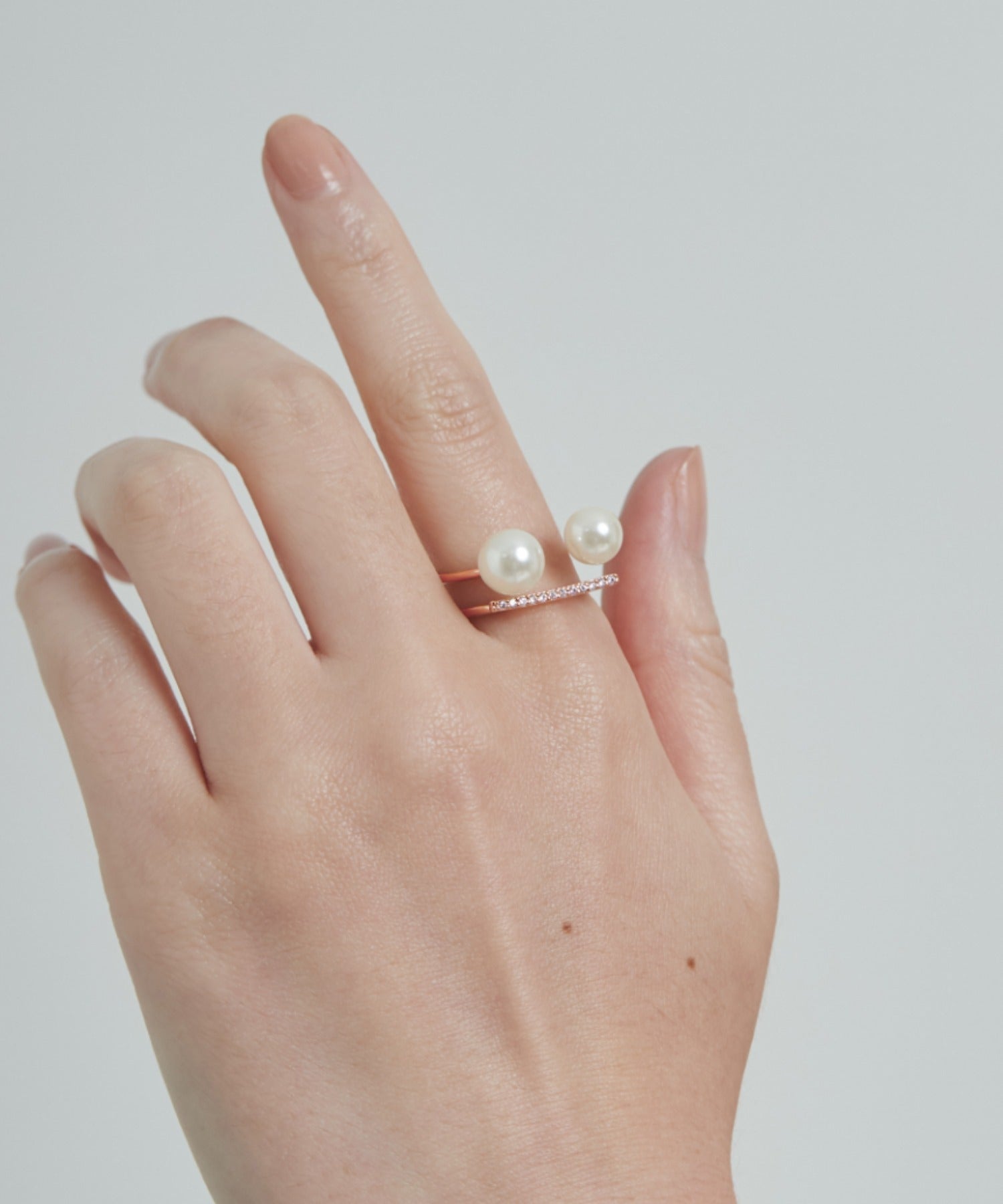 ダブルパールがアクセントになった美しいビジューリング。繊細で個性的な湾曲したモチーフは上品でモダンな雰囲気を引き立てます。