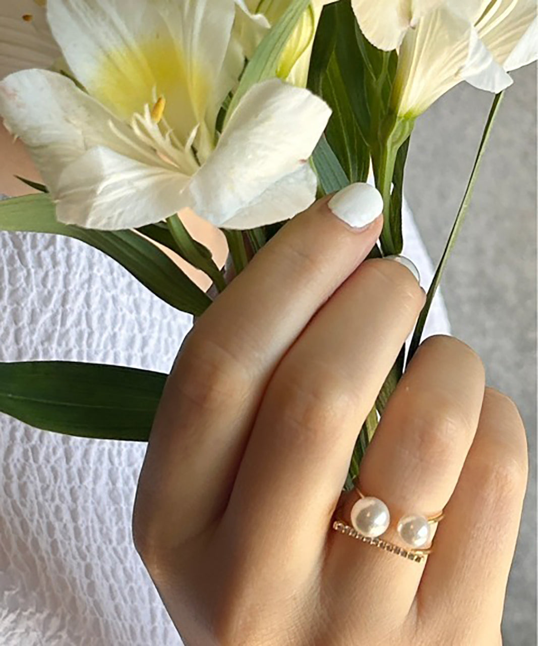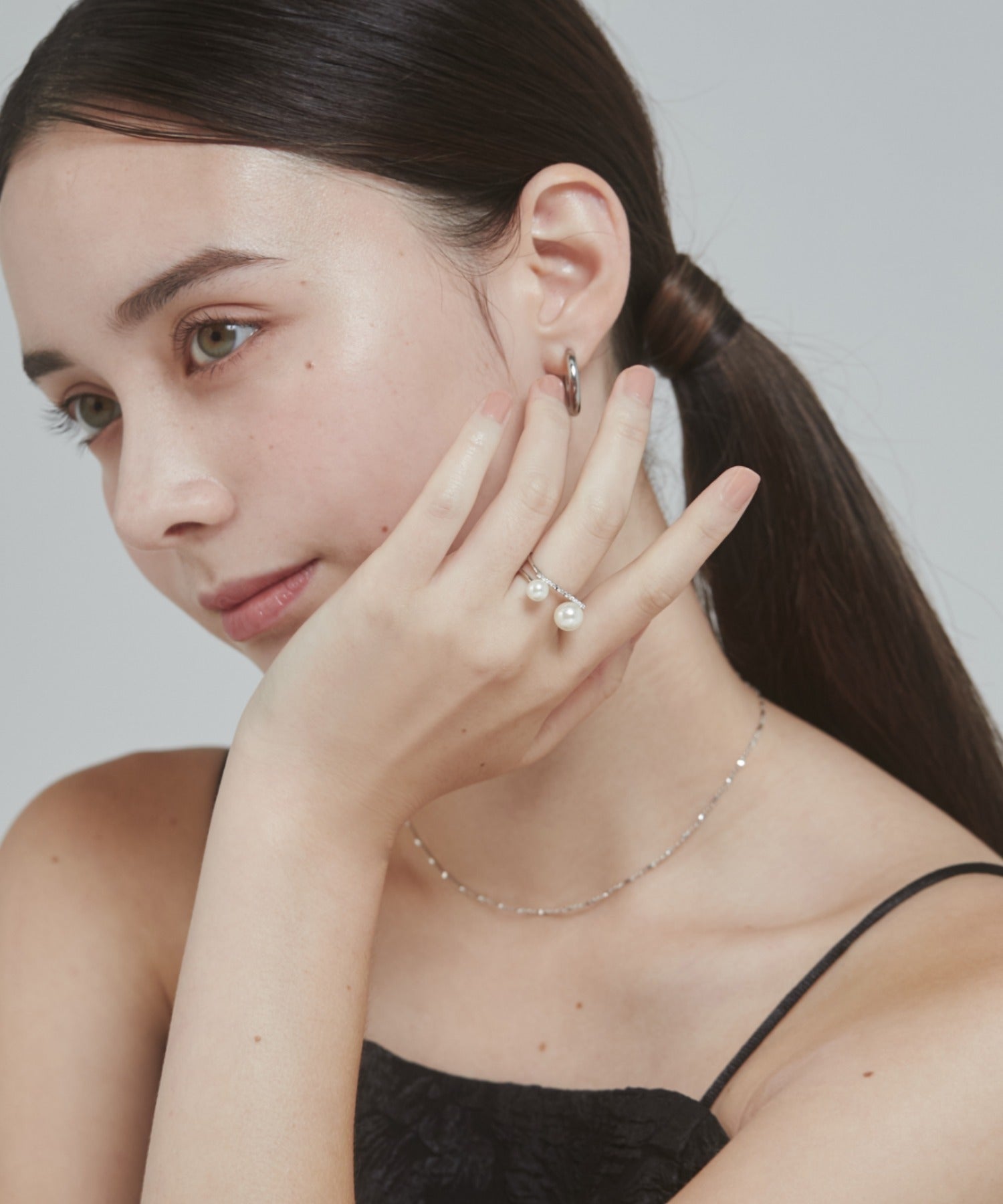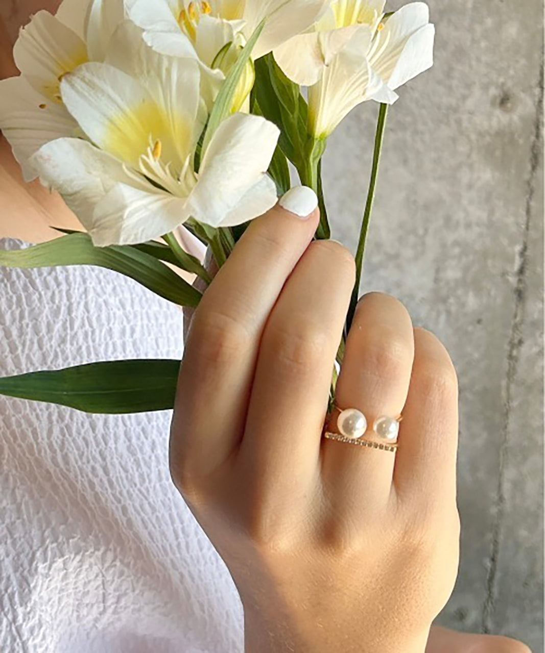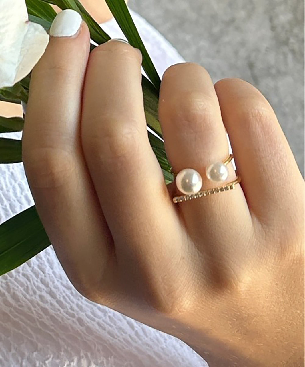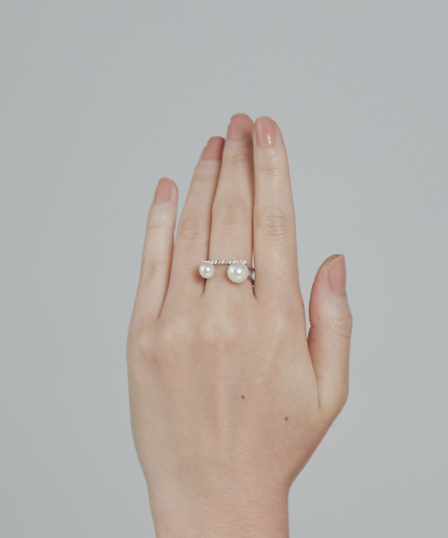 ダブルパールがアクセントになった美しいビジューリング。繊細で個性的な湾曲したモチーフは上品でモダンな雰囲気を引き立てます。