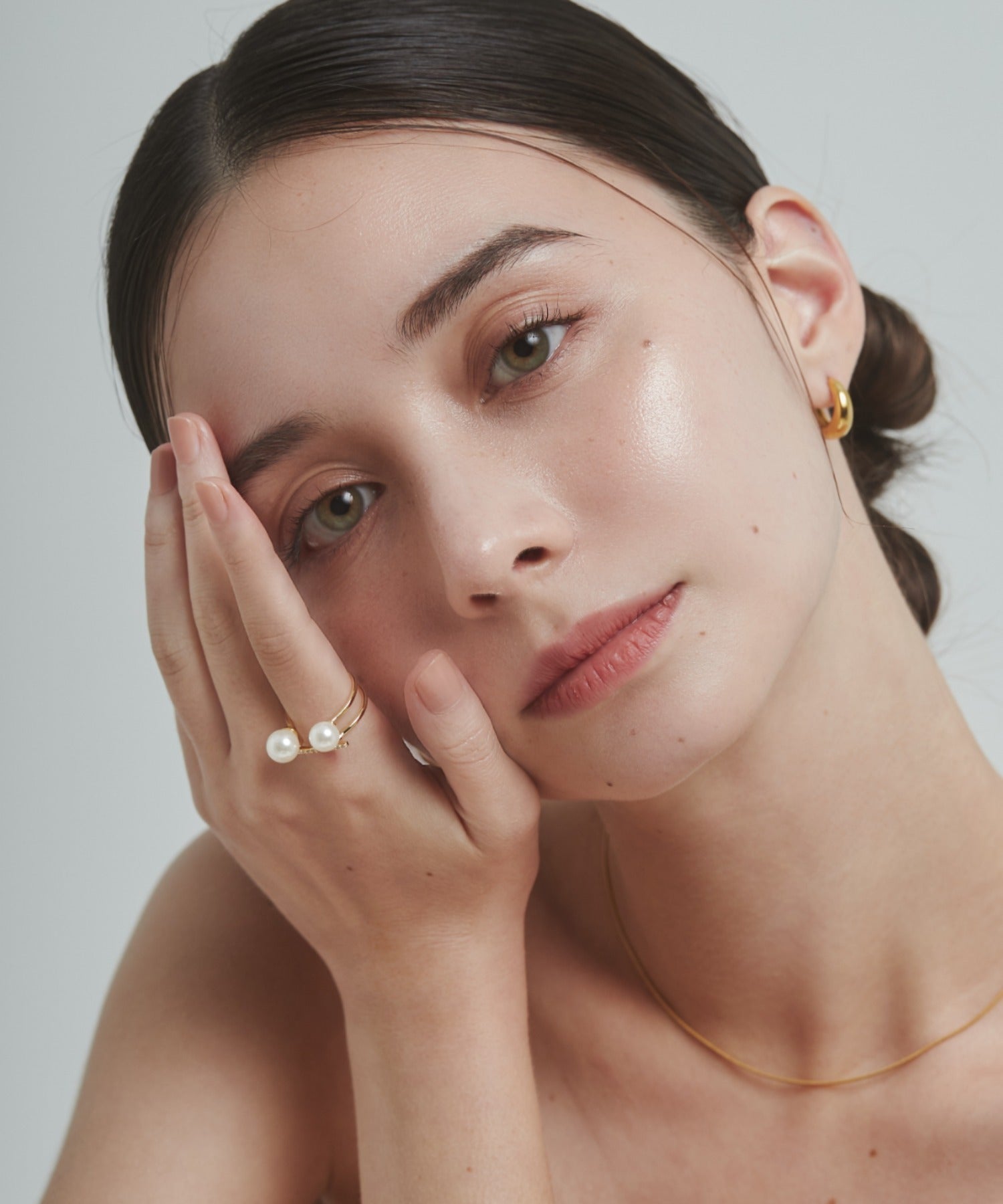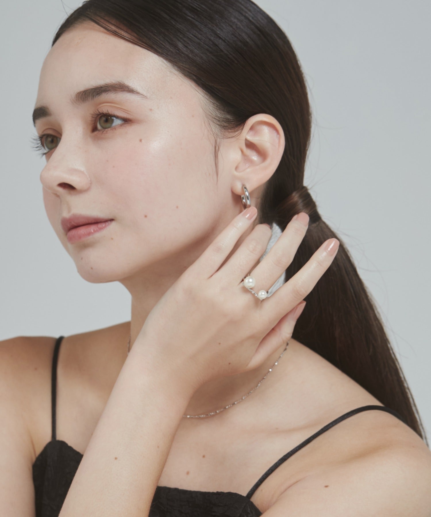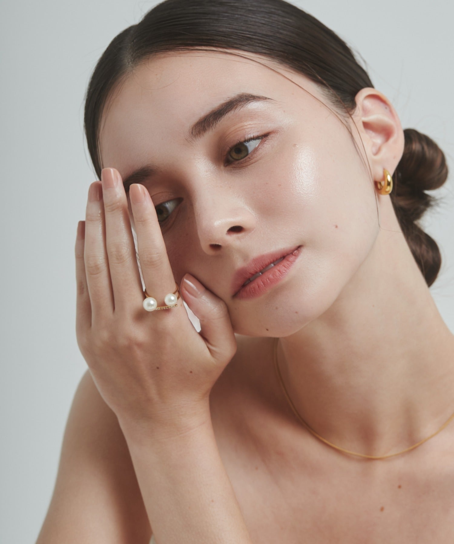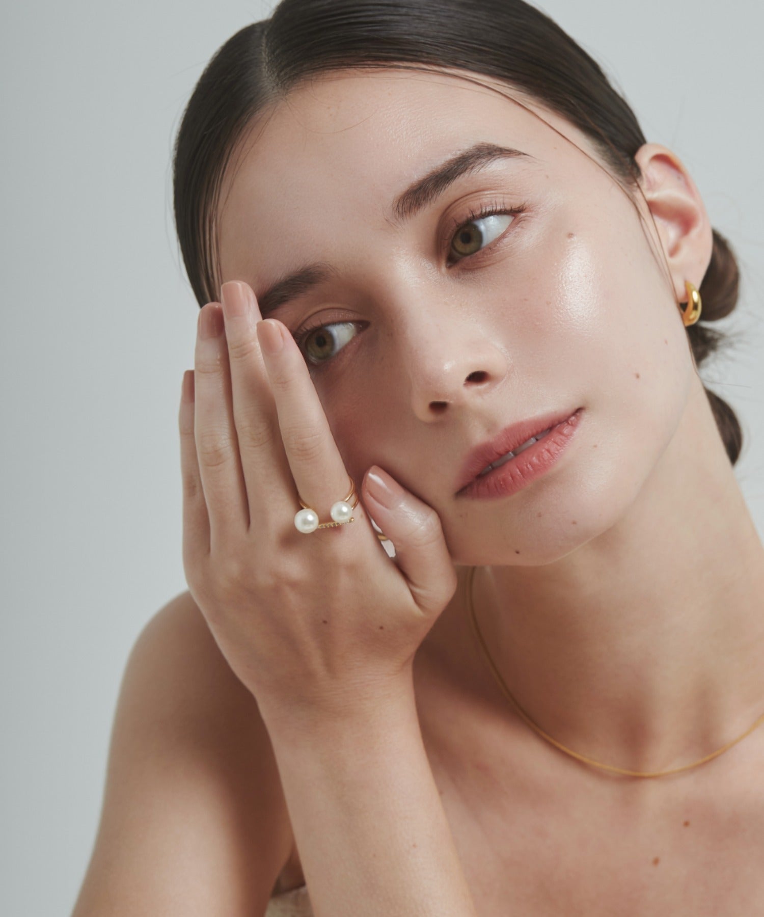 ダブルパールがアクセントになった美しいビジューリング。繊細で個性的な湾曲したモチーフは上品でモダンな雰囲気を引き立てます。