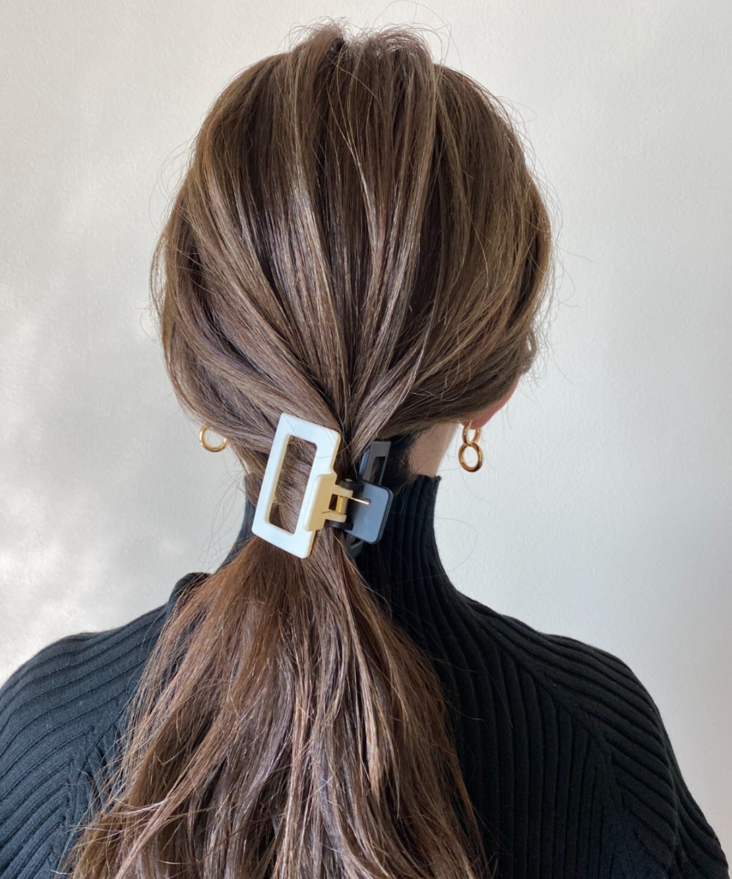 コンパクトなスクエア形がヘアスタイルに馴染みやすいヘアクリップ。